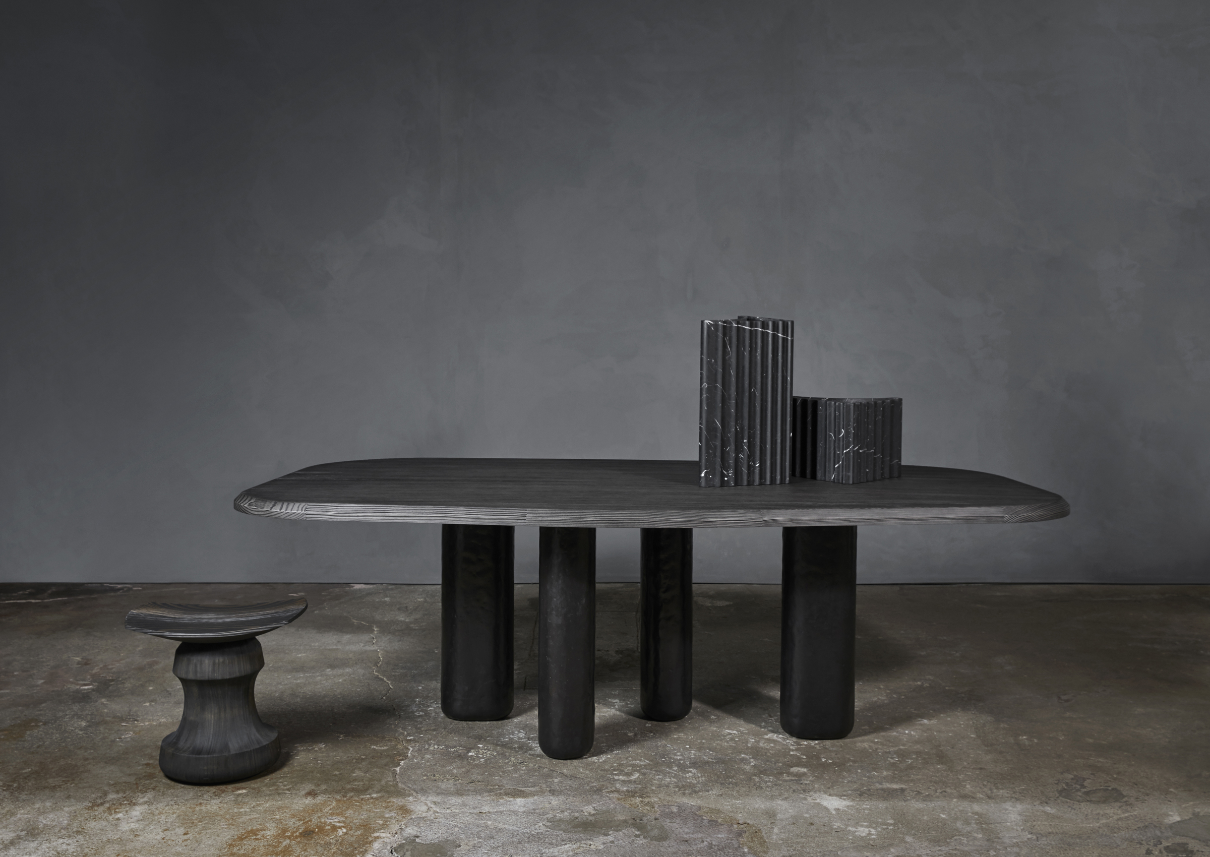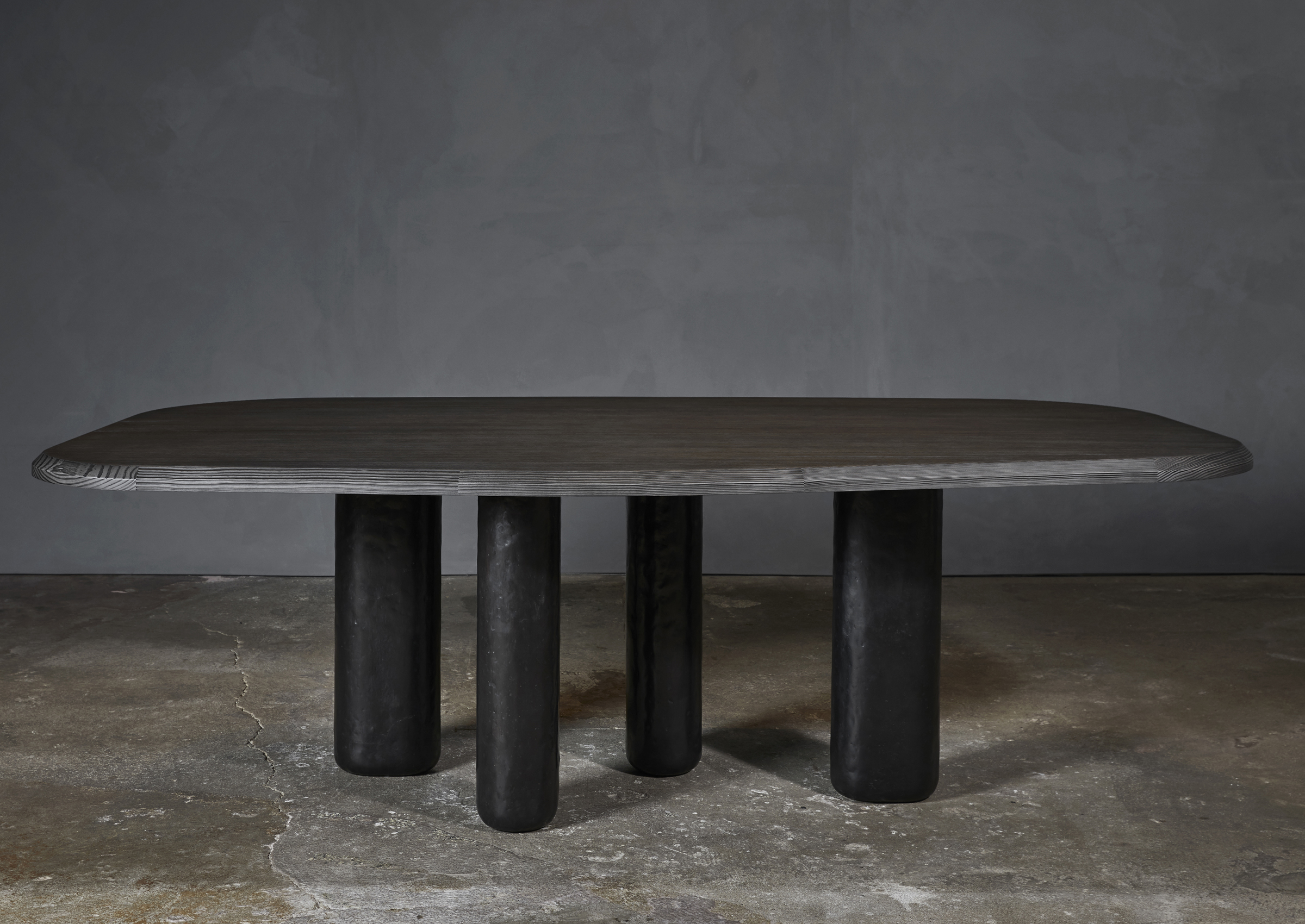 The Rough Table is a stylish, multi-faceted presence. Its free-form tabletop is never seen the same way twice: neither oval nor rectangular, it appears to have been carved out of the mass. But you quickly realize that it is more refined than you imagined, the proportions just so, the slope perfect, the bevel delicate. Similarly, its legs (in wood or patinated bronze), which at first appear to be quite generous, show themselves to be oblong, alert, and well-paced, like a walk through the woods.