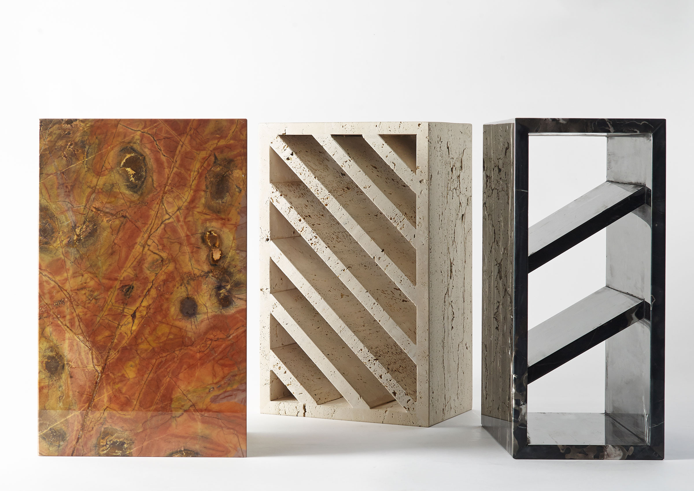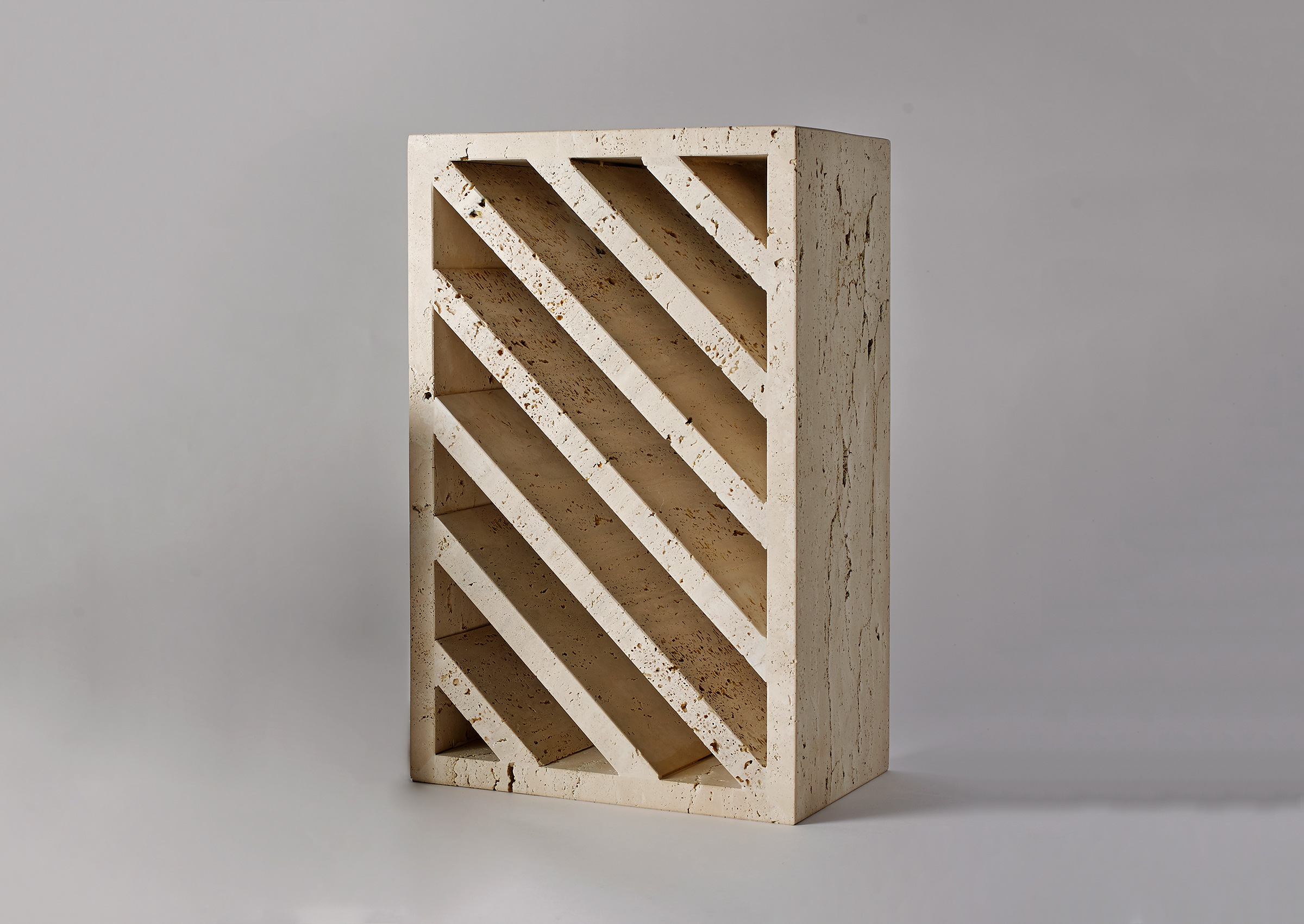 Bricks are sculptural objects and pieces of furniture crafted from stone, each possessing three seemingly identical shapes. However, they each serve distinct functions, thanks to their clever arrangement of lines, strata, and alveoli. The clean and sleek design of Bricks is complemented by delicate lines that transform them into versatile pieces capable of functioning as bedside tables, magazine racks, mini bookshelves, or side tables.