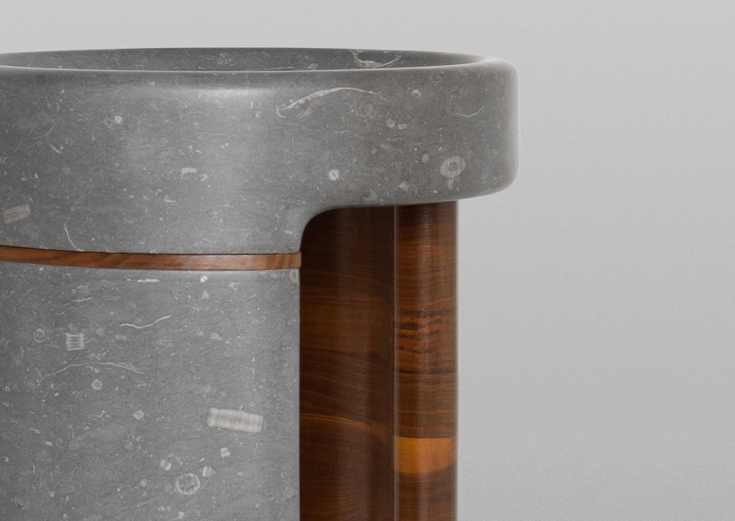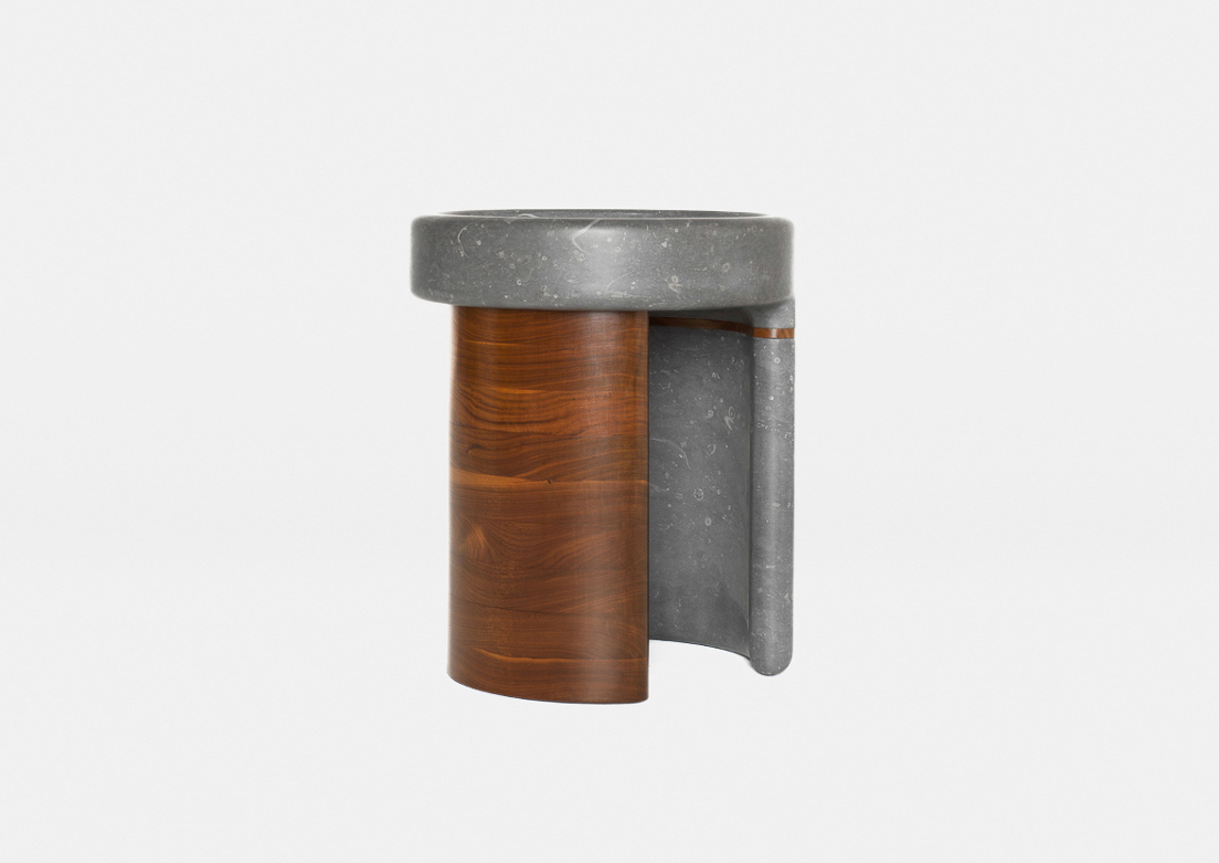 Inspired by the Marmar coffee table, the Forsyth side table boasts similar bullnose edges and seamless transitions between the leg and the top. Combining an Irish limestone body with a wide, curved walnut leg placed within the circumference of the table, this design features an interesting combination of materials. Within the bowl-like limestone top, a slice of walnut appears as a continuation of the solid walnut leg which supports the table below, another detail showing the expert engineering of the piece.