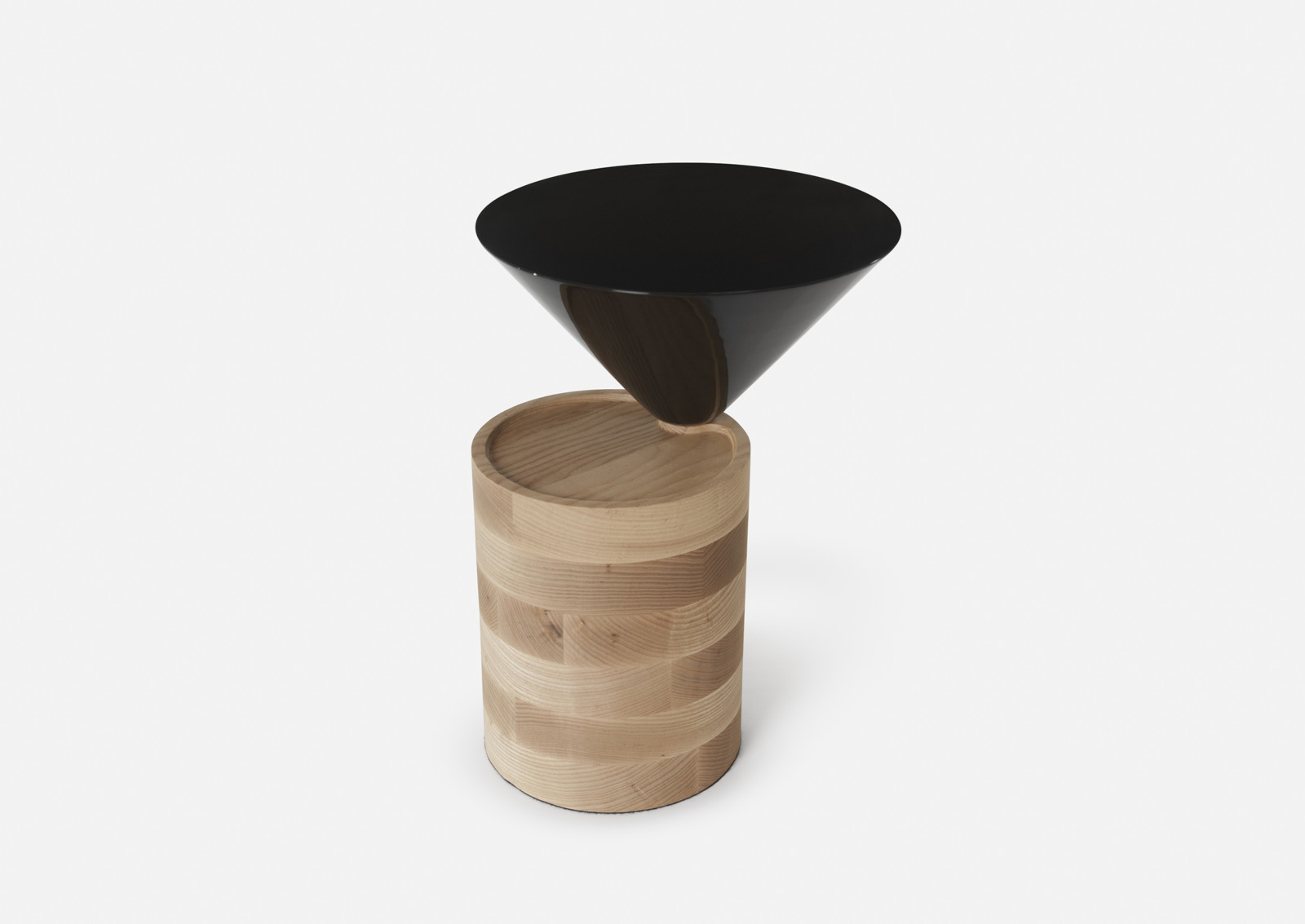 The Laurel side table is composed of two pure geometric shapes, cone and cylinder, intersecting to create two wide and functional surfaces, distributed at different levels. In keeping with the other elements of the collection, the ratio of the materials used is 50/50, in this case, painted and hand-polished HDF for the cone, which appears to balance weightlessly upon the cylindrical marble base. Designed by Luca Nichetto and manufactured by De La Espada for the Nichetto brand. The Laurel is also available with a marble base and a coffee table.