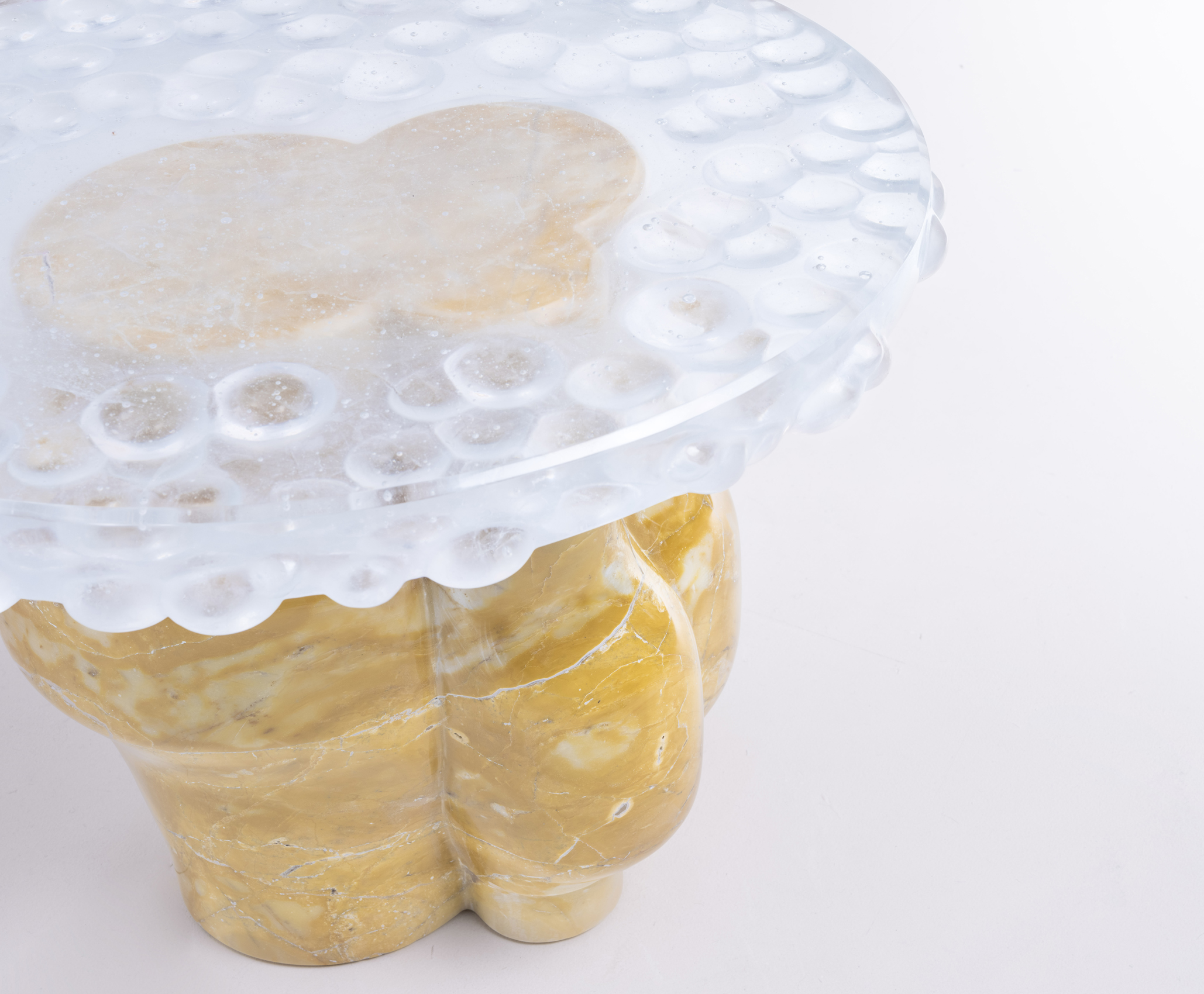 Available in a variety of Orior stones, the Reo table base is hand-polished into this unique shape. Recycled Irish crystal forms the top of the table which is melted and then cast into this translucent surface. The voluptuous, organic shape of the stone creates a sculptural pedestal for the solid crystal.