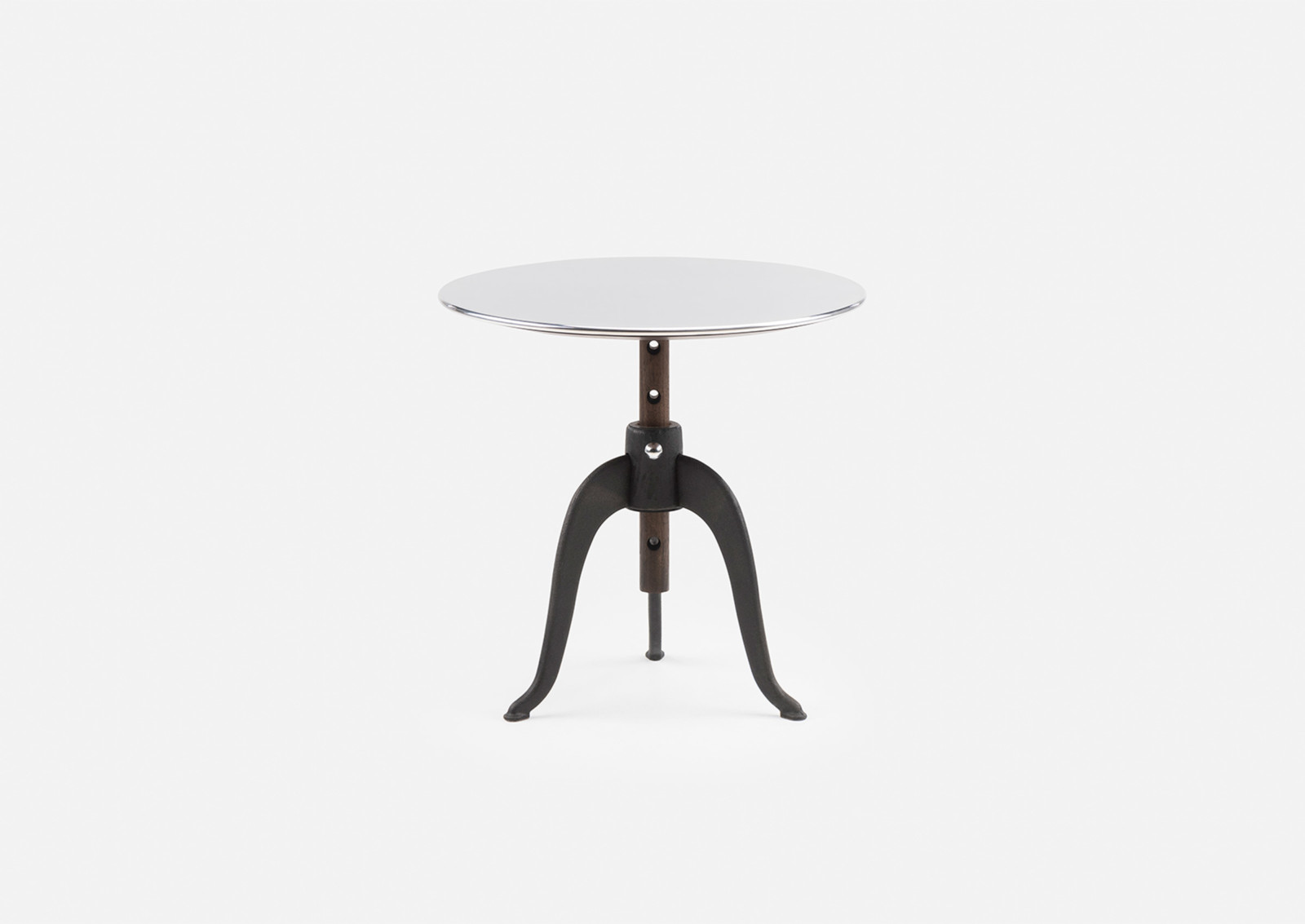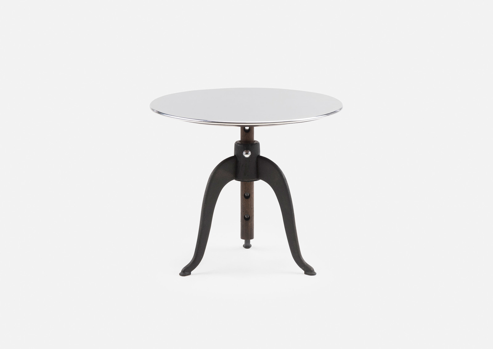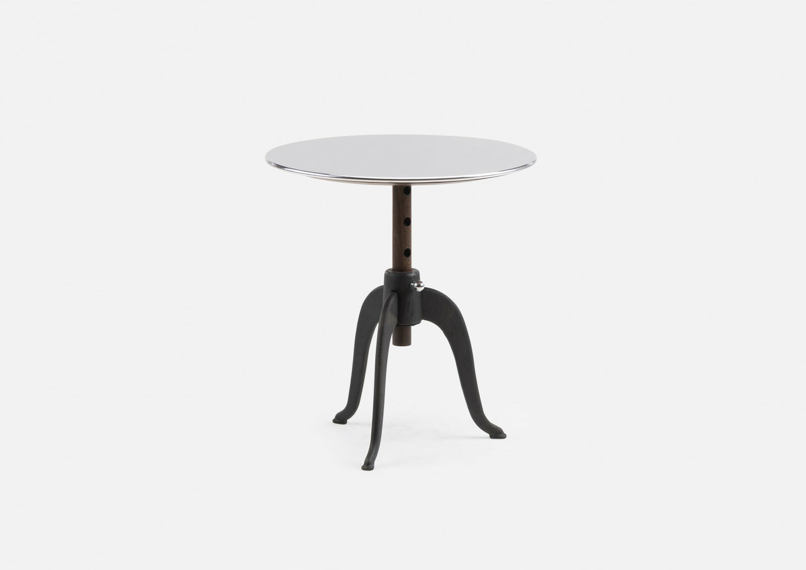 Sidekicks is a series of small occasional tables that live throughout the home to accommodate our different activities. They are the right height and dimension to sit next to sofas and chairs, for drinks and snacks, papers and magazines, or for a short time on the laptop. Sidekicks Height Adjustable Table is available with cast iron legs that allow the polished aluminum tabletop to be raised to five different heights. Designed by Studioilse and manufactured by De La Espada for the Studioilse brand.