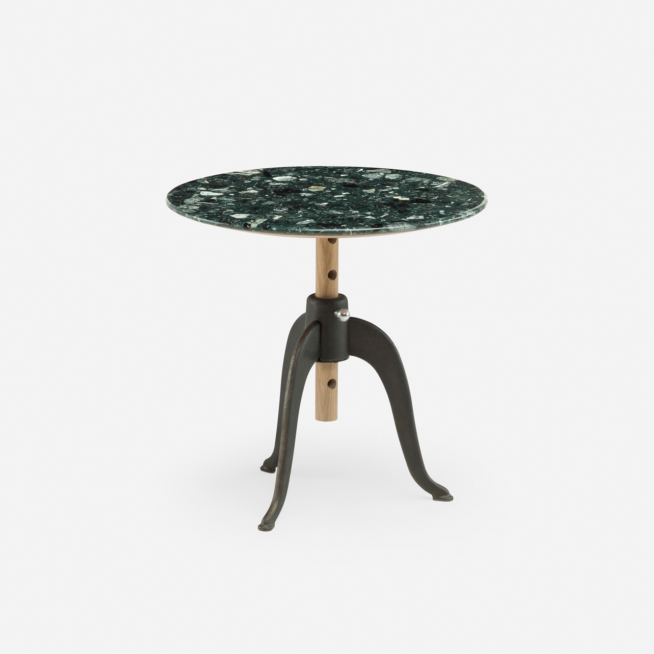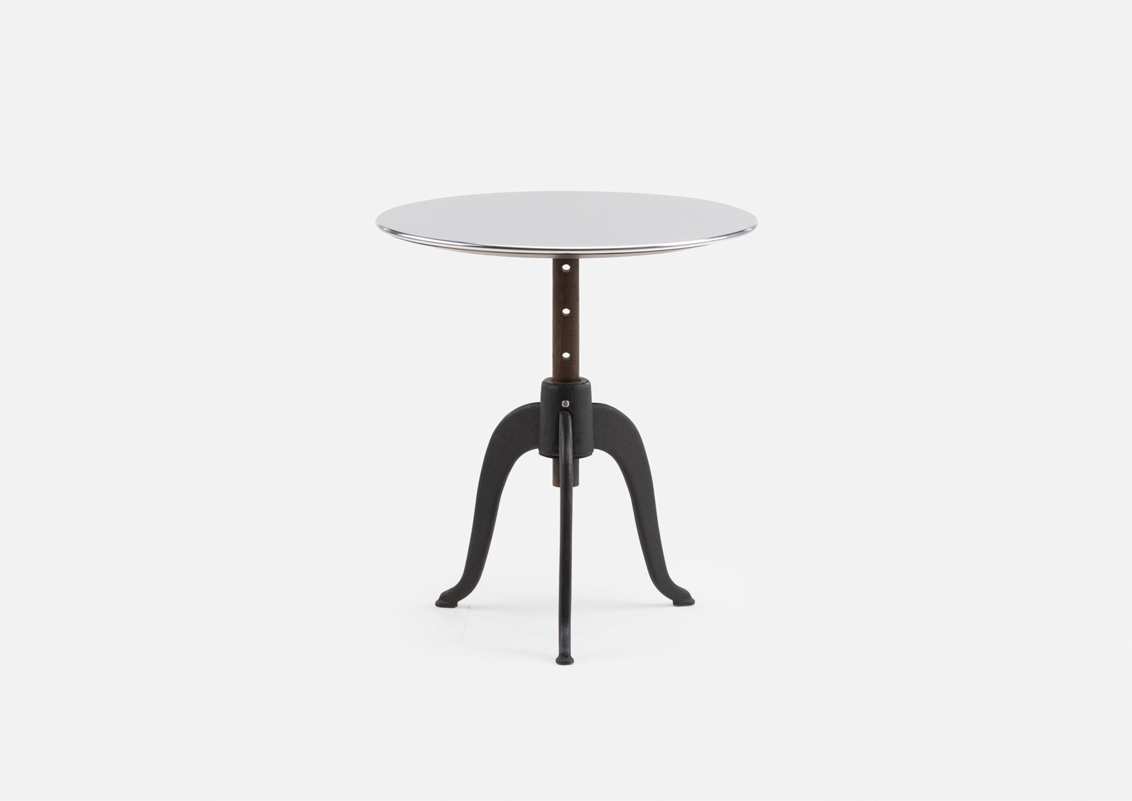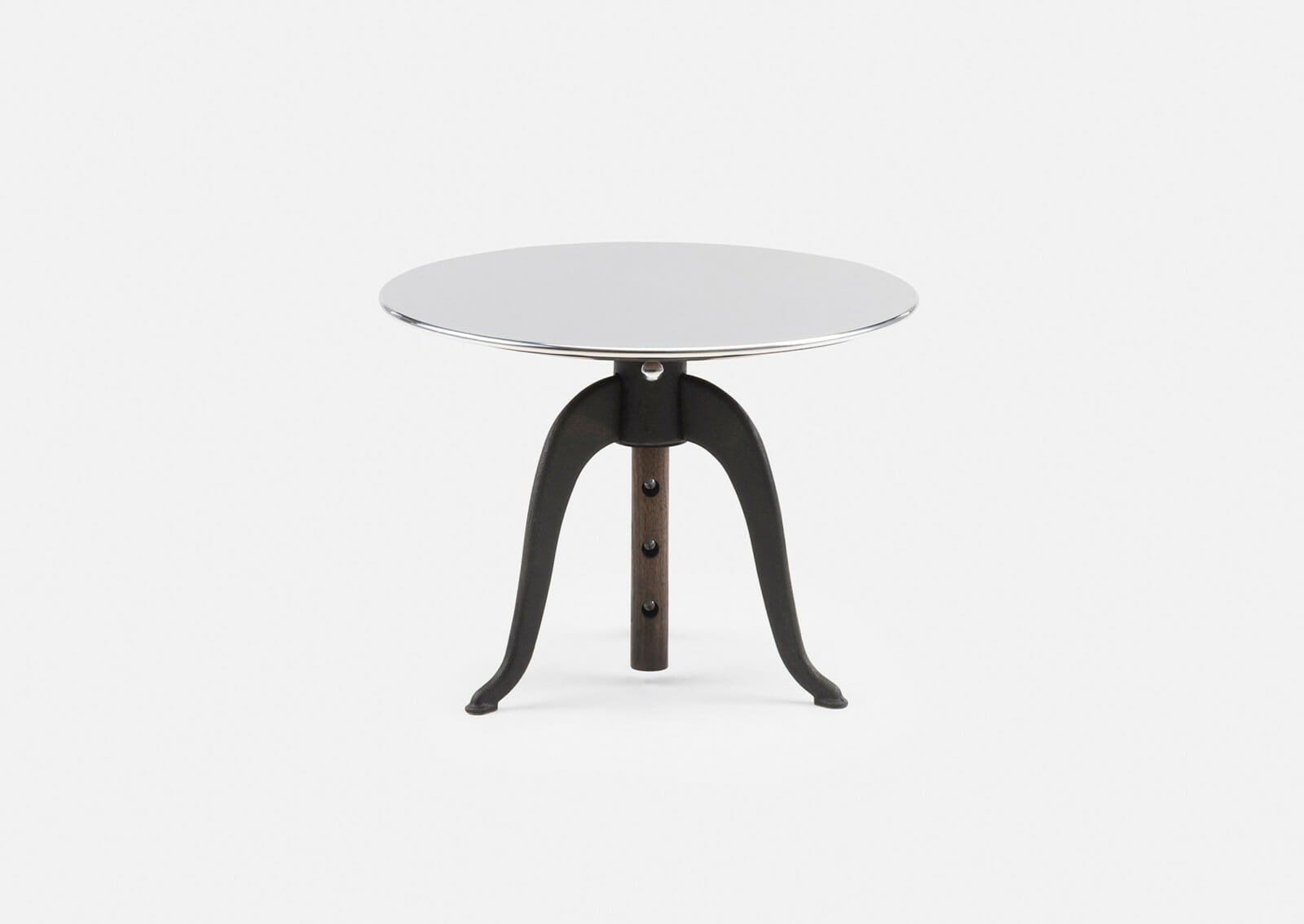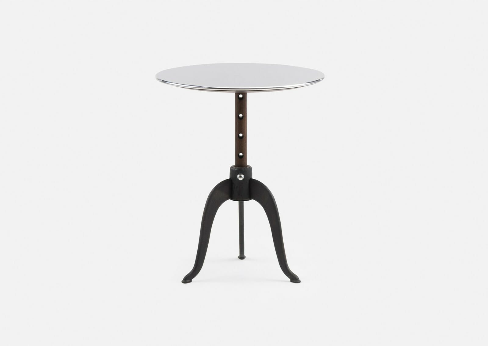 Sidekicks is a series of small occasional tables that live throughout the home to accommodate our different activities. They are the right height and dimension to sit next to sofas and chairs, for drinks and snacks, papers and magazines, or for a short time on the laptop. Sidekicks Height Adjustable Table is available with cast iron legs that allow the polished aluminum tabletop to be raised to five different heights. Designed by Studioilse and manufactured by De La Espada for the Studioilse brand.