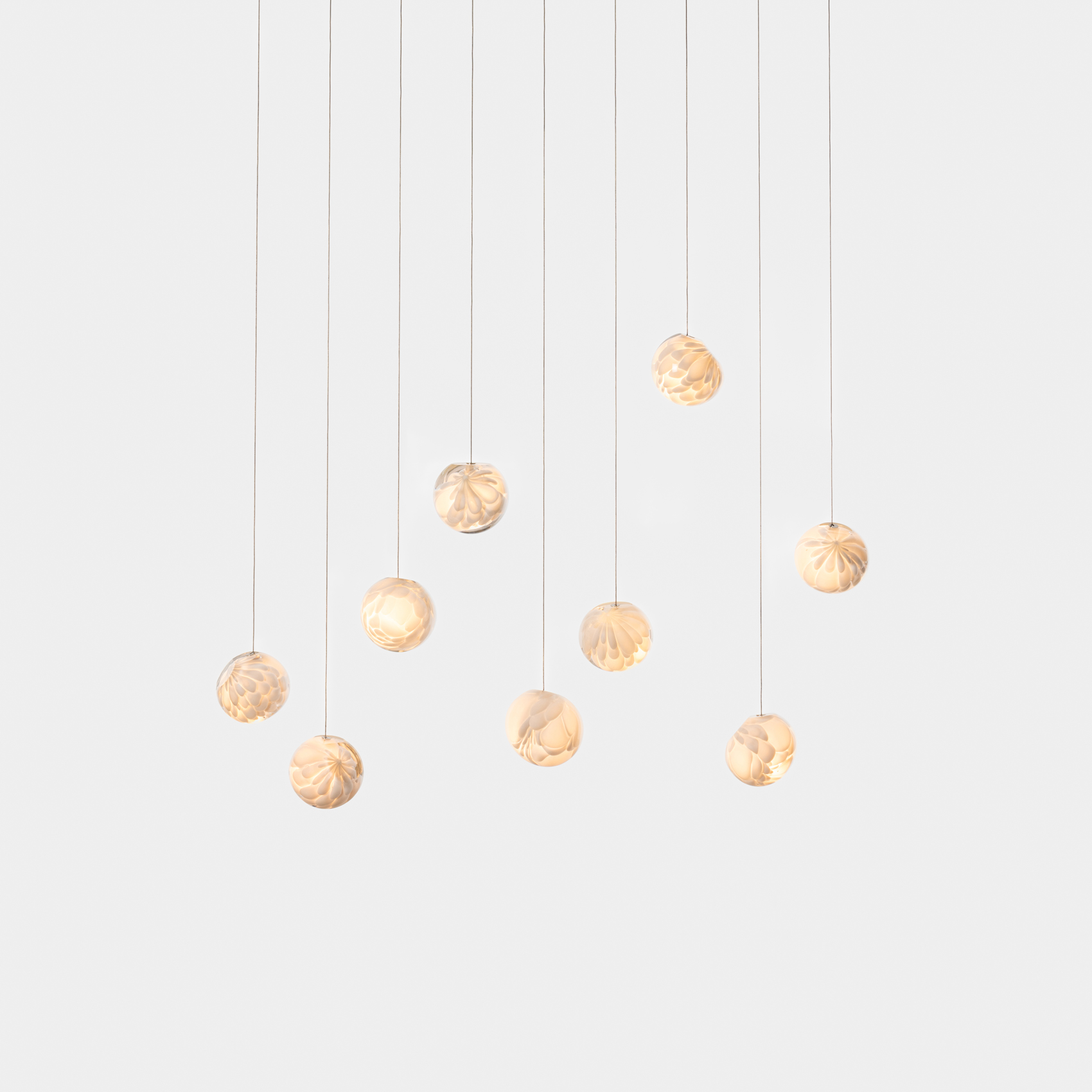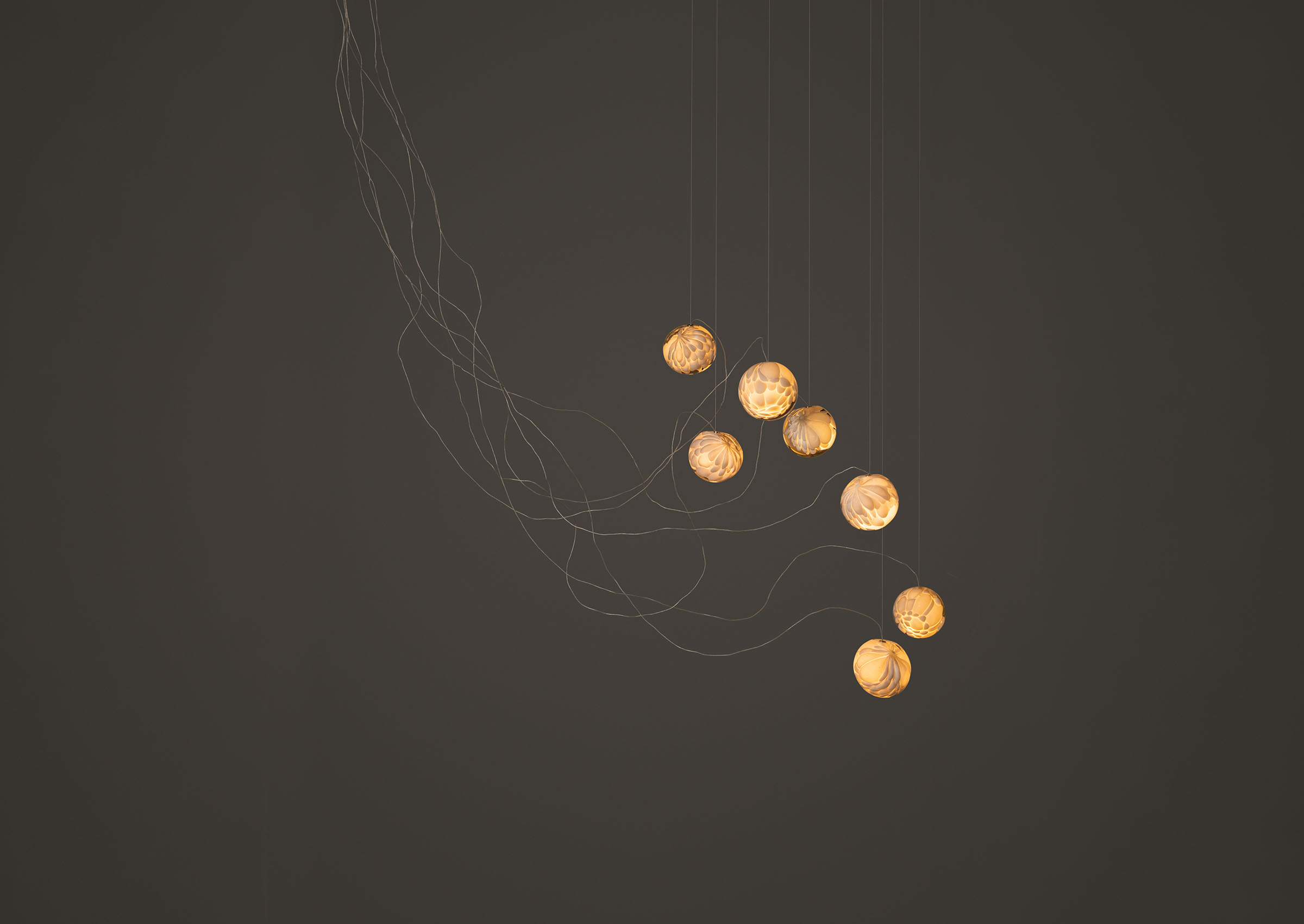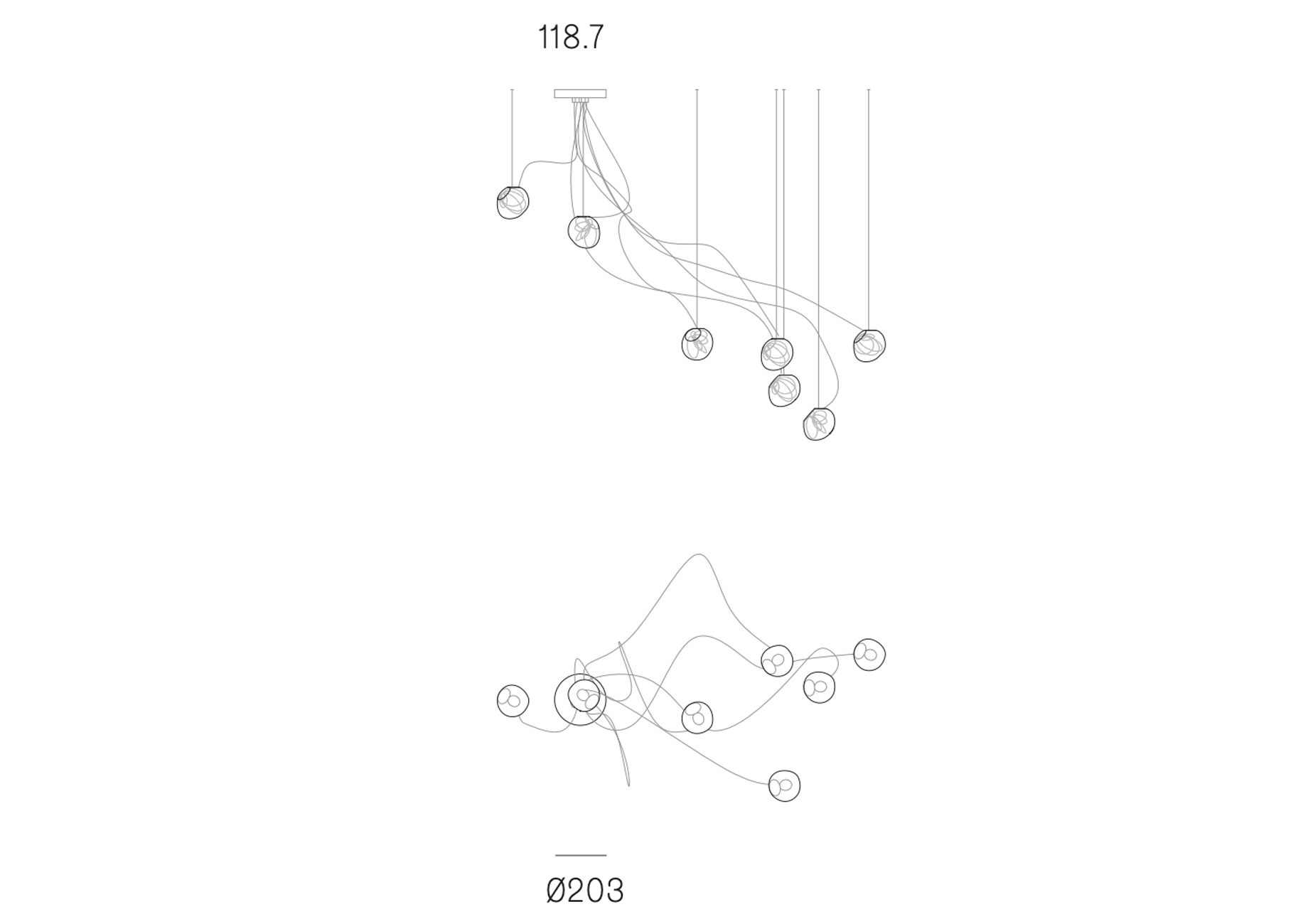 118.7 is an arrangement of seven hand-blown glass pendants paired with sculptural cables to achieve atmospheric configurations. This piece is designed to occupy a horizontal plane that deviates from its gravitational directive. The pendants can hang from any number of optional anchor points mounted away from the canopy.