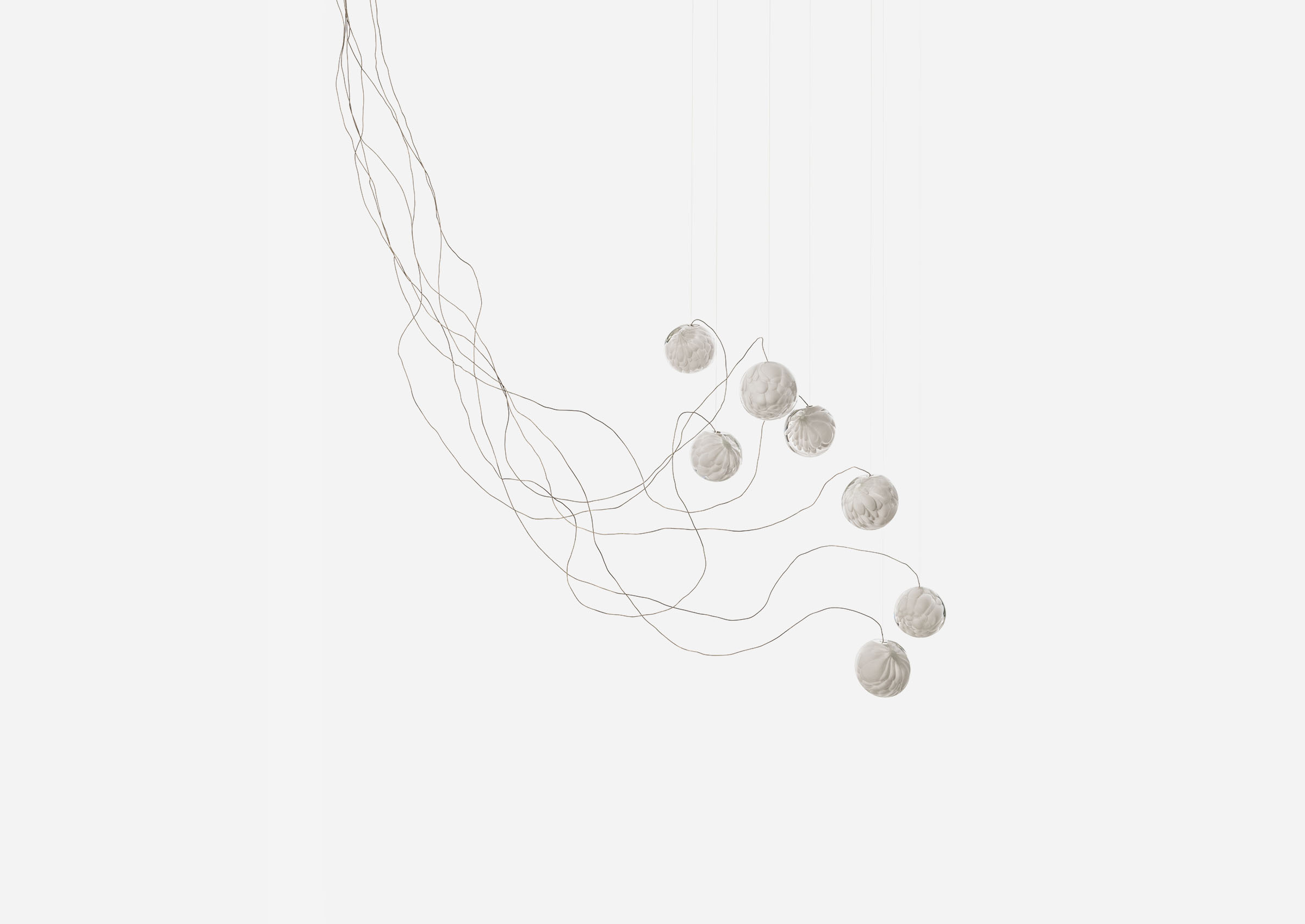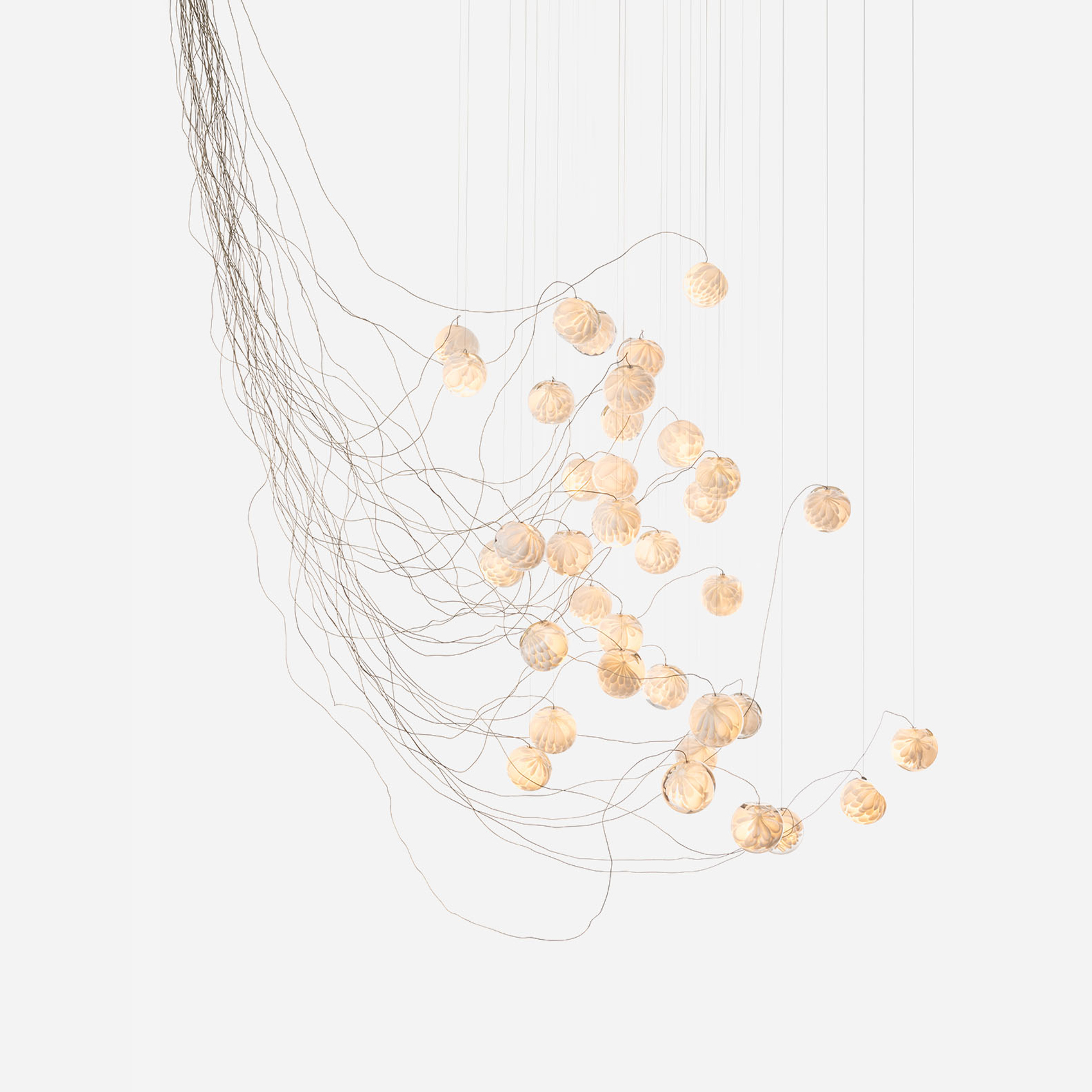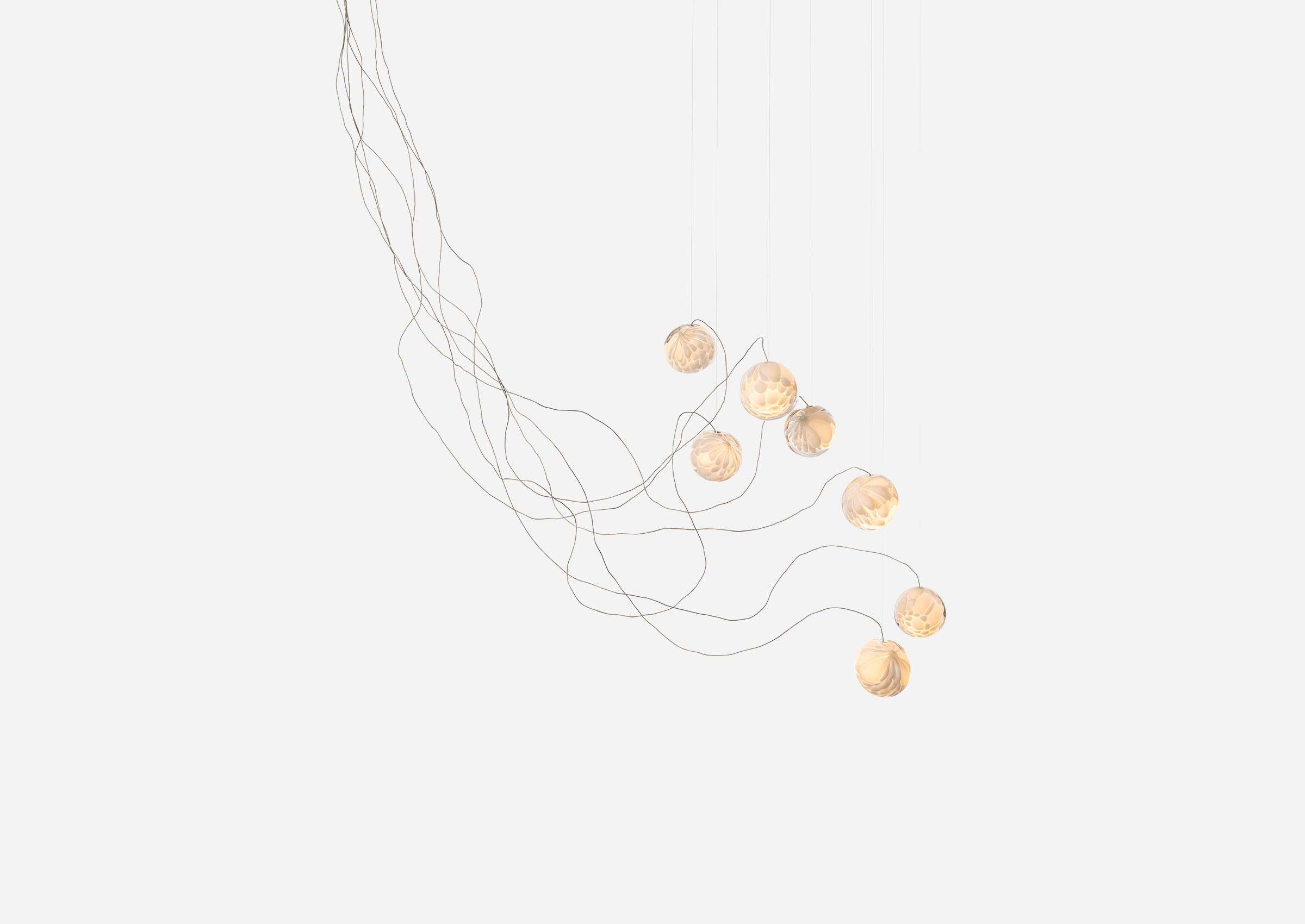 118.7 is an arrangement of seven hand-blown glass pendants paired with sculptural cables to achieve atmospheric configurations. This piece is designed to occupy a horizontal plane that deviates from its gravitational directive. The pendants can hang from any number of optional anchor points mounted away from the canopy.
