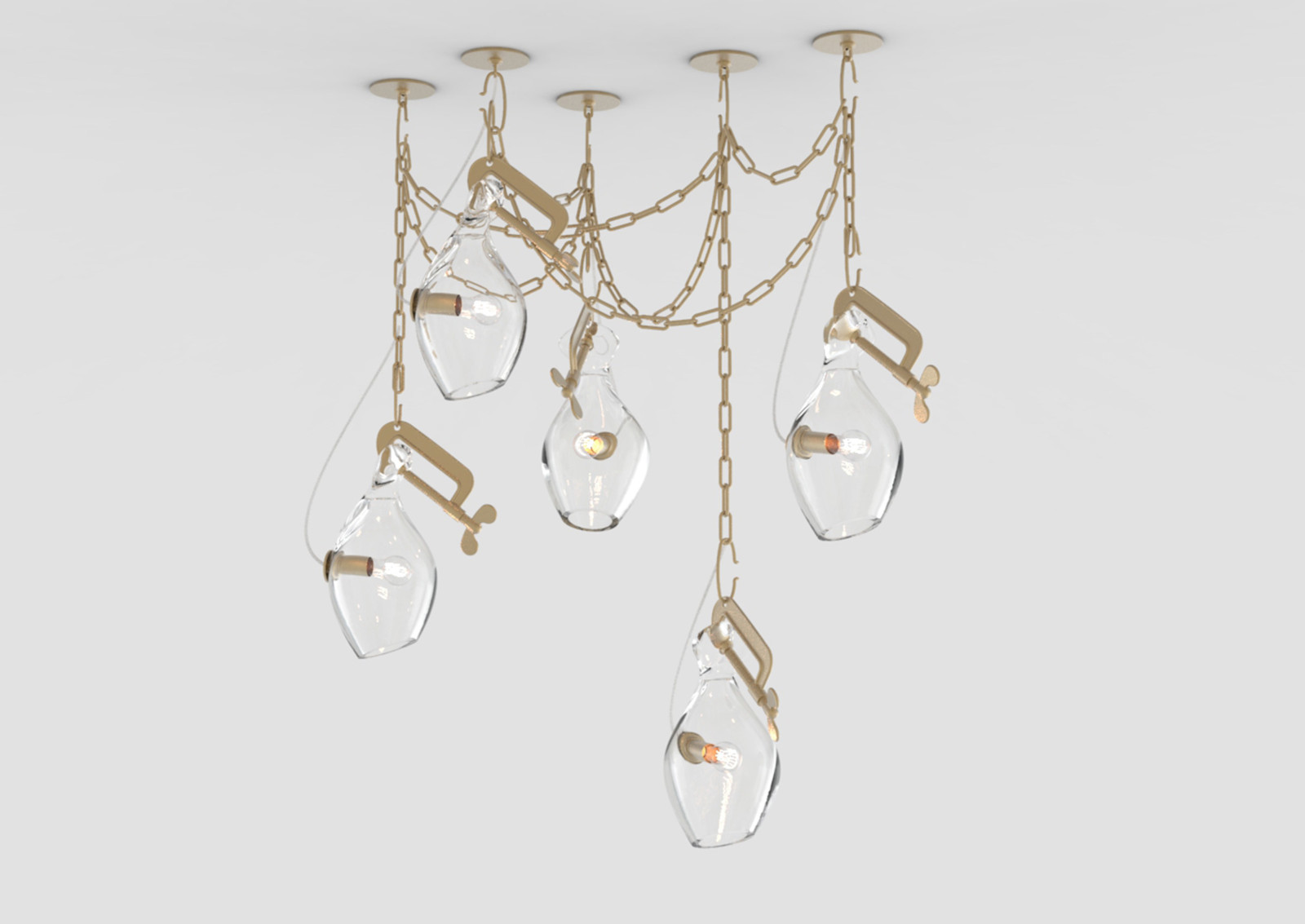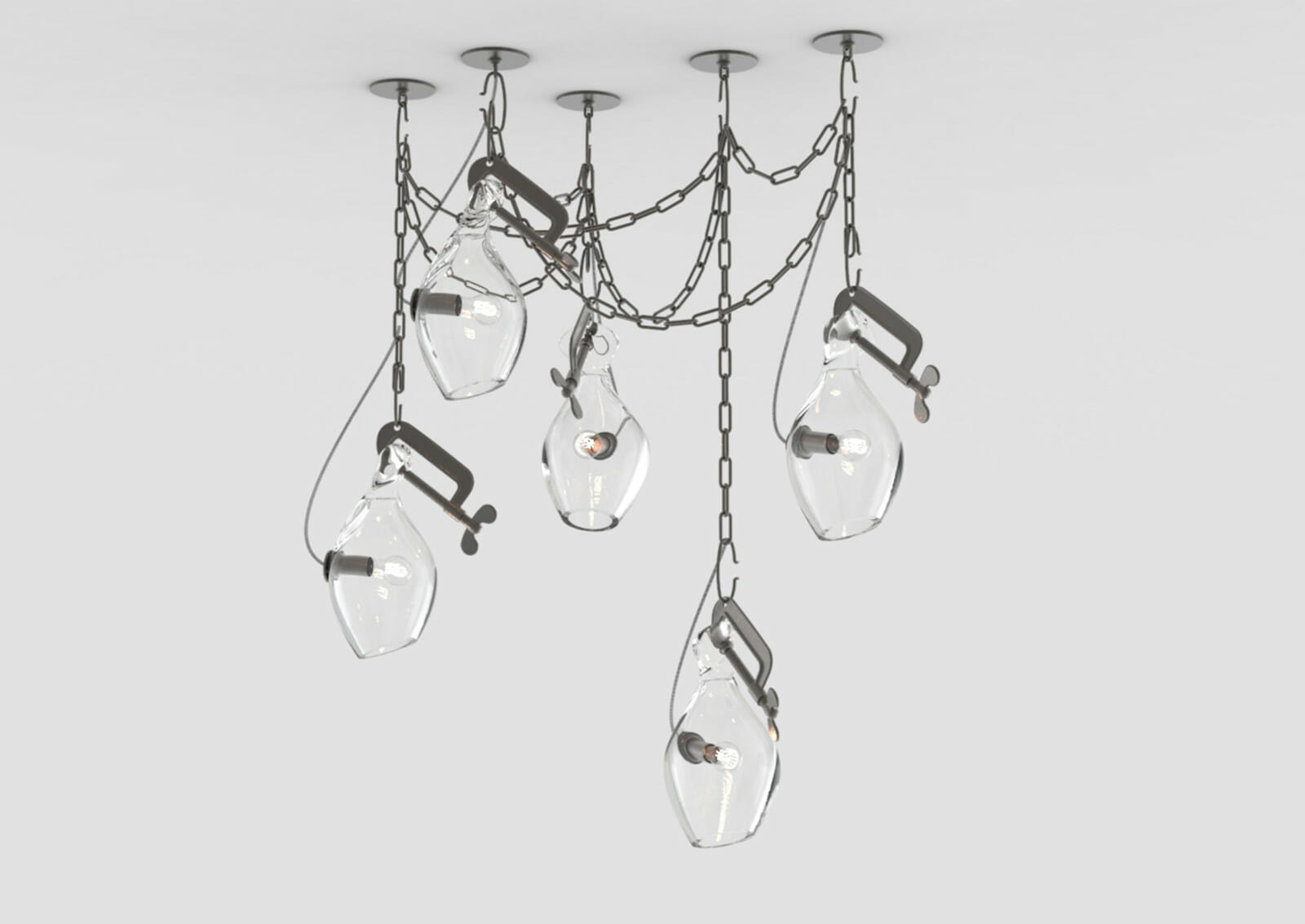 Lindsey Adelman collects old industrial clamps from manufacturers all over the United States and plates them in brass. Lead glassblower, Michiko Sakano, blows molten glass into each one and lets the form naturally slump, making each fixture truly unique.