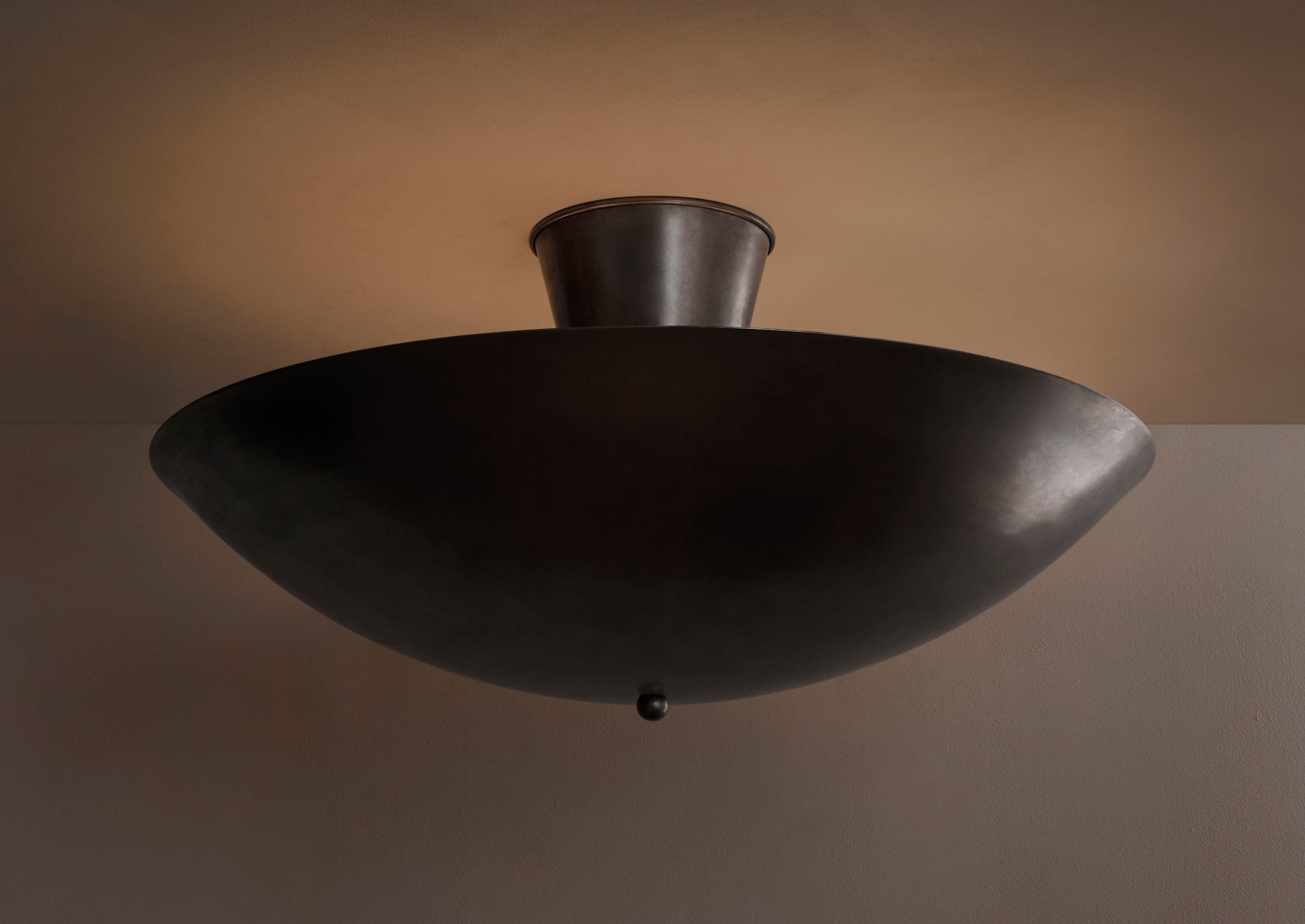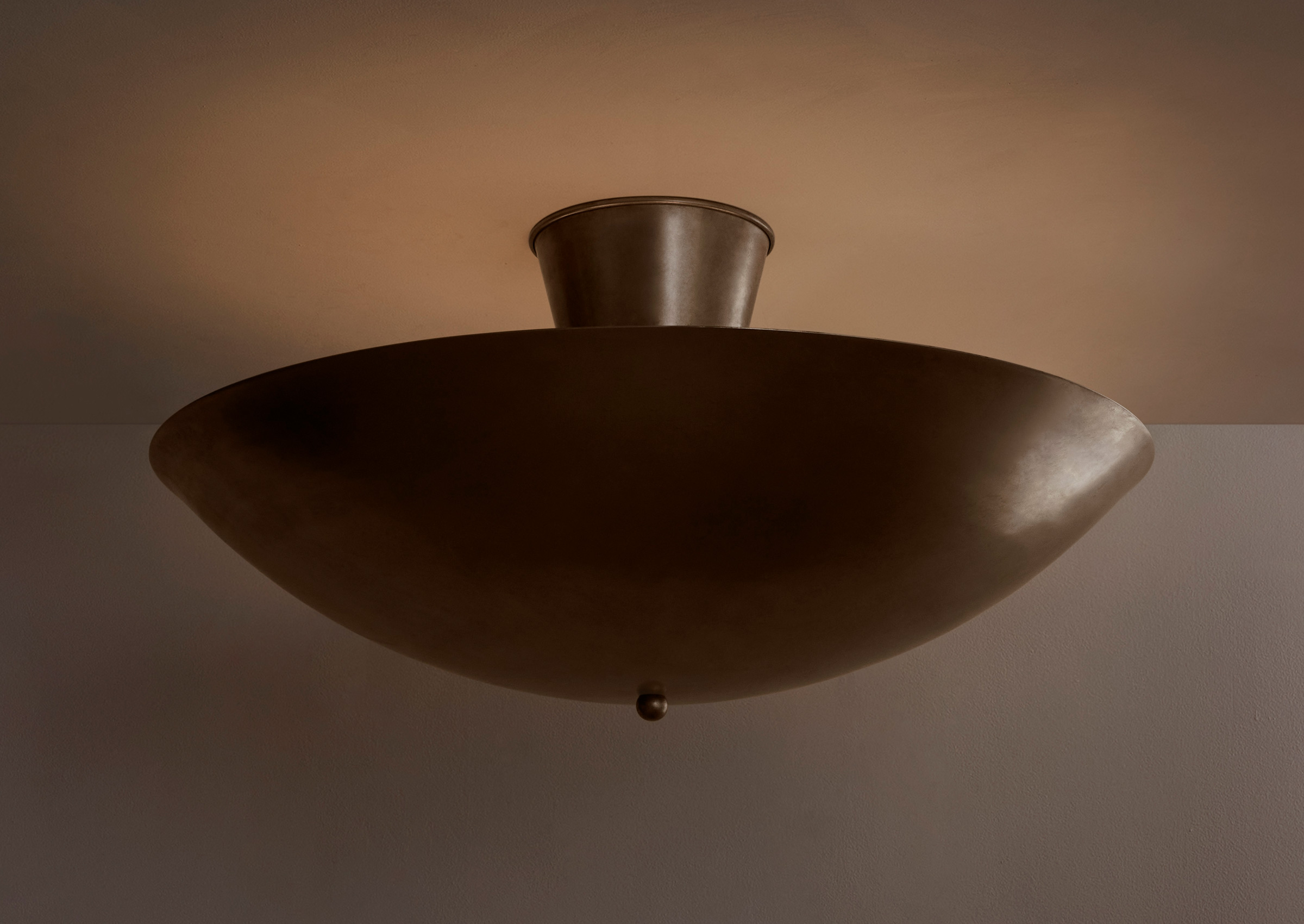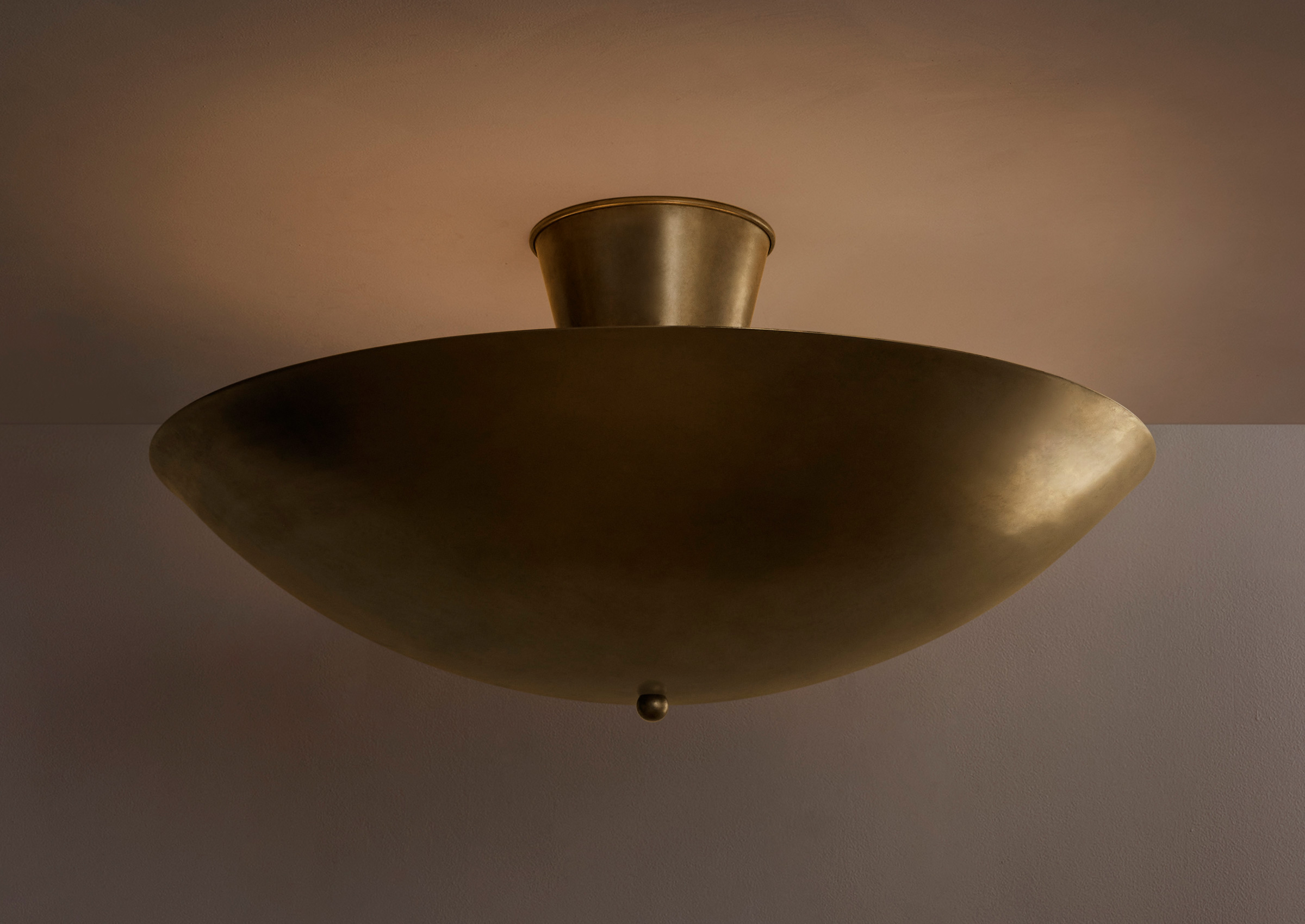 A large-scale statement fixture balancing dramatic proportions with geometric simplicity. Lit from within by a series of bulbs hidden behind a 36-inch shade, its sculptural form is characterized as much by restraint as it is by its robust size. Available in four hand-spun brass finishes designed to catch the eye.