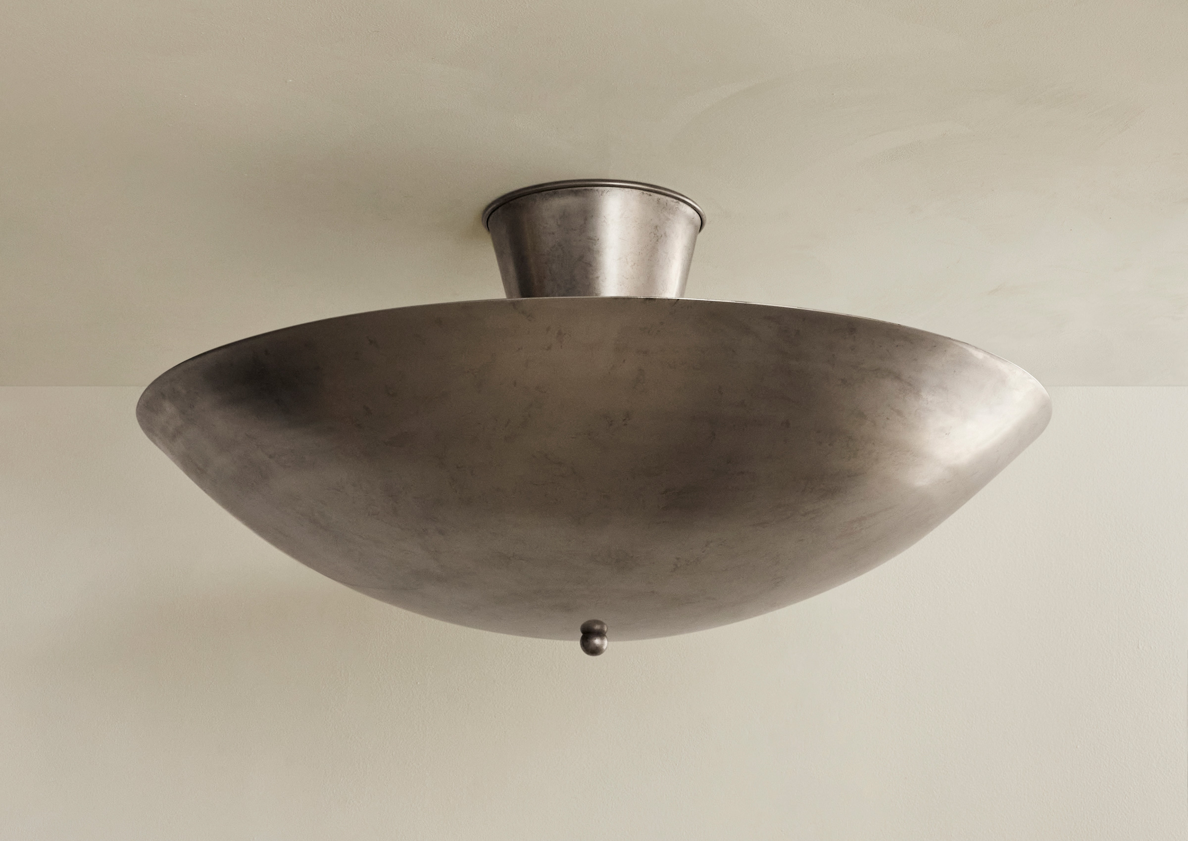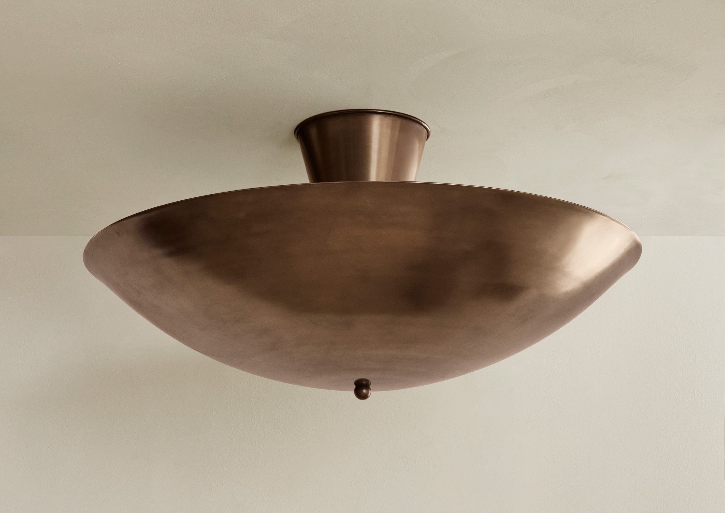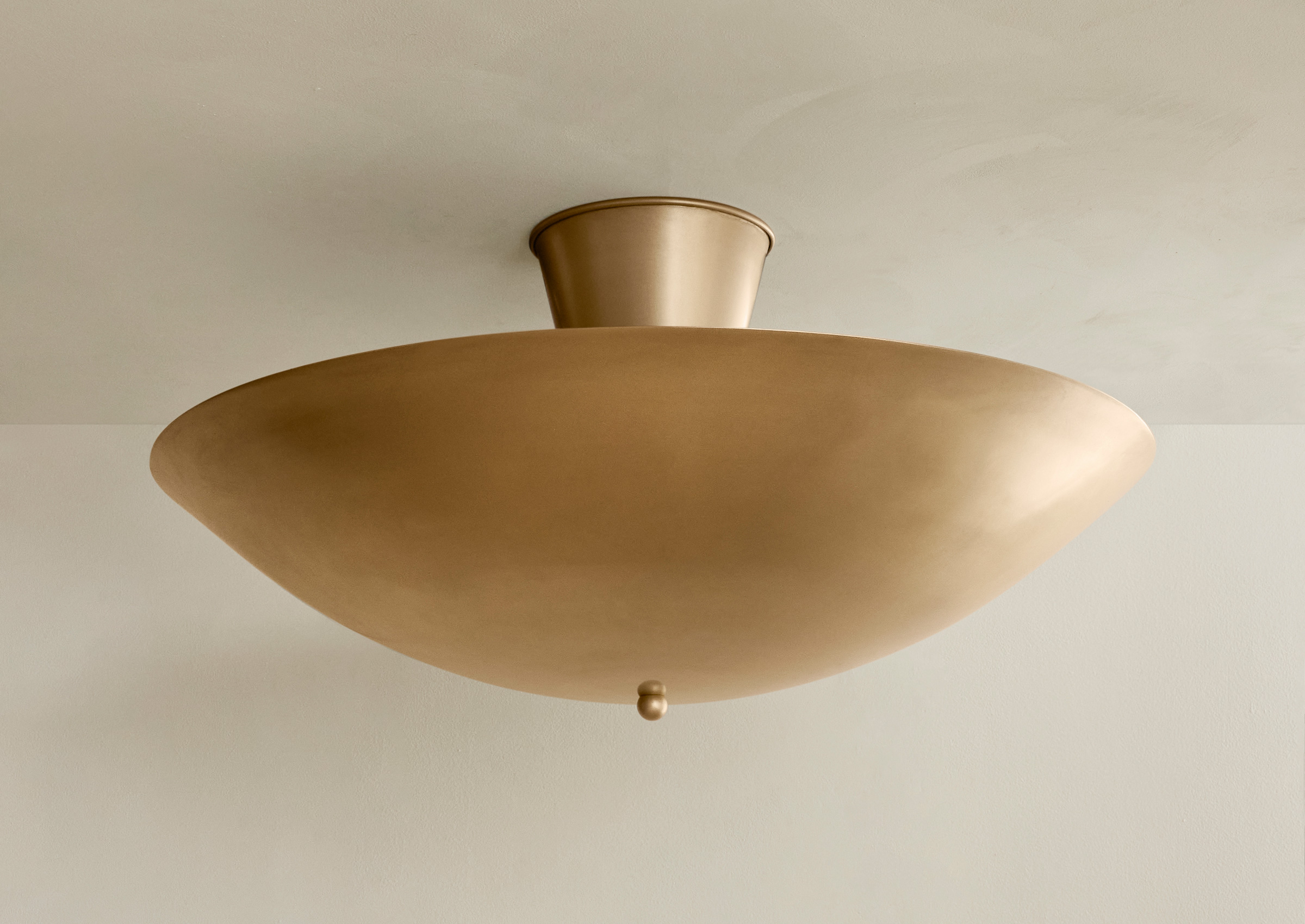 A large-scale statement fixture balancing dramatic proportions with geometric simplicity. Lit from within by a series of bulbs hidden behind a 36-inch shade, its sculptural form is characterized as much by restraint as it is by its robust size. Available in four hand-spun brass finishes designed to catch the eye.