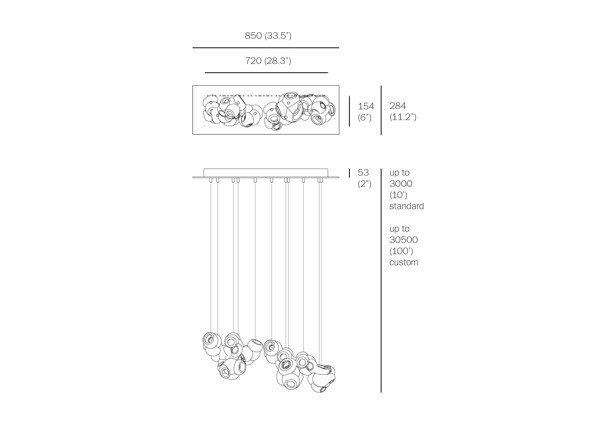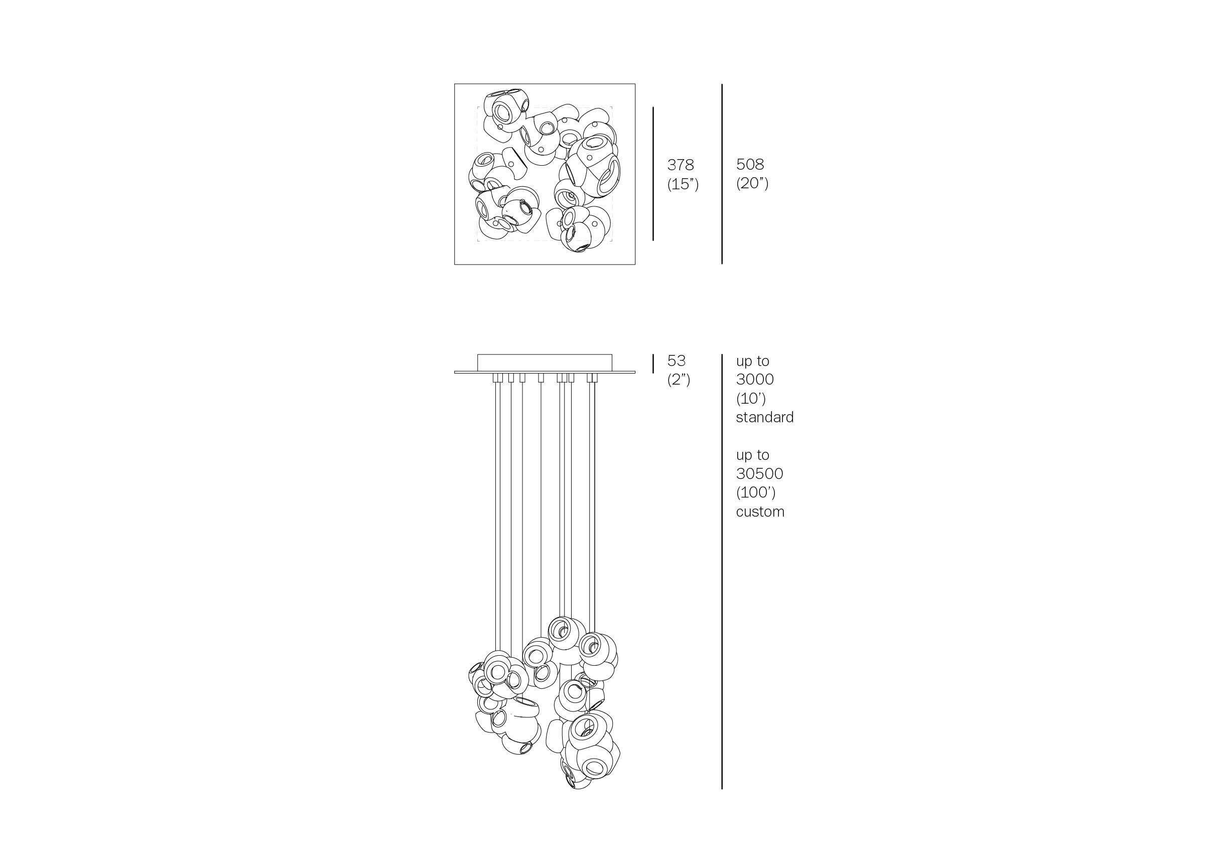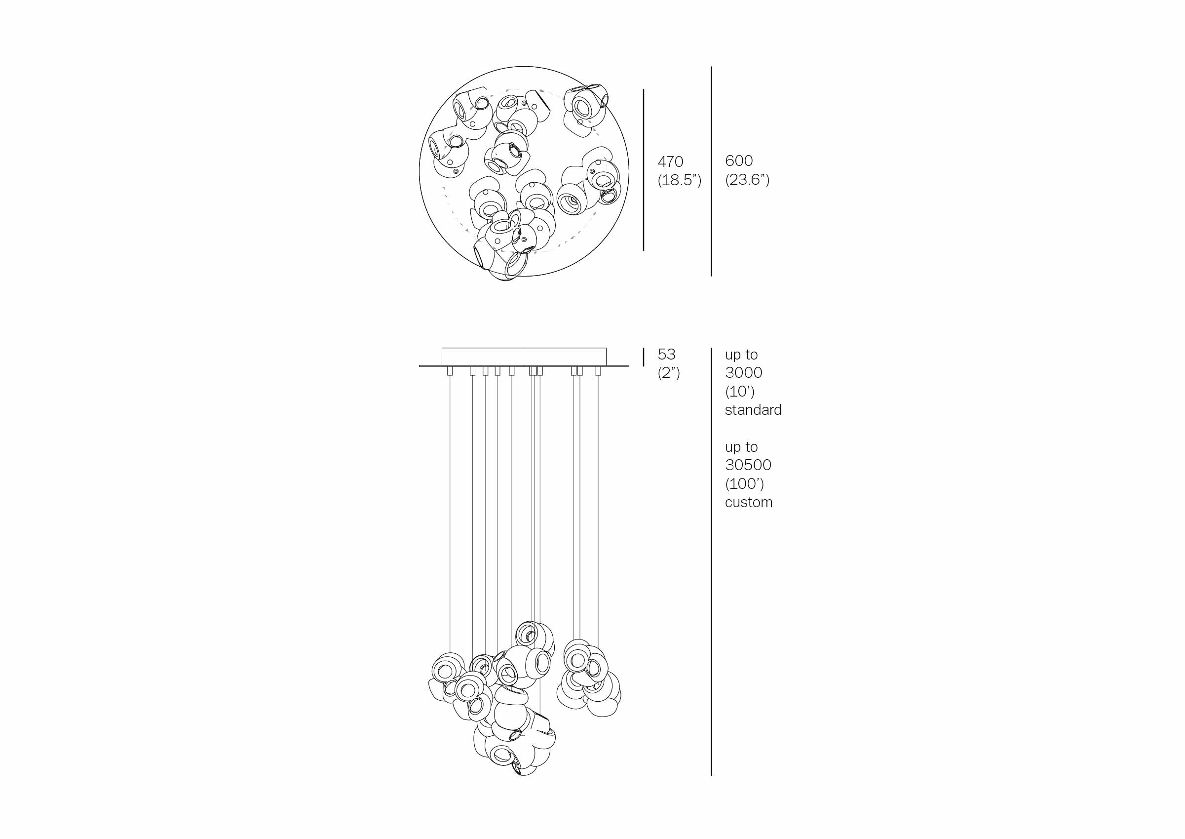 100.11 is a random configuration of eleven 100 pendants hung from a rectangular canopy. The drop lengths of the pendants are randomized between a client specified range of heights to variously cluster and scatter. The result is an ambient installation or field of light. 100 brings multiple glass artists together in a performative act. Molten glass bubbles are prepared and then smashed together to produce unpredictable interlocking glass forms.