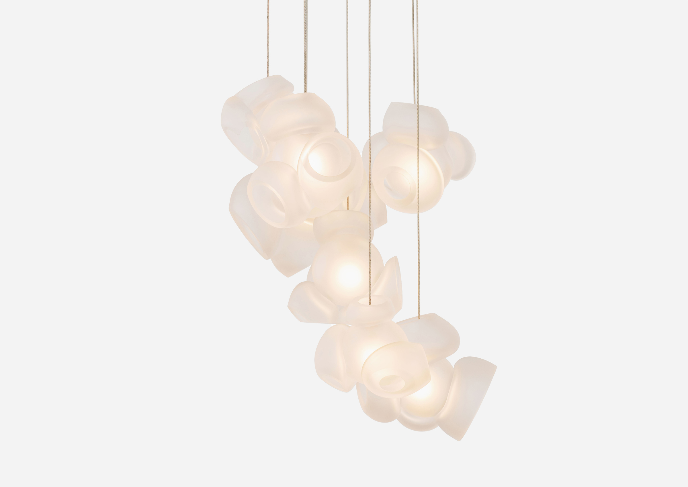 100.7 is a random configuration of seven 100 pendants hung from a round canopy. The pendants are designed to hang in a random configuration, the result is an ambient installation or field of light. The pendant drop lengths on this light fixture are adjustable up to the specified maximum. 100 brings multiple glass artists together in a performative act. Molten glass bubbles are prepared and then smashed together to produce unpredictable interlocking glass forms.