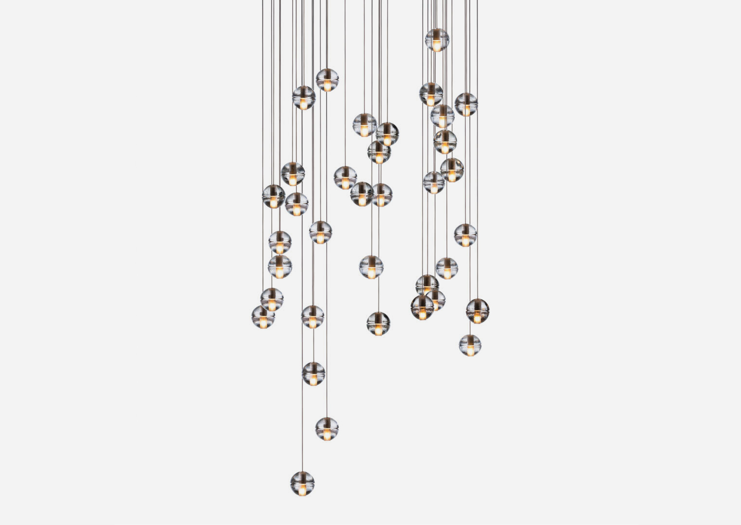 14.36 is a random configuration of thirty-six 14 pendants hung from a round, rectangular or square canopy. The drop lengths of the pendants are randomized between a client-specified range. The 14 is an articulated, seamed cast glass sphere with a frosted cylindrical void that houses a low-voltage lamp.