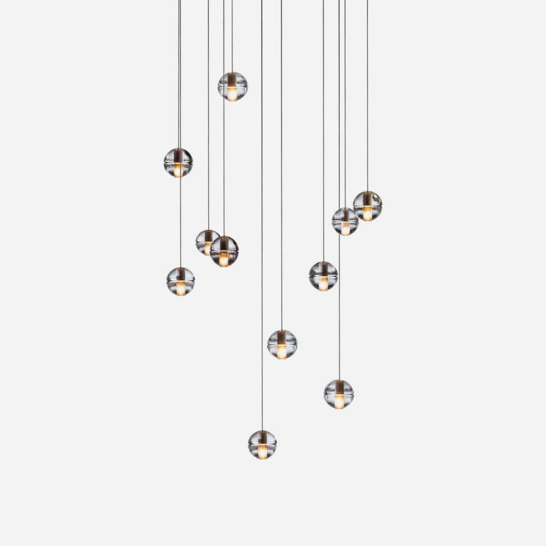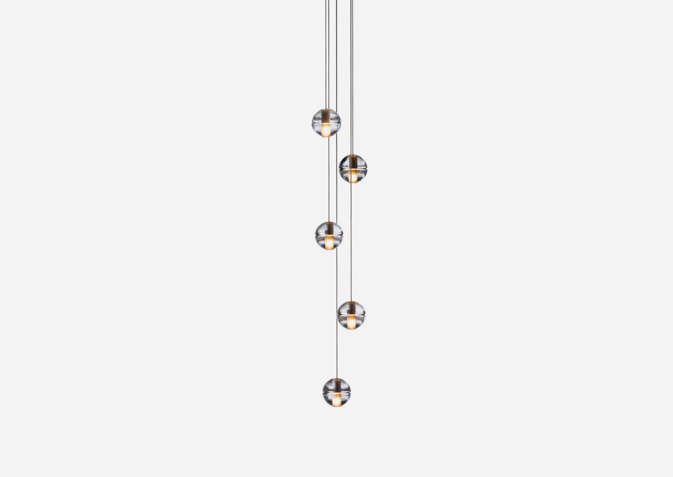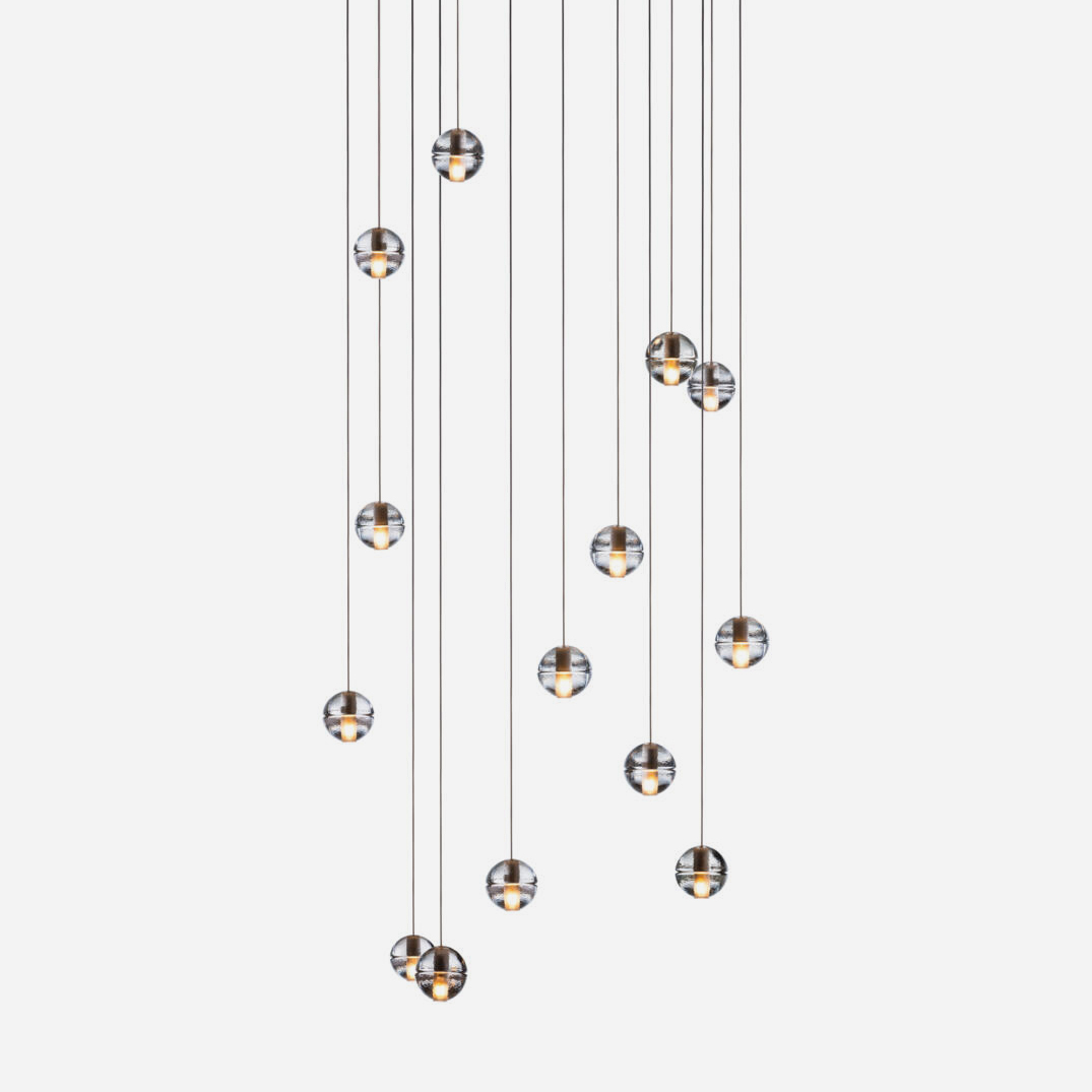 The 14 is an articulated, seamed cast glass sphere with a frosted cylindrical void that houses a low-voltage lamp. 14.5 is a random configuration of five 14 pendants hung from a round canopy. The pendants are designed to hang in a random configuration, the result is an ambient installation or field of light.
