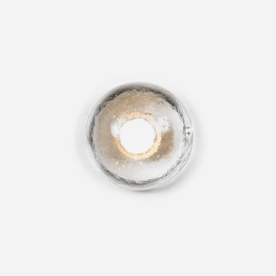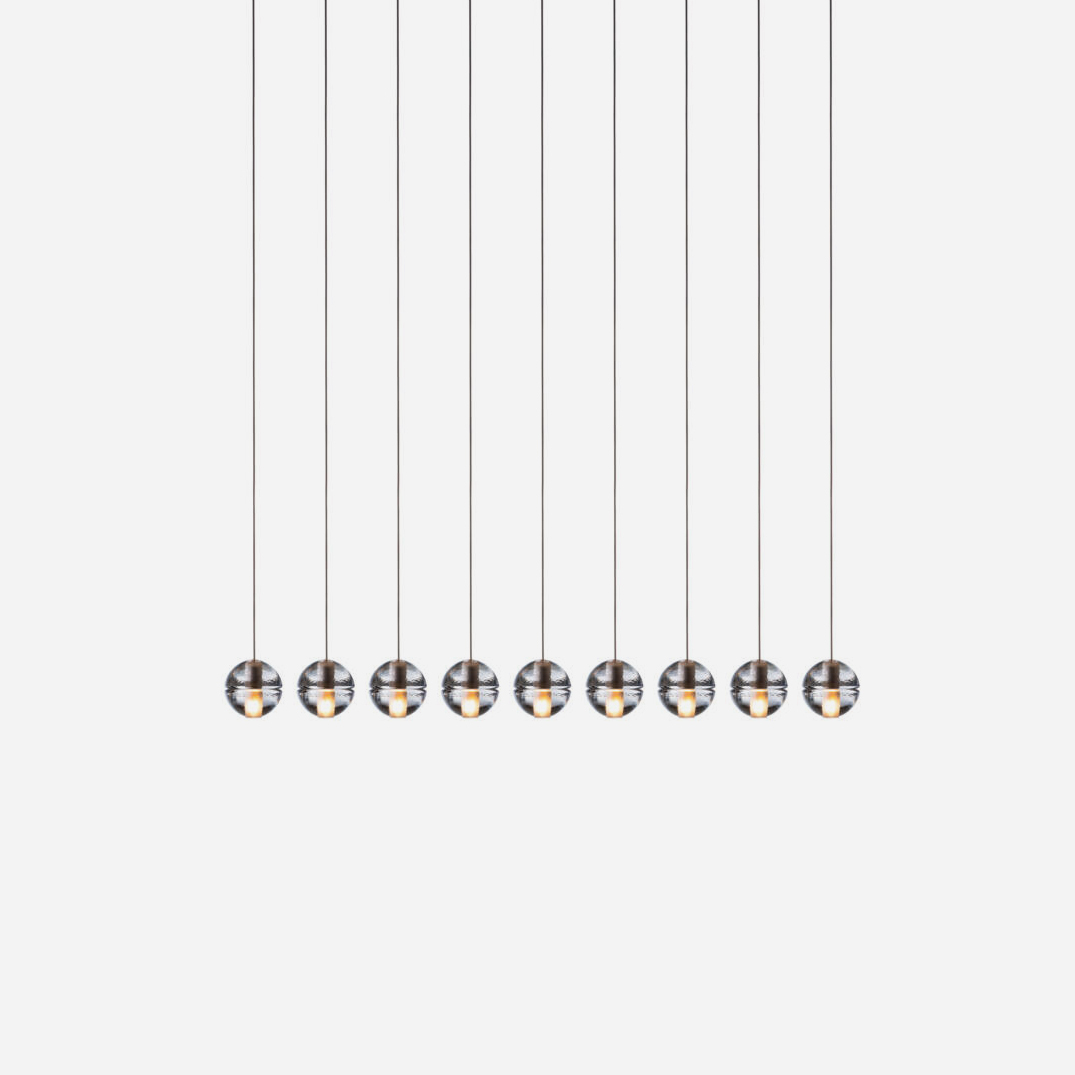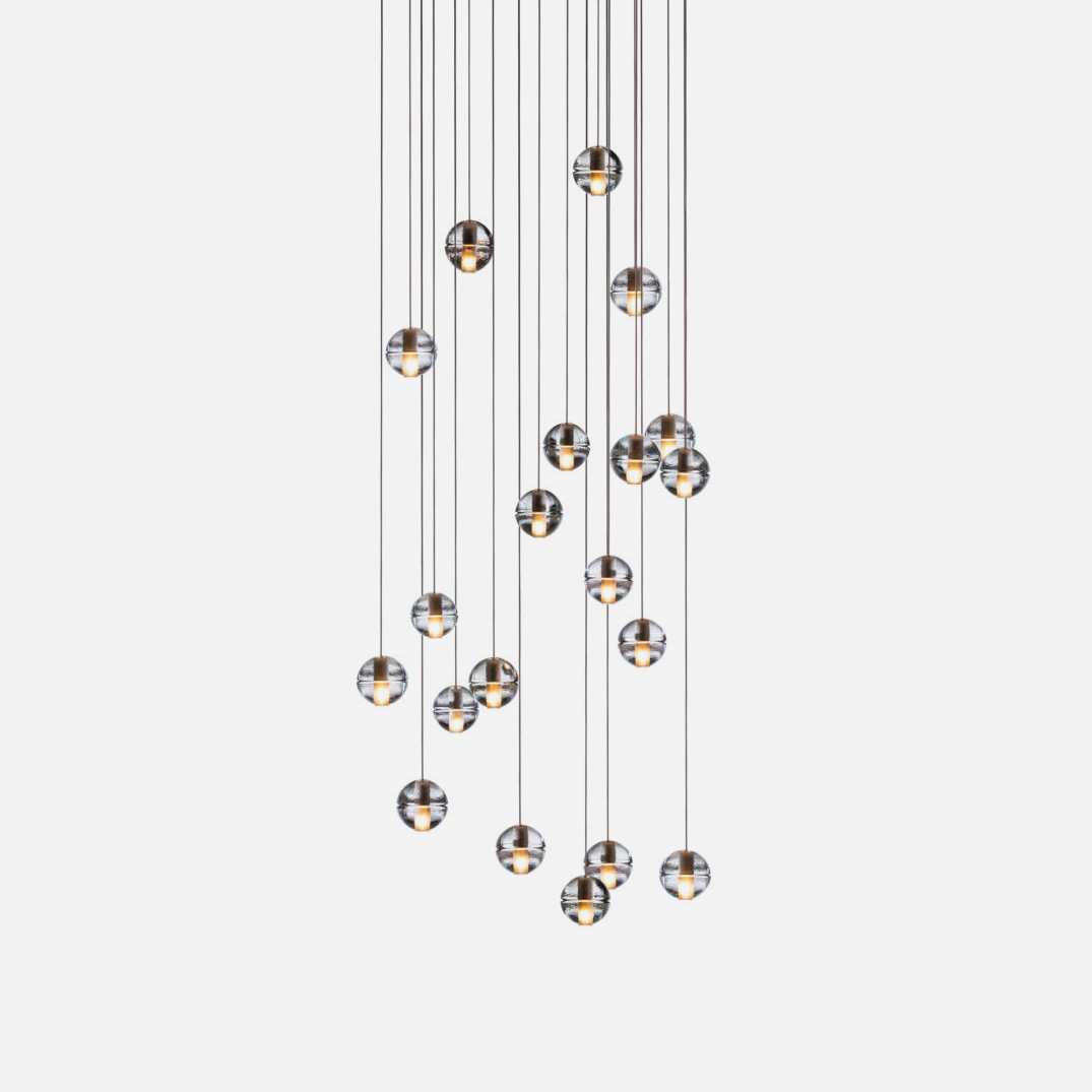 The 14 is an articulated, seamed cast glass sphere with a frosted cylindrical void that houses a low-voltage lamp. 14.5 is a random configuration of five 14 pendants hung from a round canopy. The pendants are designed to hang in a random configuration, the result is an ambient installation or field of light.