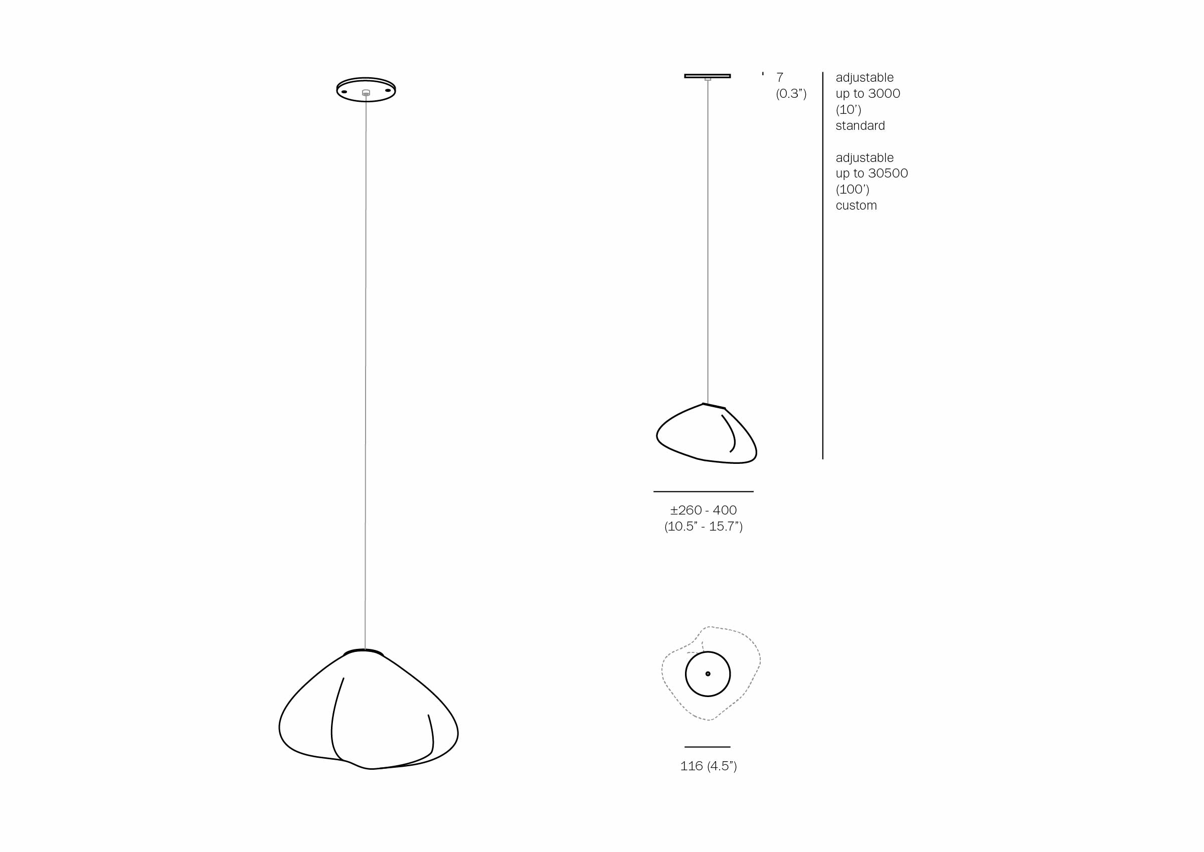 The 73 standard is suspended using coaxial cable and composed in ambient groupings. 73.1 is a low voltage pendant designed to be composed in atmospheric configurations. Each pendant is hand-blown into a folded and highly heat-resistant ceramic fabric vessel. Each pendant is housed with a 2.3-watt ring LED lamp which fills the volume of the pendant with diffuse light. The pendant drop lengths on this chandelier are adjustable up to the specified maximum. The 73 is formed by blowing liquid glass into a folded and highly heat-resistant ceramic fabric vessel. The resulting shape has a formal and textural expression intuitively associated with fabric, which becomes permanent and rigid as it cools. Each 73 is completely unique in proportion, size and shape. Standard suspension is adjustable up to 10’ or 20' (please choose cable option below) and up to 100' on custom fixtures - for pendants longer than 20', please inquire directly.
