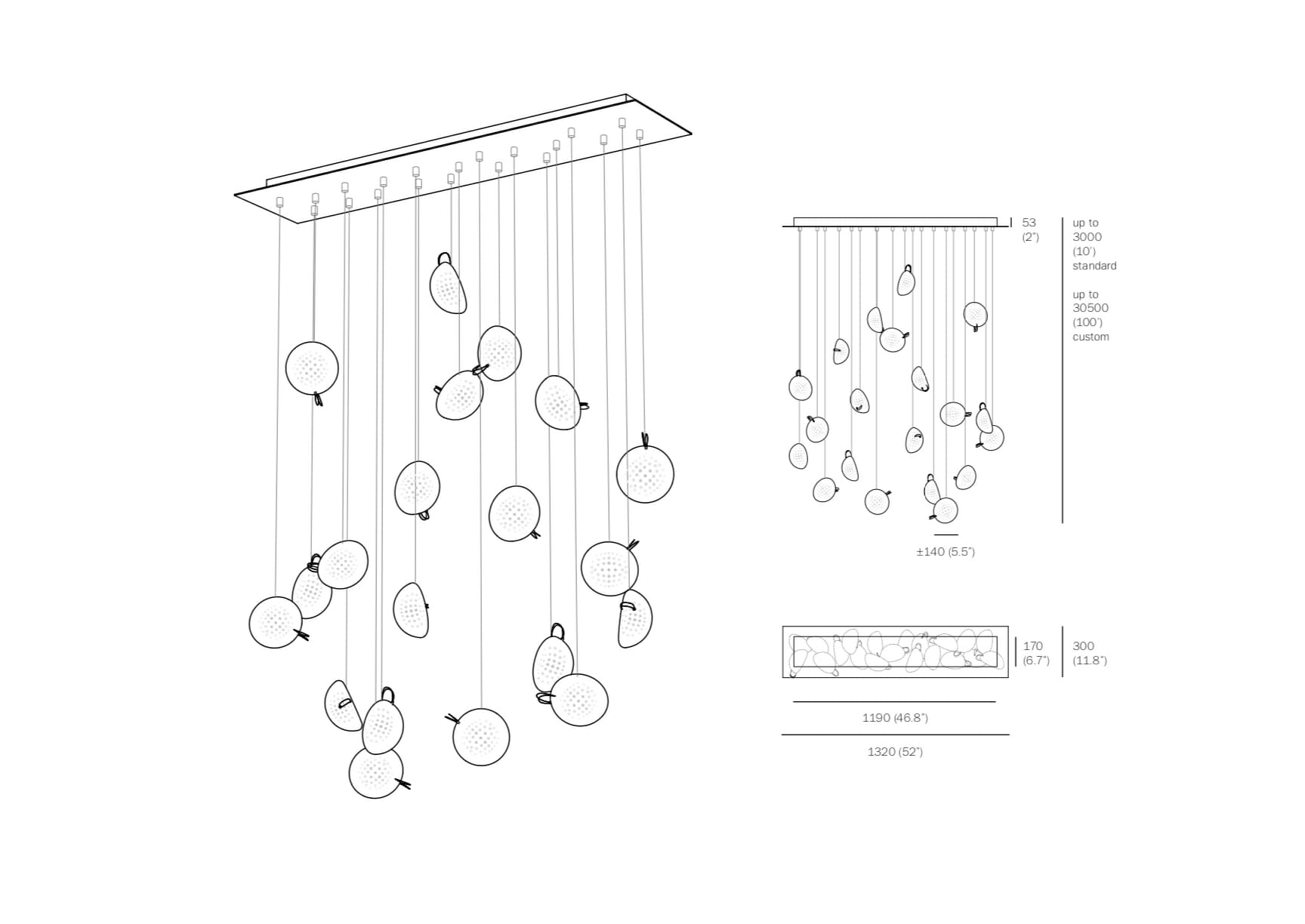 76.20 is a random configuration of thirty-six 76 pendants hung from a square, round or rectangular canopy. The drop lengths of the pendants are randomized between a client specified range of heights to variously cluster and scatter. The result is an ambient installation or field of light. Pendant lengths are pre-set during production and are not site-adjustable.