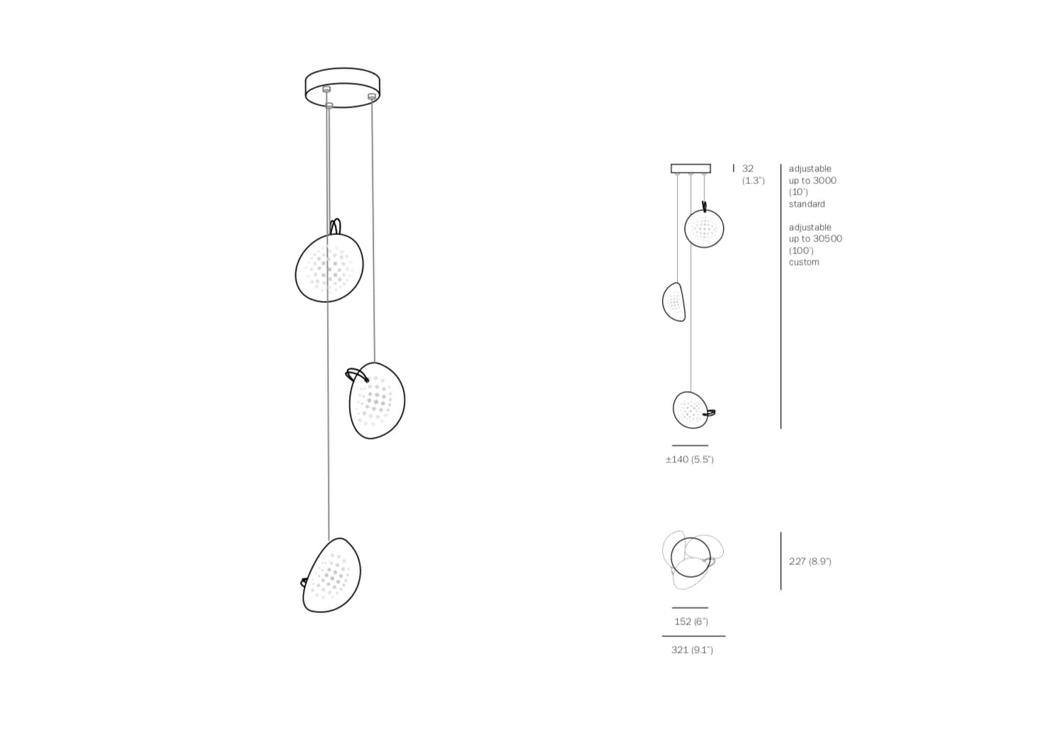 76.3 is a random configuration of three 76 pendants hung from a round canopy. The pendants are designed to hang in a random configuration, the result is an ambient installation or field of light. The pendant drop lengths on this light fixture are adjustable up to the specified maximum.
