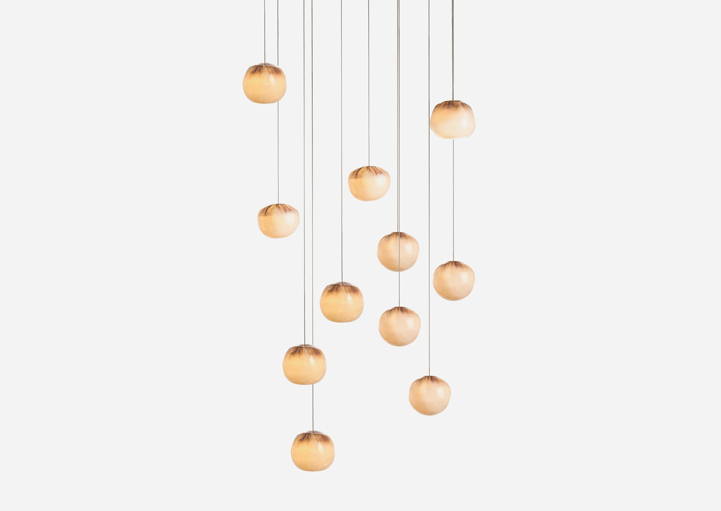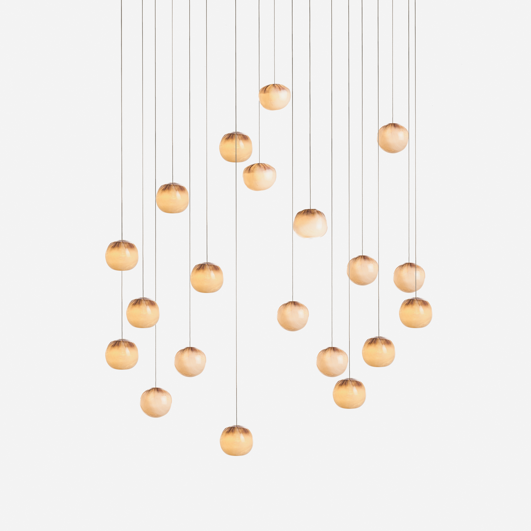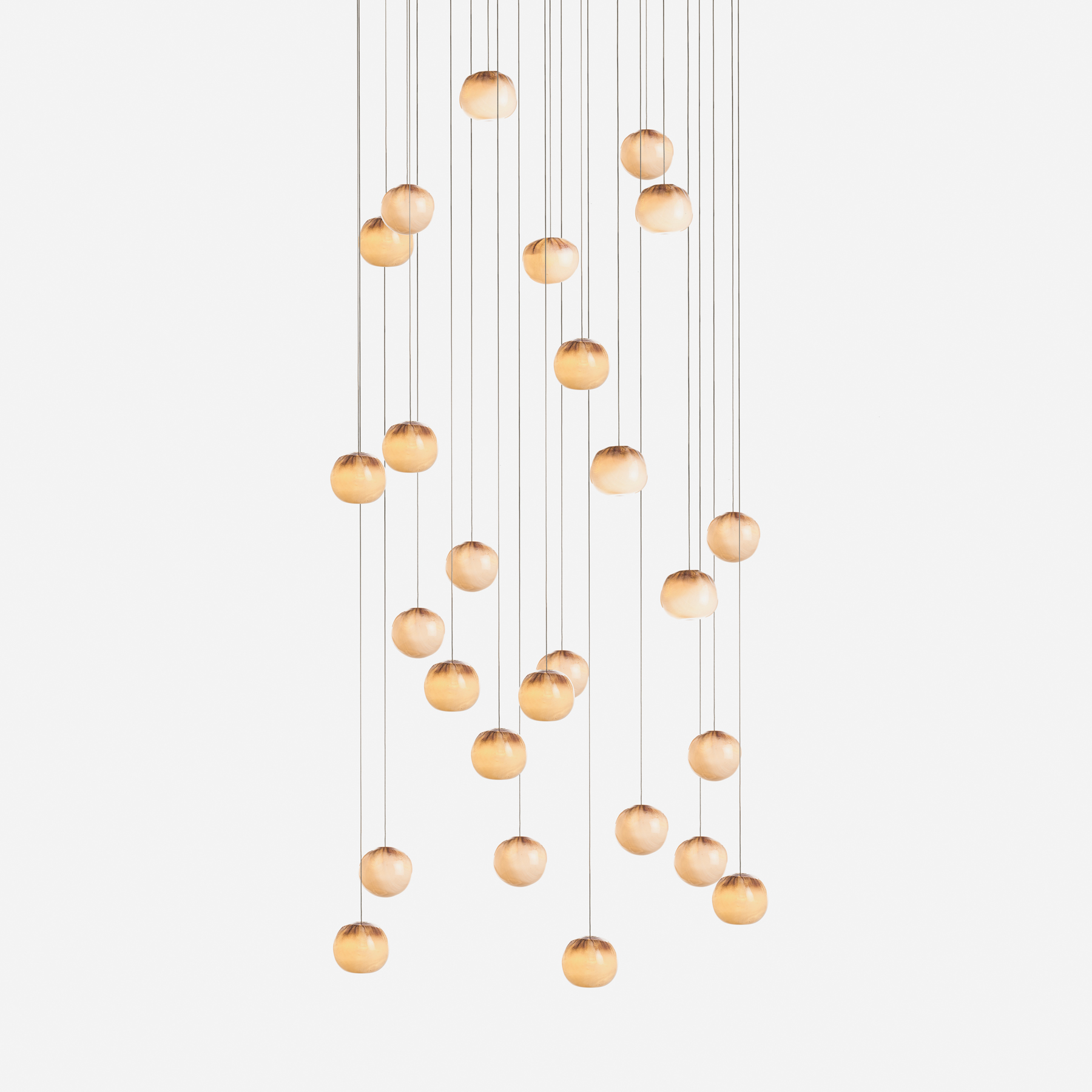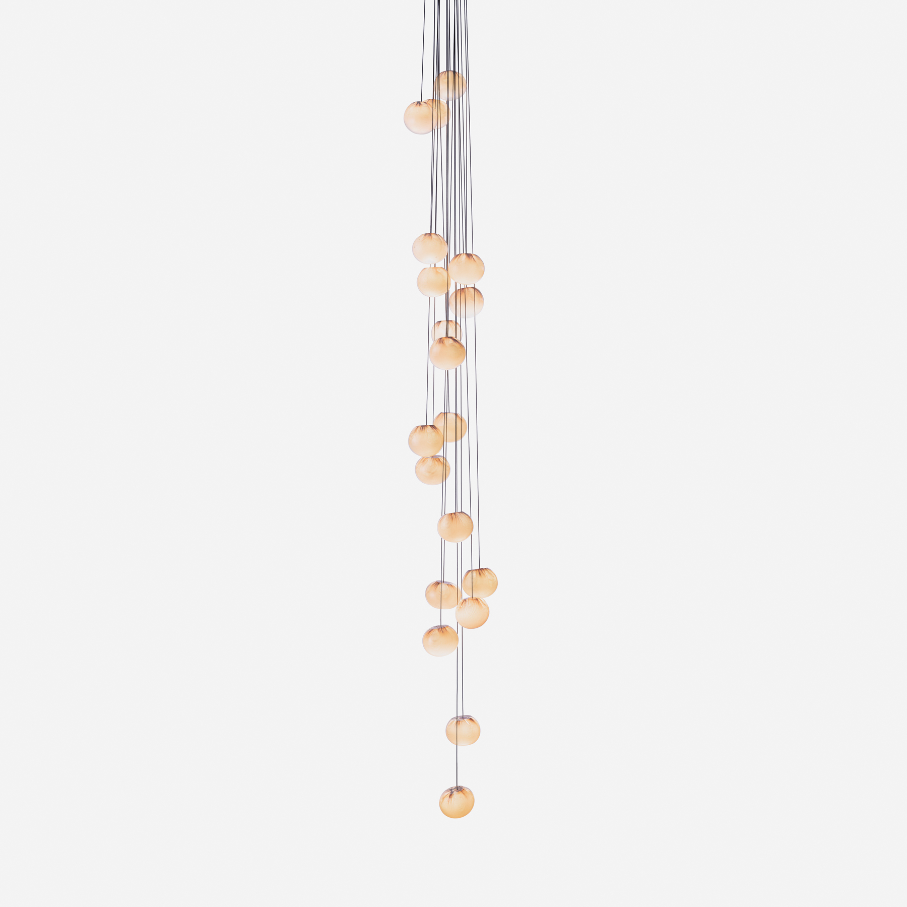 84.11 is a random configuration of eleven 84 pendants hung from a square or rectangle canopy. The drop lengths of the pendants are randomized between a client specified range of heights to variously cluster and scatter. The result is an ambient installation or field of light. A white glass bubble is captured inside a fi ne copper mesh basket and then plunged into hot clear glass. Air is blown into the matrix to gently push the white glass through the mesh, creating a delicate pillowed form that is suspended inside the thick outer layer of clear glass. Sometimes the copper mesh basket folds and crinkles, adding specificity to each piece.
