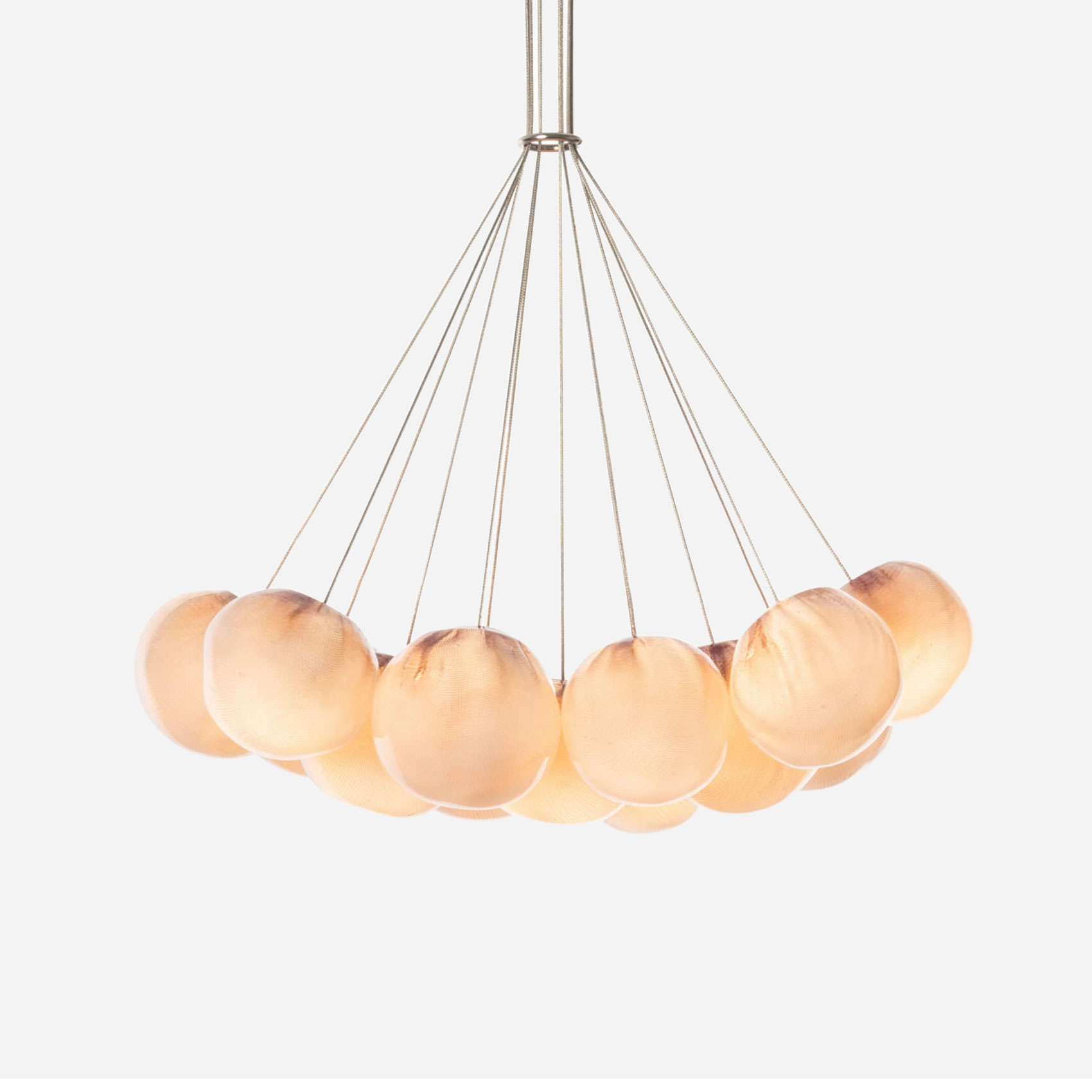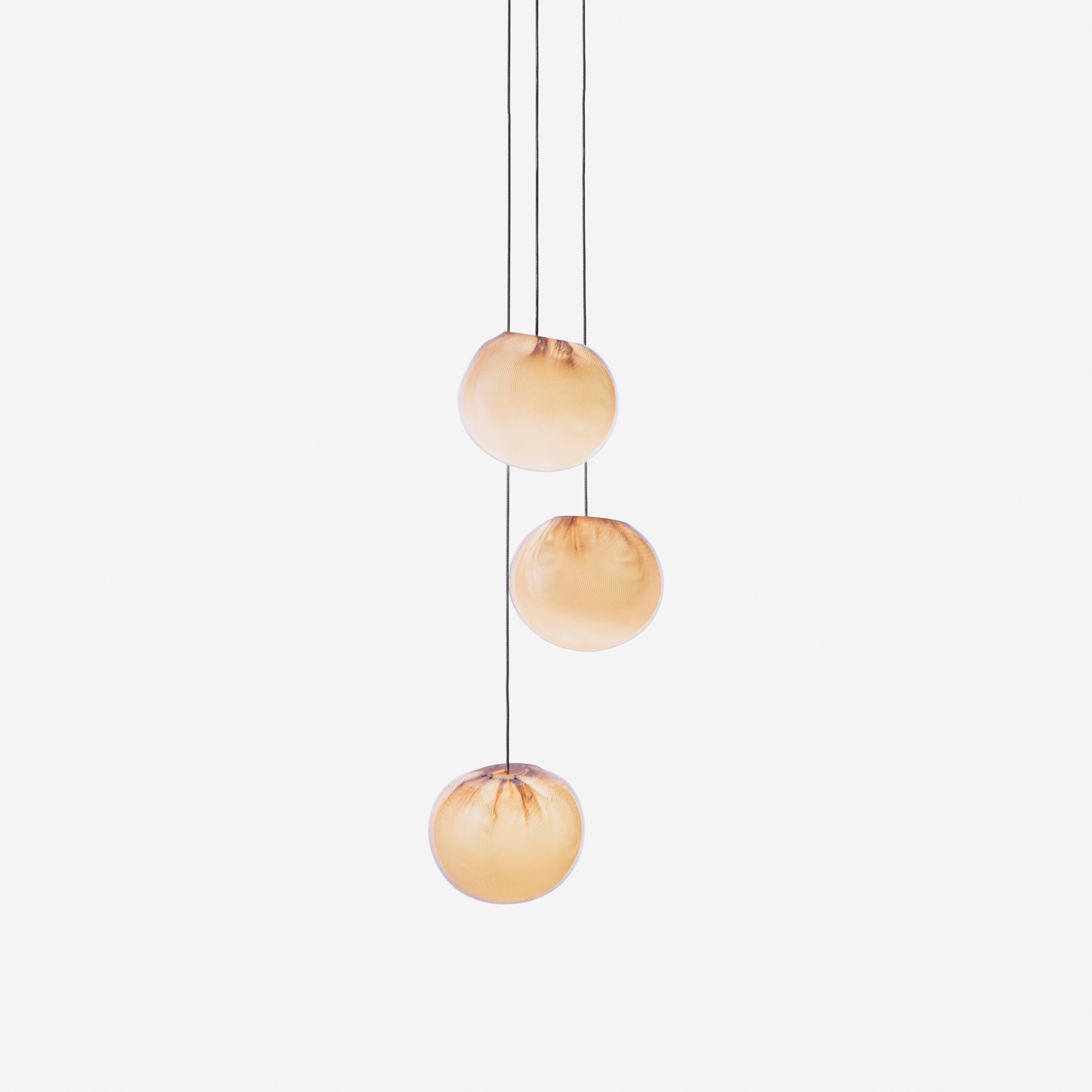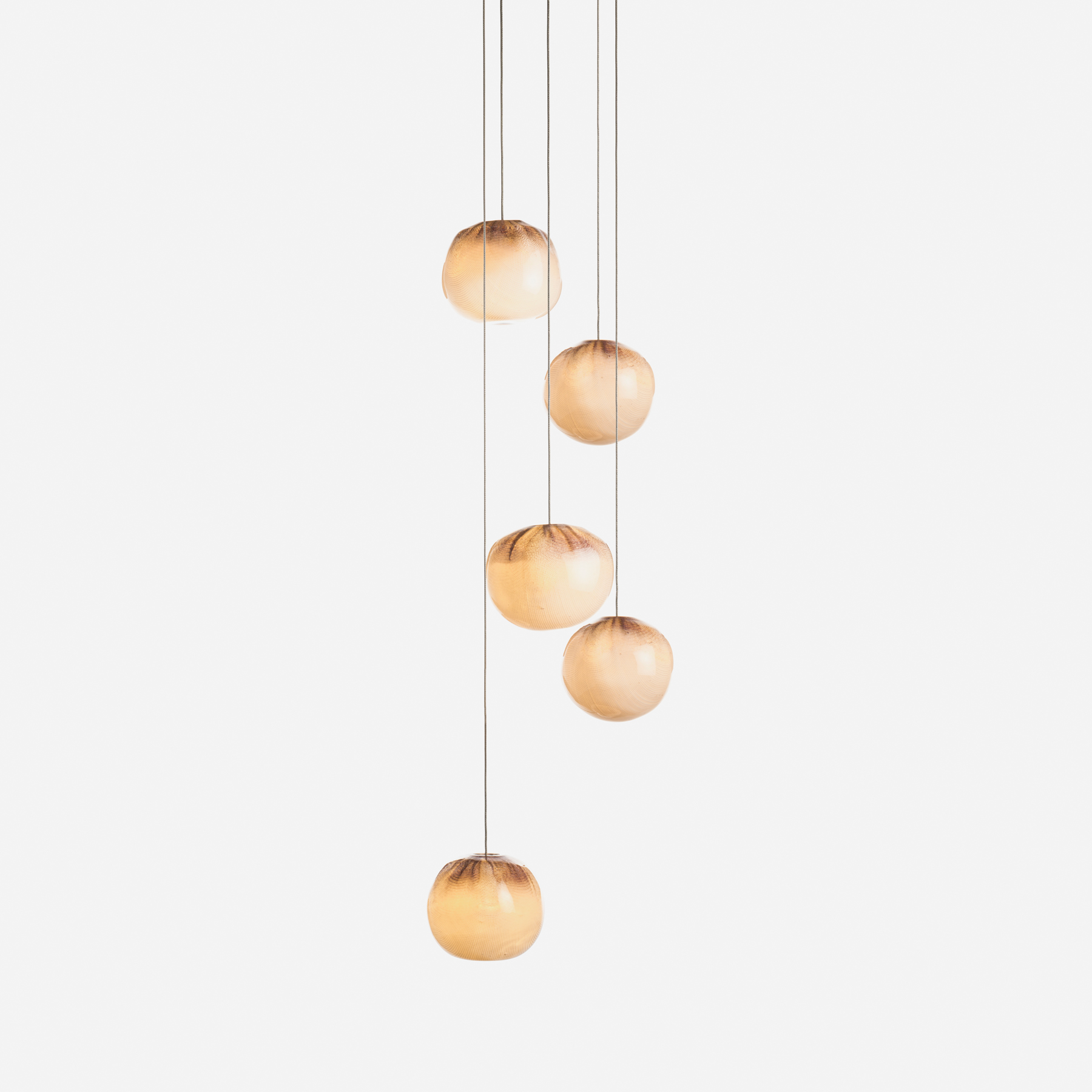 84.11 is a random configuration of eleven 84 pendants hung from a square or rectangle canopy. The drop lengths of the pendants are randomized between a client specified range of heights to variously cluster and scatter. The result is an ambient installation or field of light. A white glass bubble is captured inside a fi ne copper mesh basket and then plunged into hot clear glass. Air is blown into the matrix to gently push the white glass through the mesh, creating a delicate pillowed form that is suspended inside the thick outer layer of clear glass. Sometimes the copper mesh basket folds and crinkles, adding specificity to each piece.