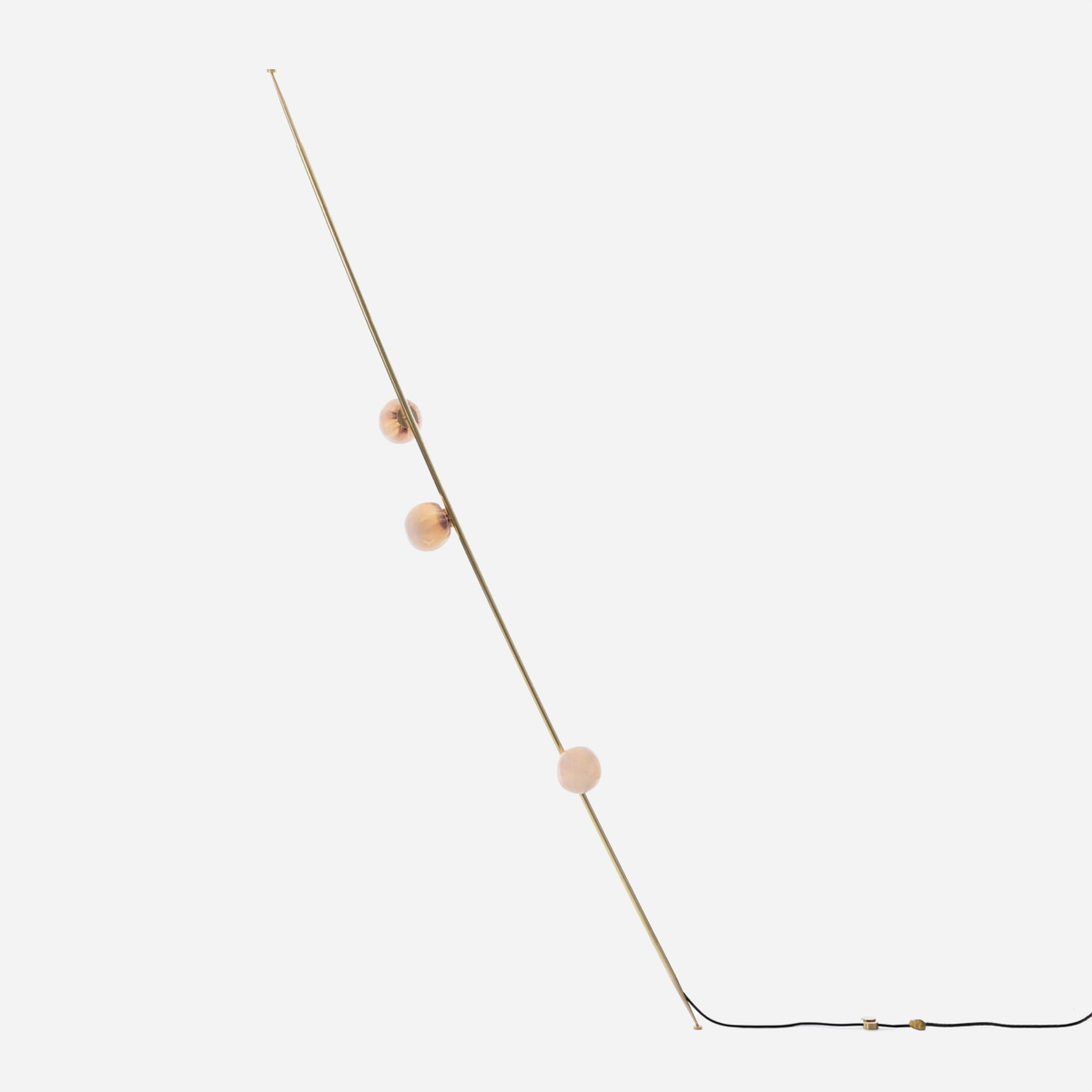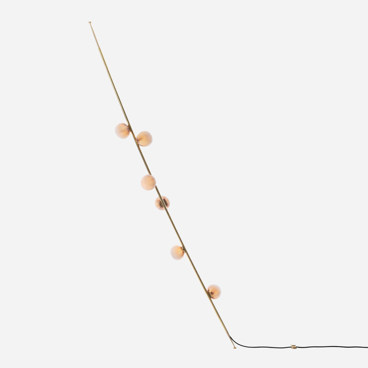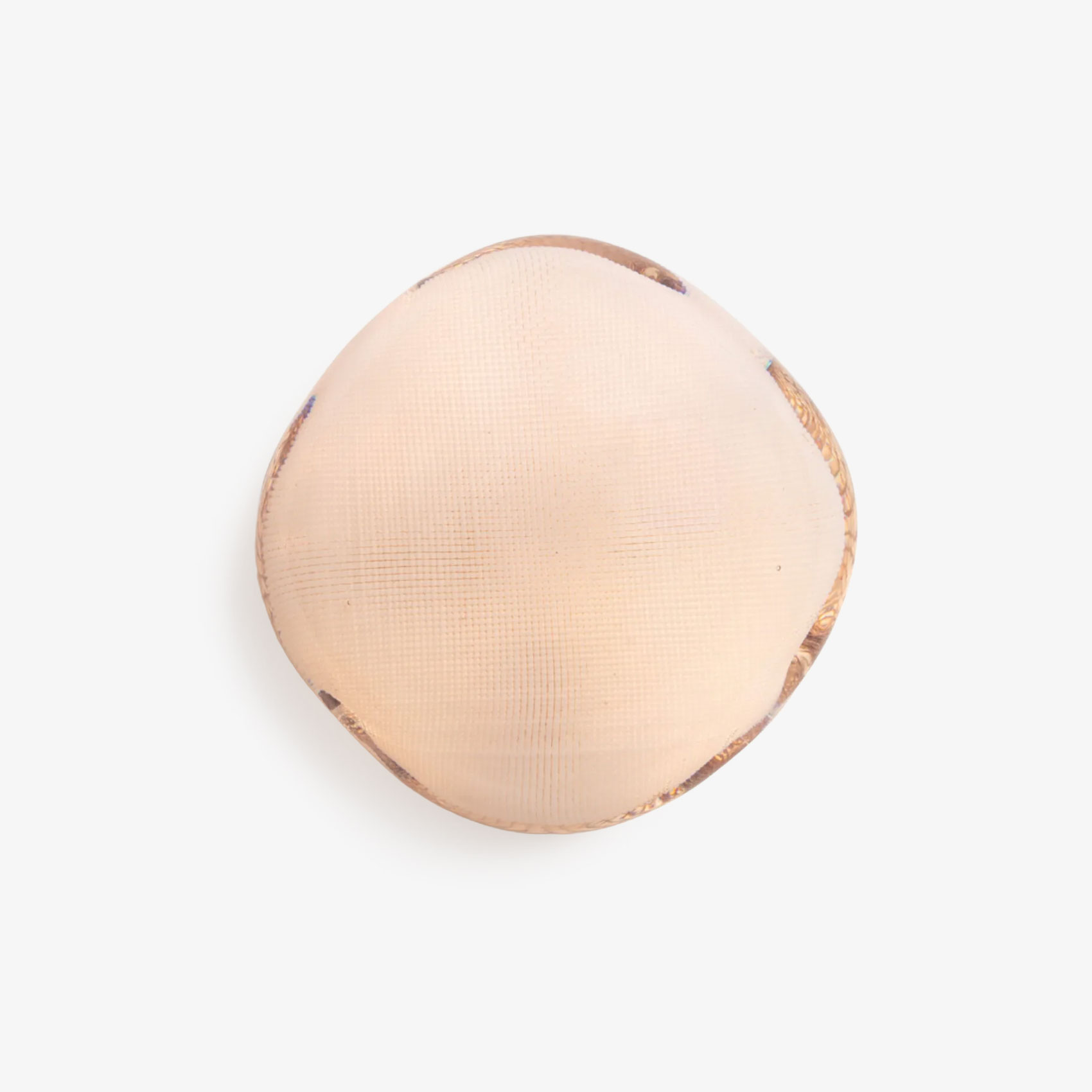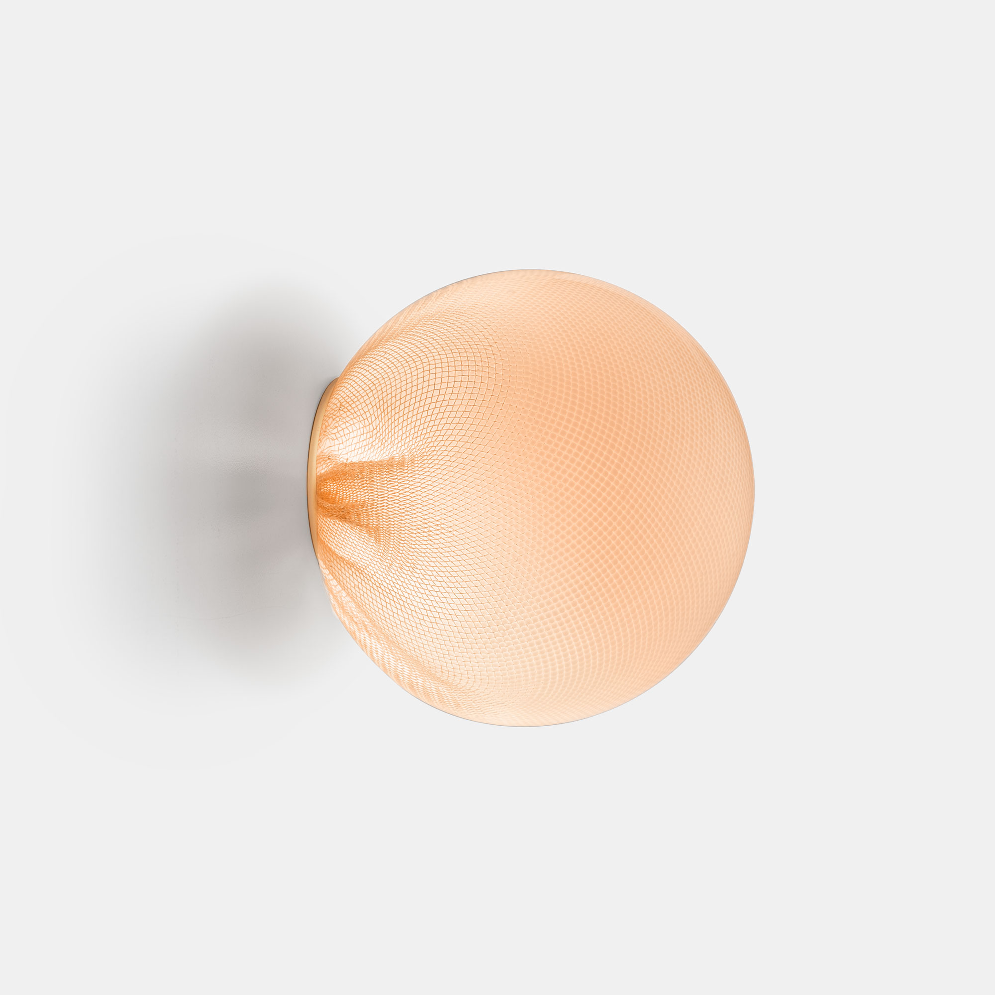 84.11 is a random configuration of eleven 84 pendants hung from a square or rectangle canopy. The drop lengths of the pendants are randomized between a client specified range of heights to variously cluster and scatter. The result is an ambient installation or field of light. A white glass bubble is captured inside a fi ne copper mesh basket and then plunged into hot clear glass. Air is blown into the matrix to gently push the white glass through the mesh, creating a delicate pillowed form that is suspended inside the thick outer layer of clear glass. Sometimes the copper mesh basket folds and crinkles, adding specificity to each piece.