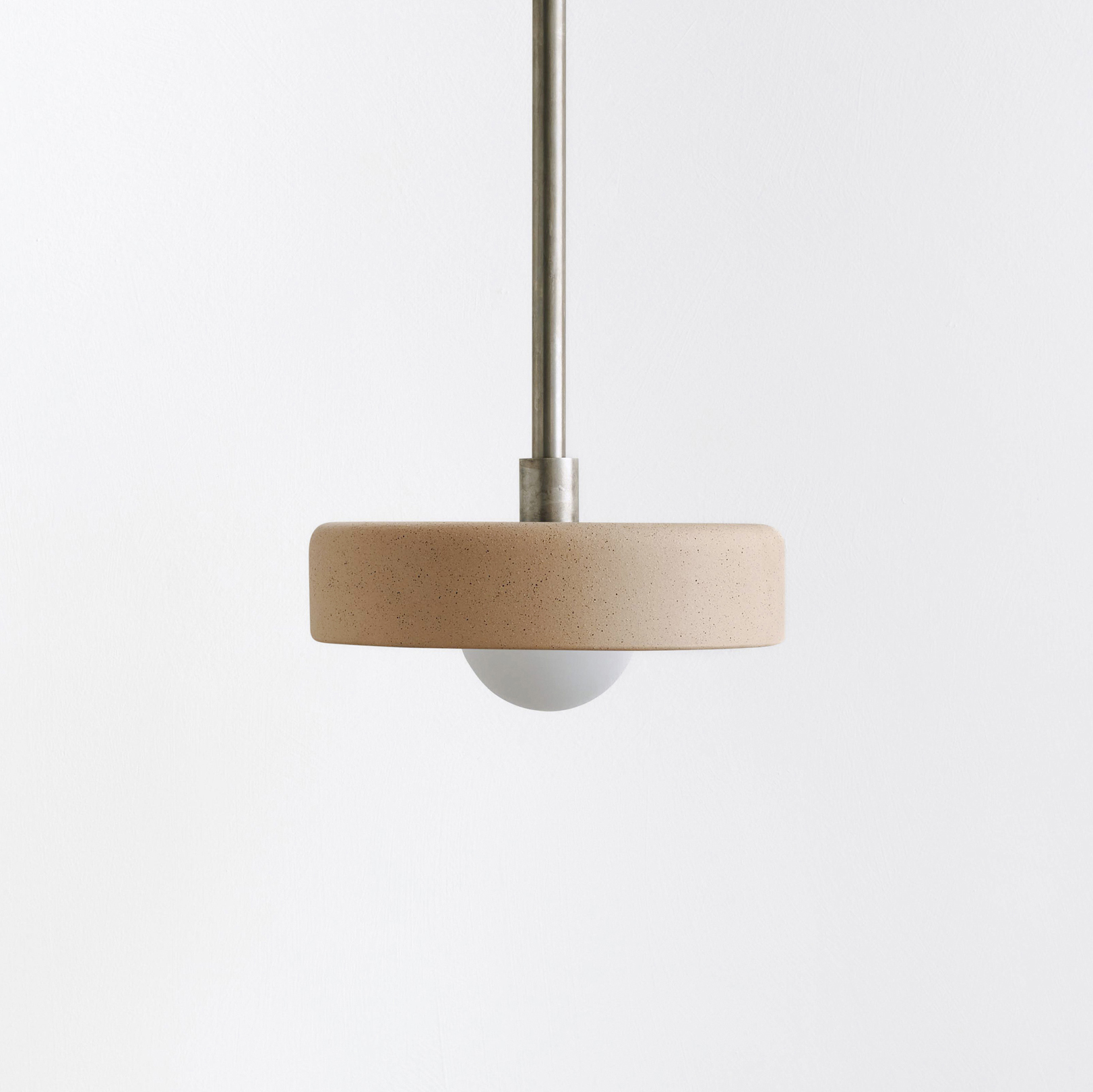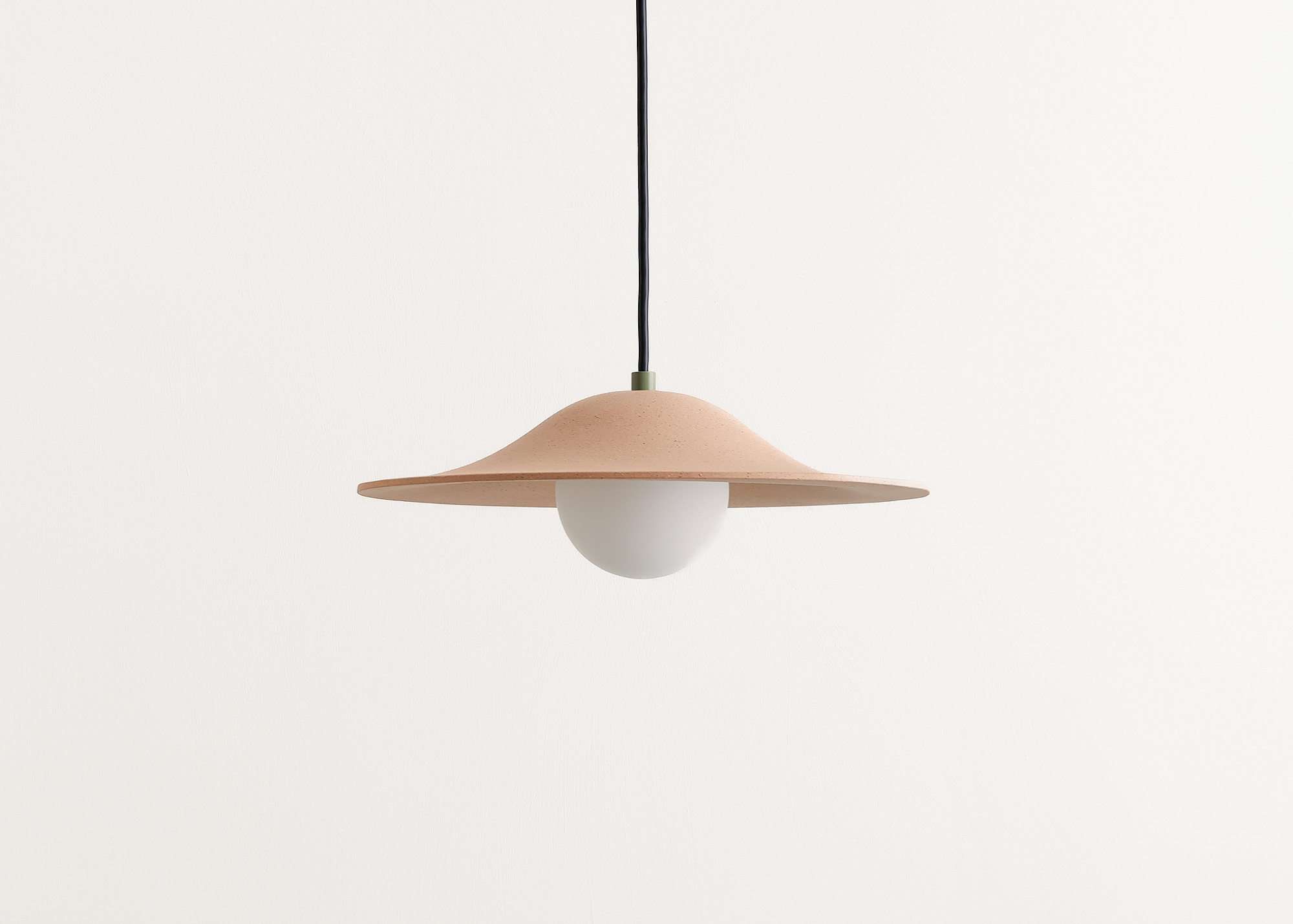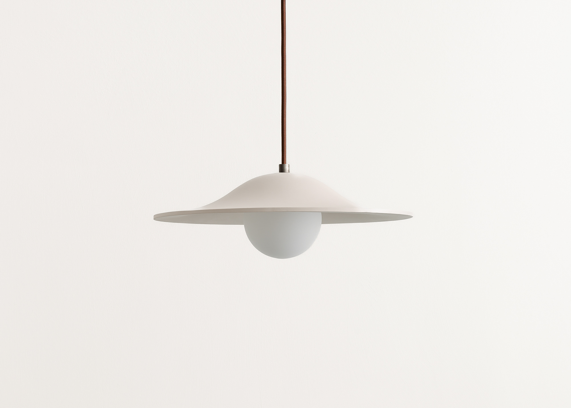 An otherworldly pendant whose hovering central form hints at the deep unknown. Made by manually draping clay slabs over press molds, each shade pairs a uniform shape with a raw, textured surface that’s innately one-of-a-kind.