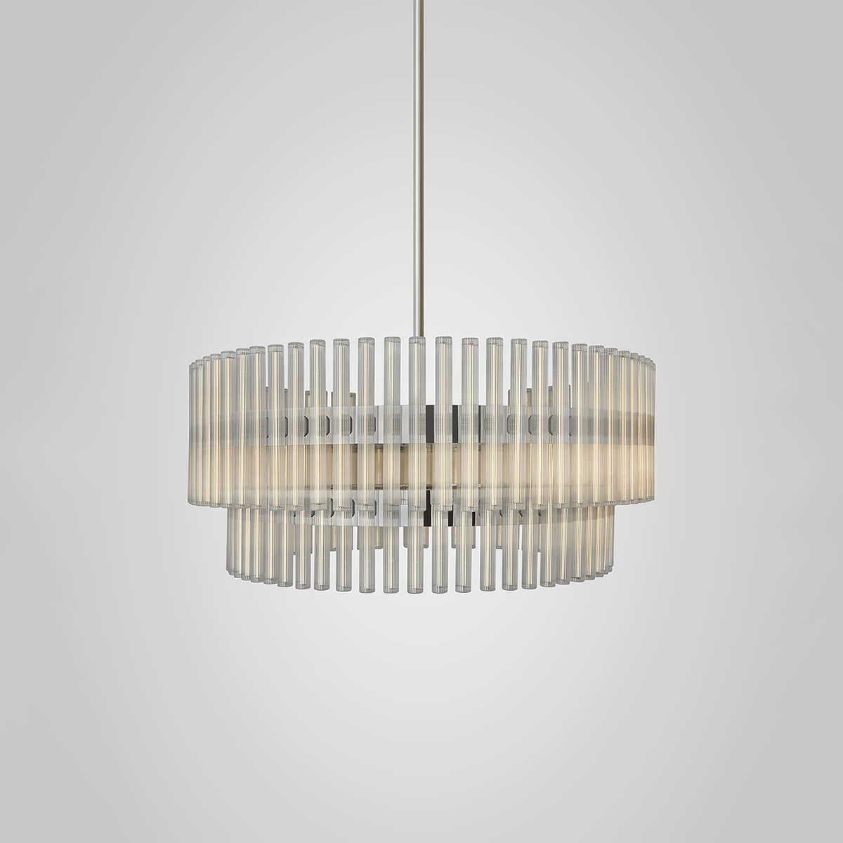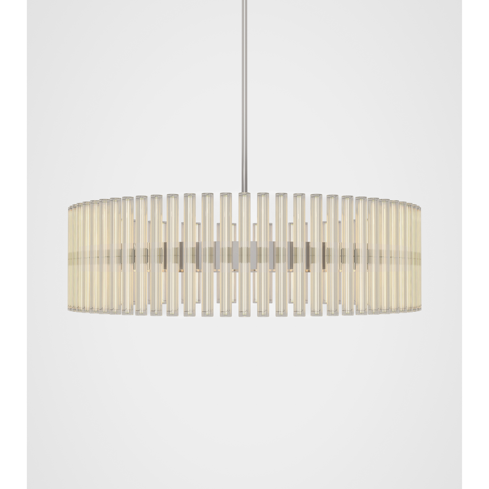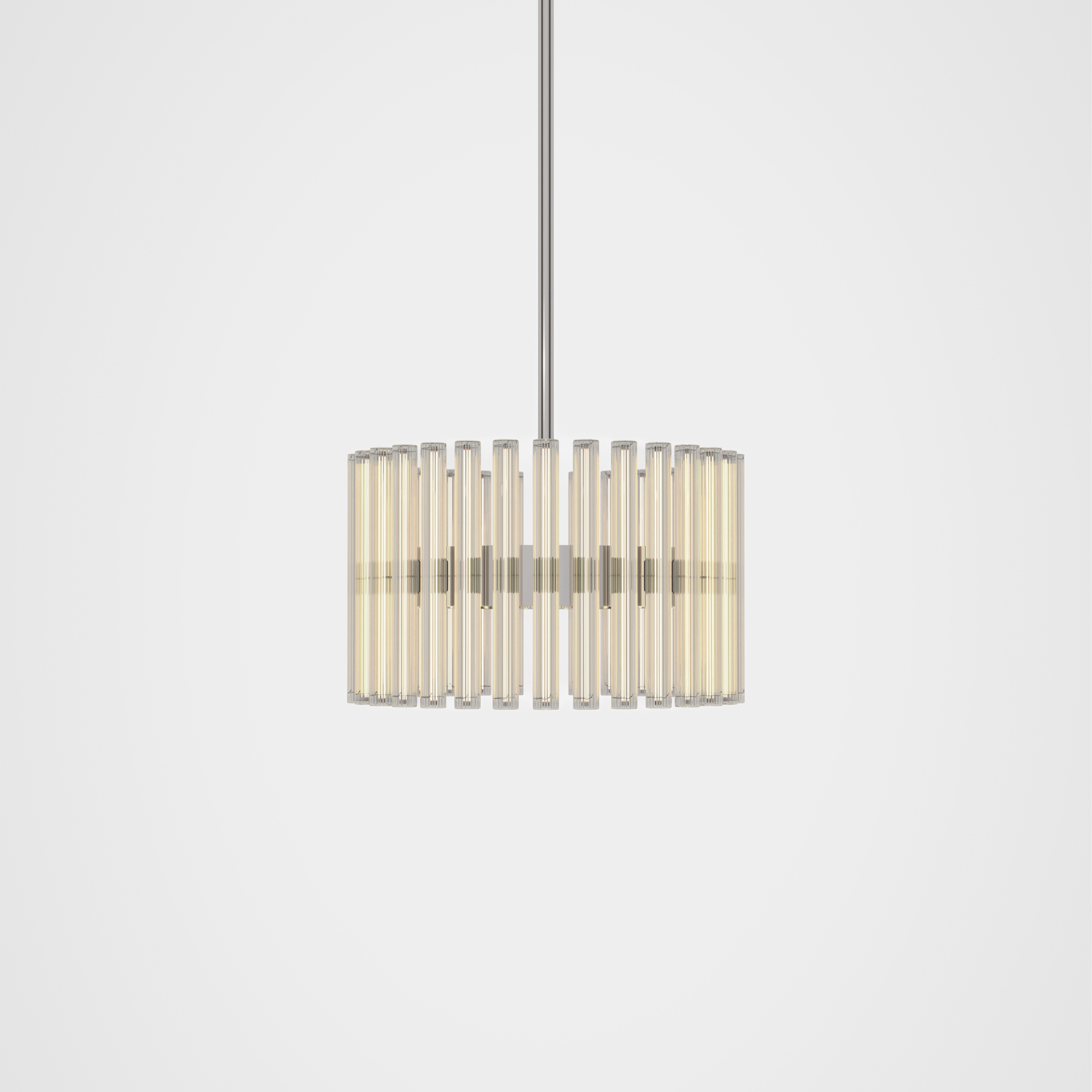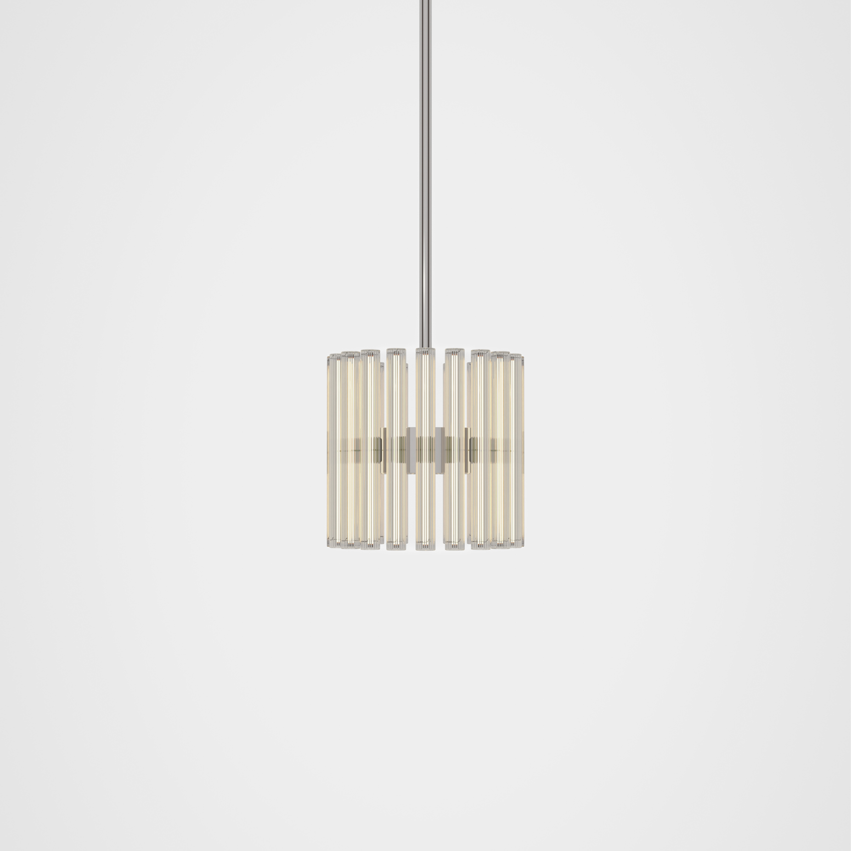 A chandelier of multiple adaptations which projects layers of ethereal rings of light created from linear LED light bulbs. Created and produced by Lee Broom, the hand blown glass bulbs contain a perpendicular LED filament which refracts against the vertical lines of the reeded glass. En masse and reflecting in the rings, the overall effect ensues a glowing aura.