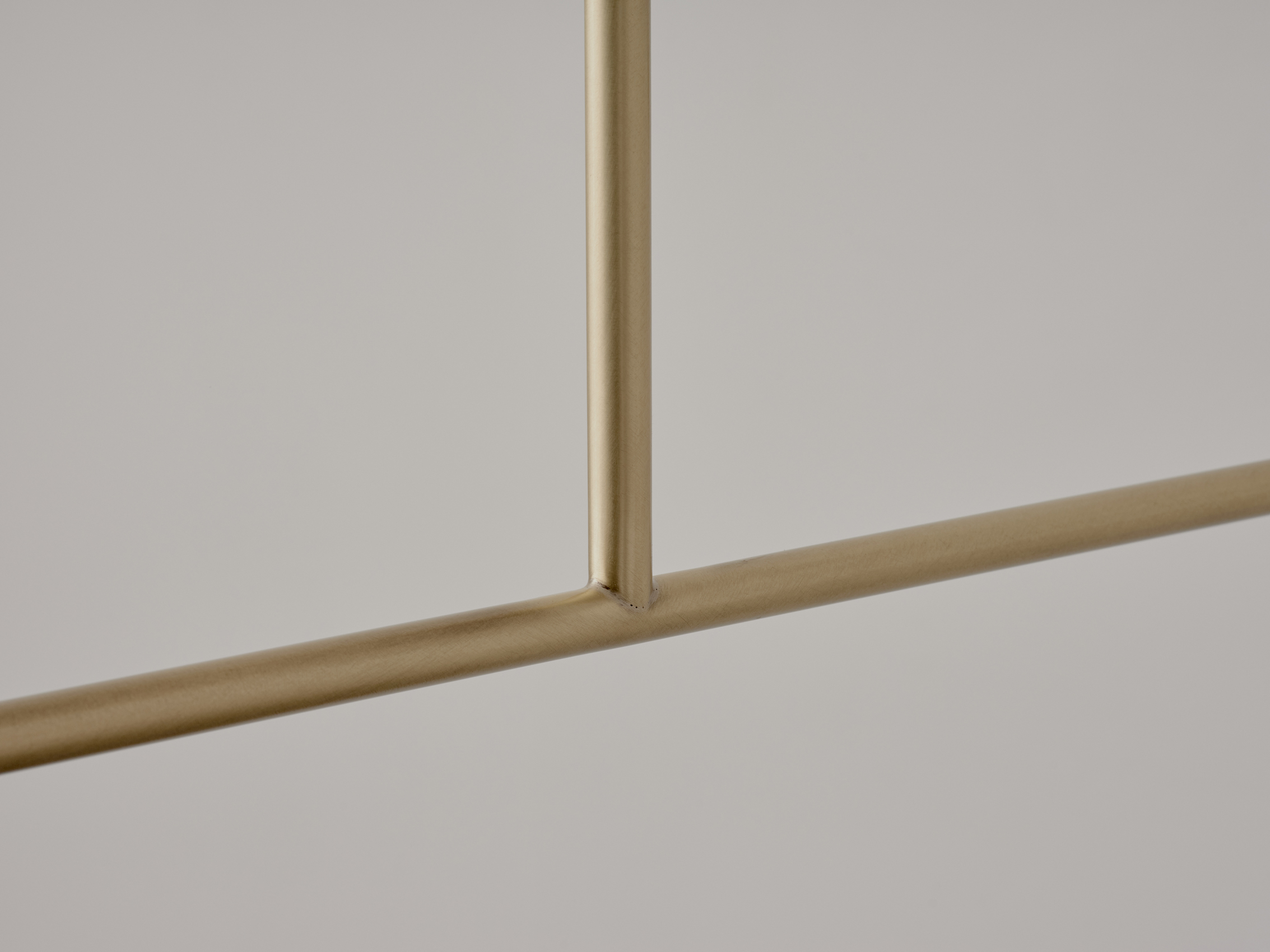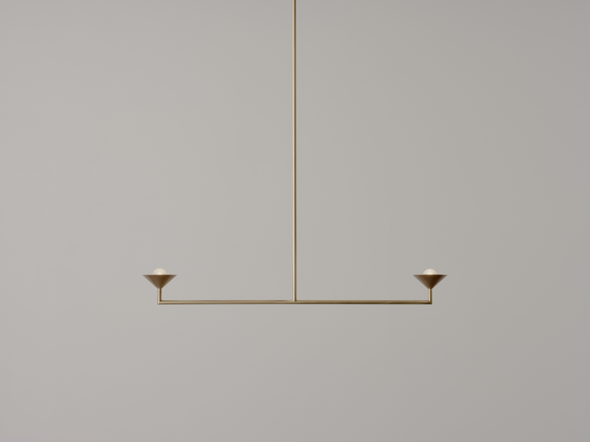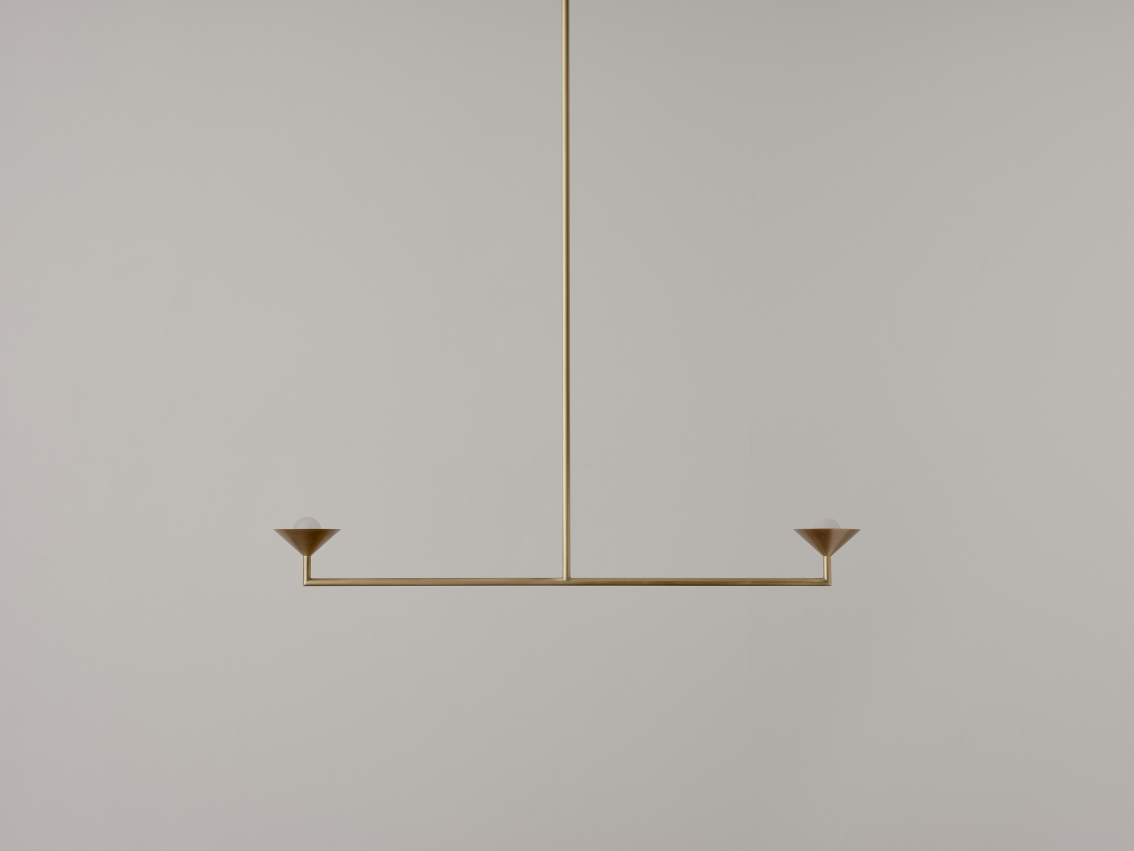 The Pyramid Scheme features tiered conical forms, punched vertically by a linear framework in a pragmatic take on spatial ornamentation. Baby Double Drop is a small, linear chandelier with up-facing shades.