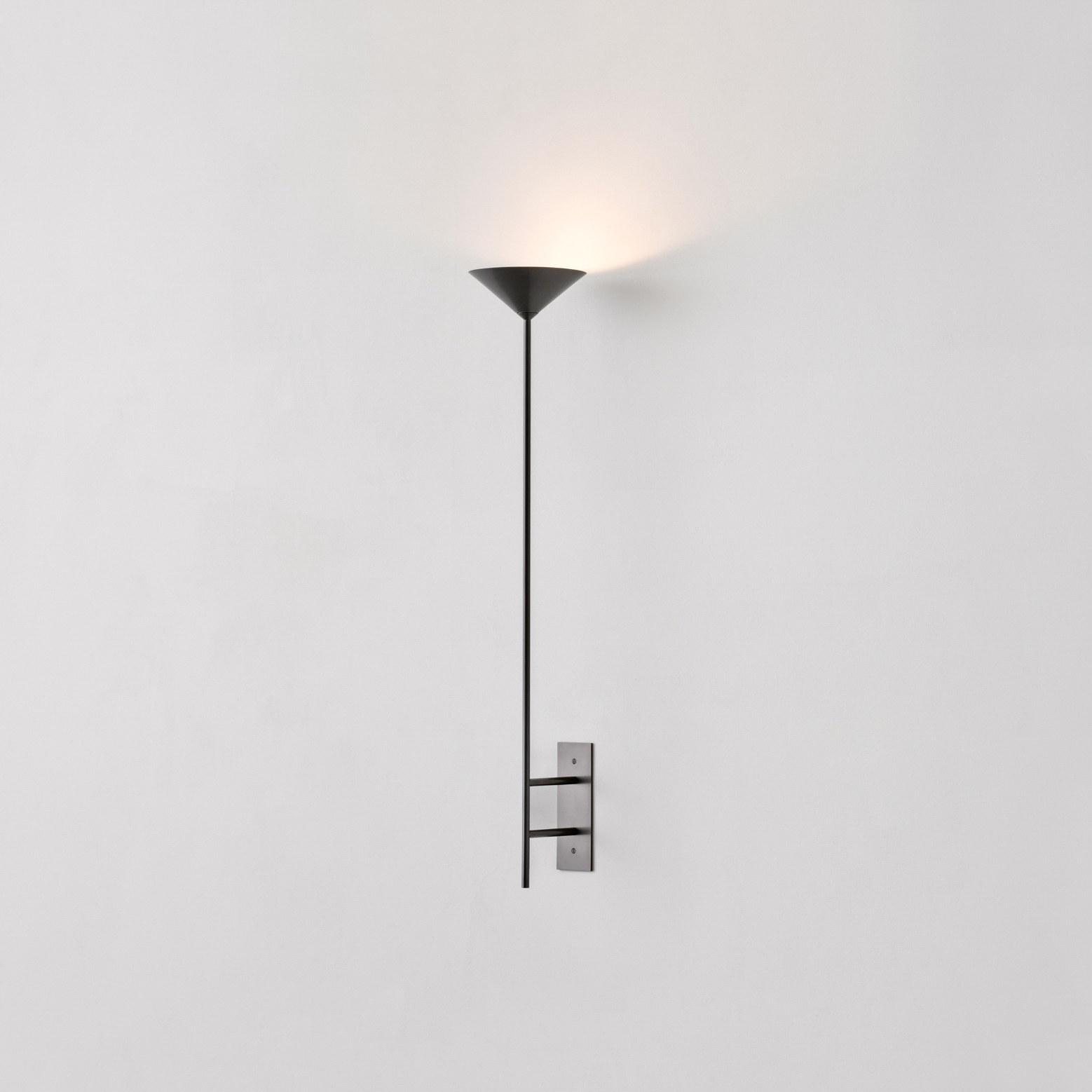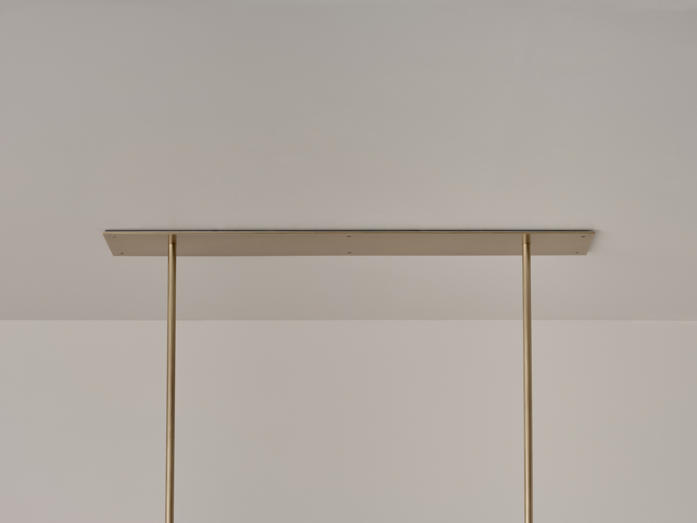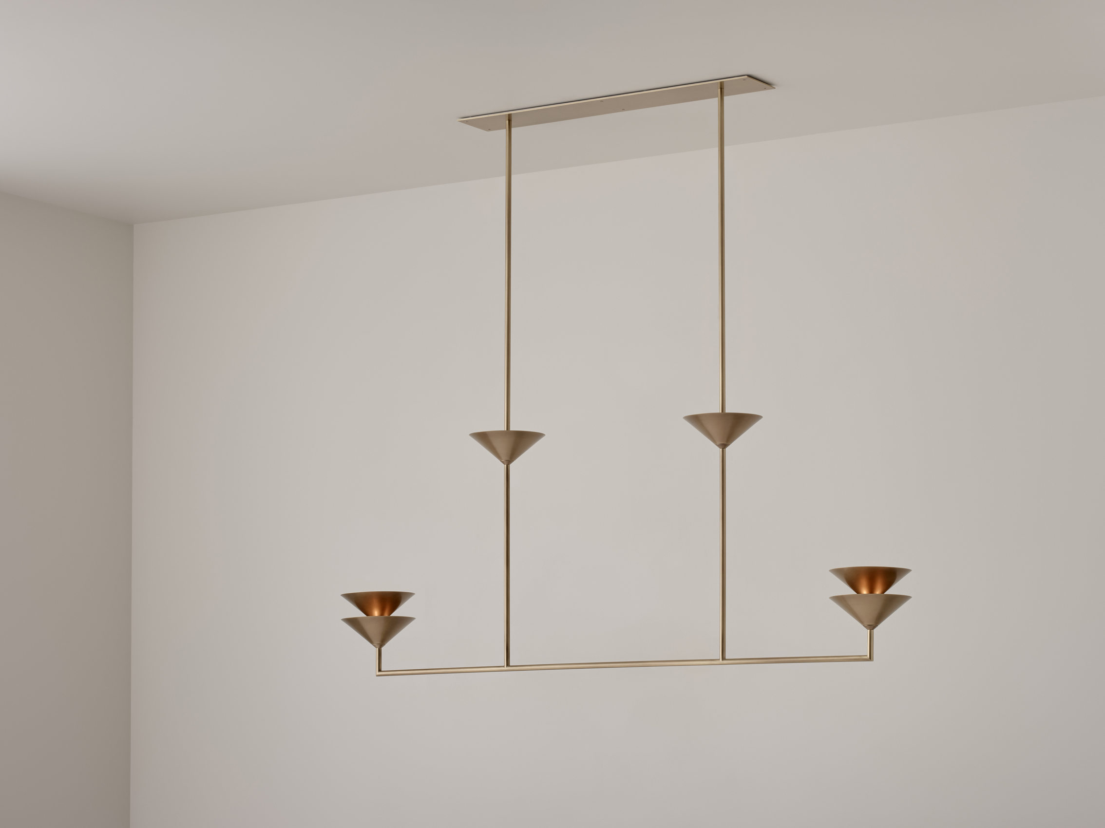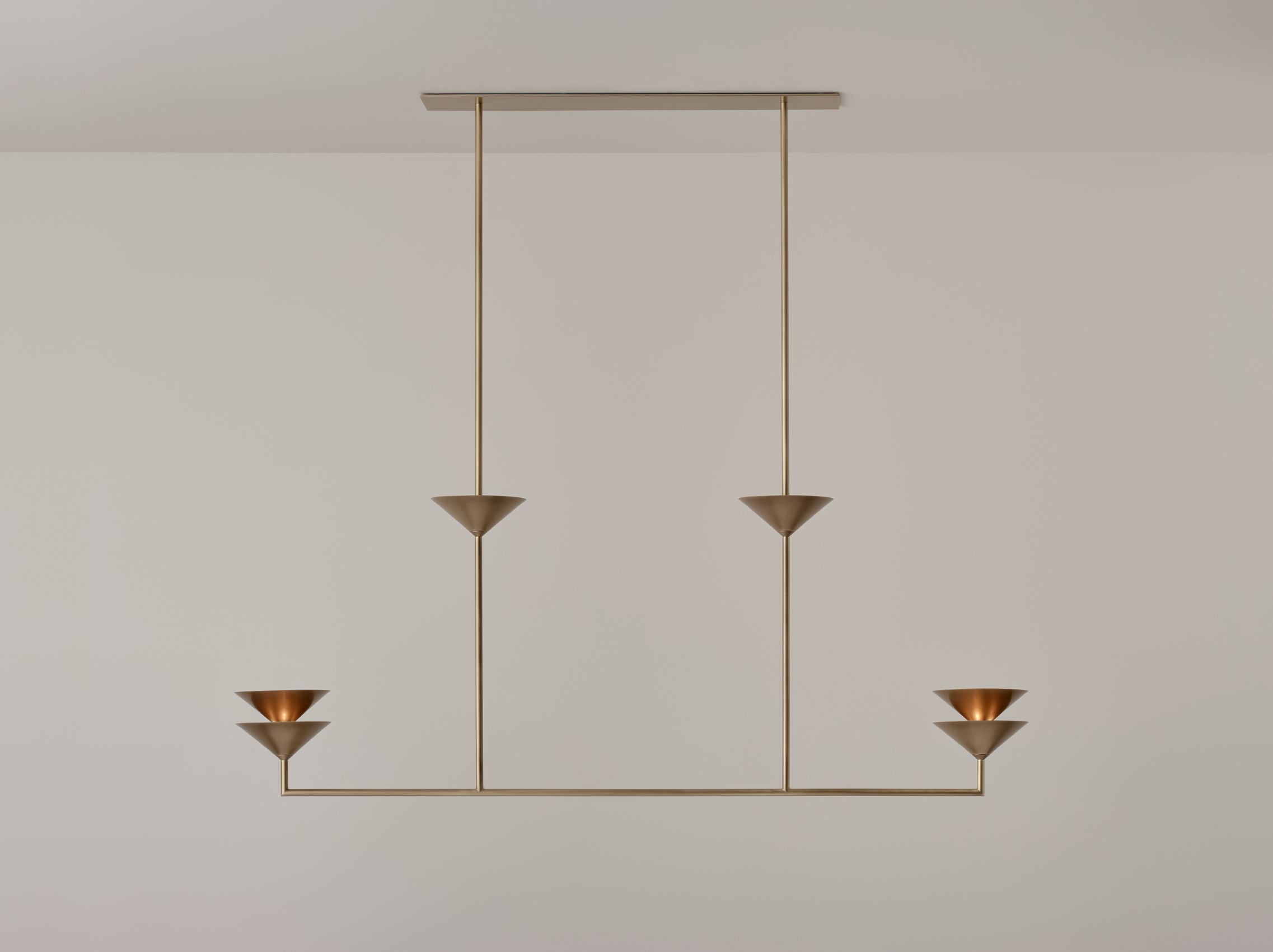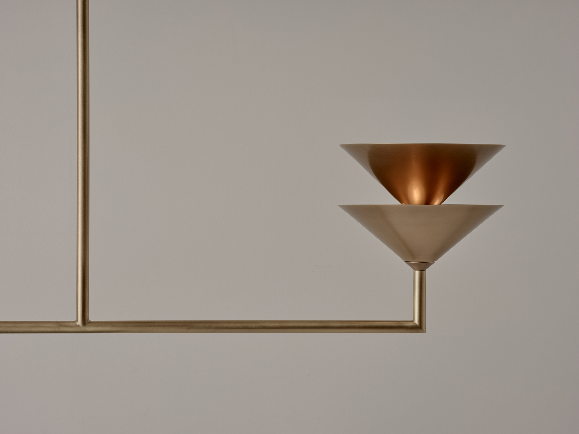 The Pyramid Scheme features tiered conical forms, punched vertically by a linear framework in a pragmatic take on spatial ornamentation. Balanced Stack is a linear chandelier, the shades capture and reflect light outwards and upwards.