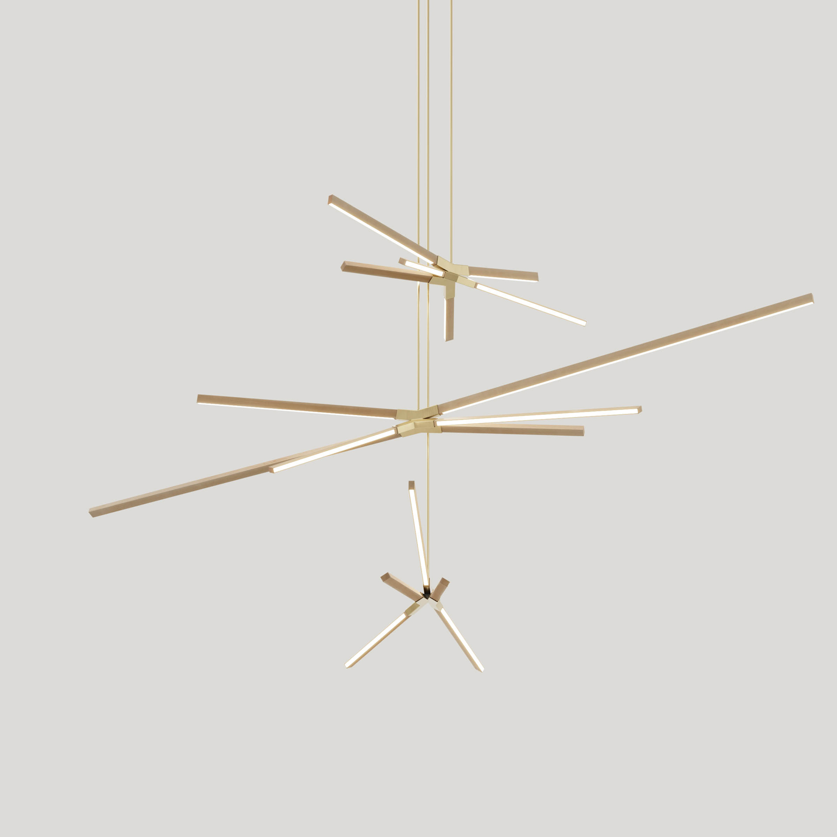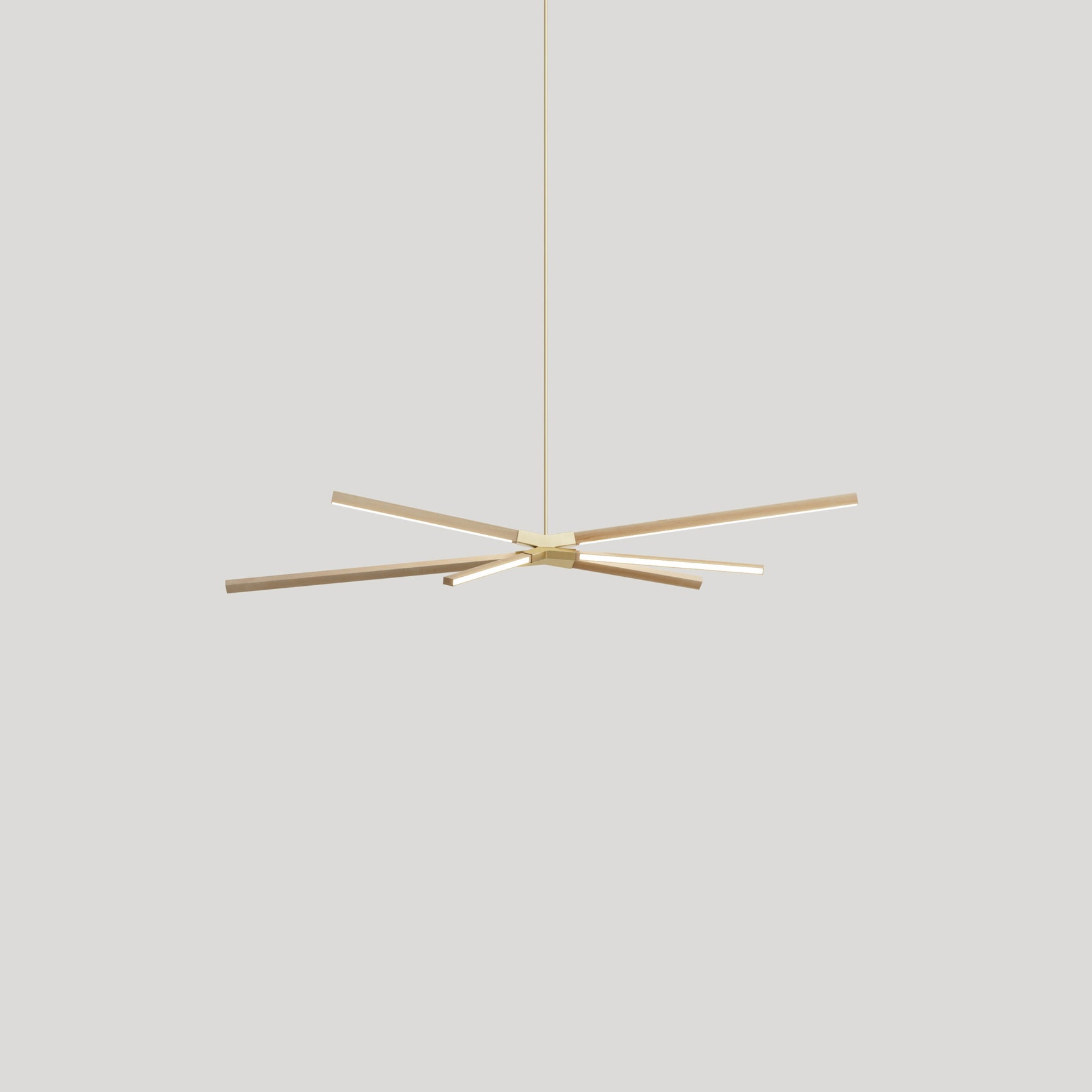 Skybang is comprised of 6 solid wood sticks of varying lengths held in place by a central steel socket and stem. It casts warm light in all directions, conjures the dynamic shape of abstract trees, and is commonly used alone or in clusters for both residential and commercial spaces. Span ranges from 5-10ft. Ships flat-packed.