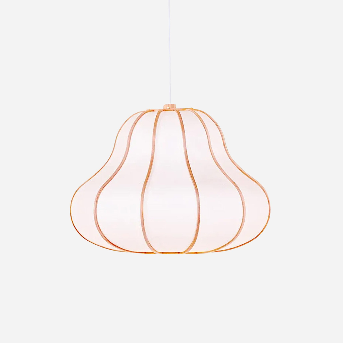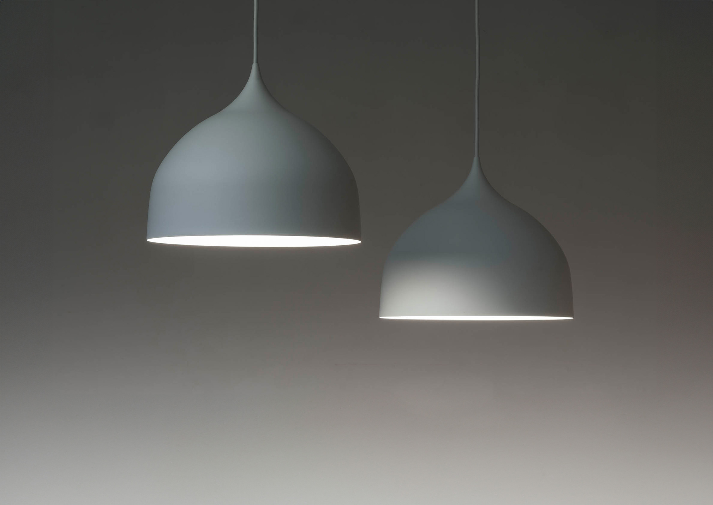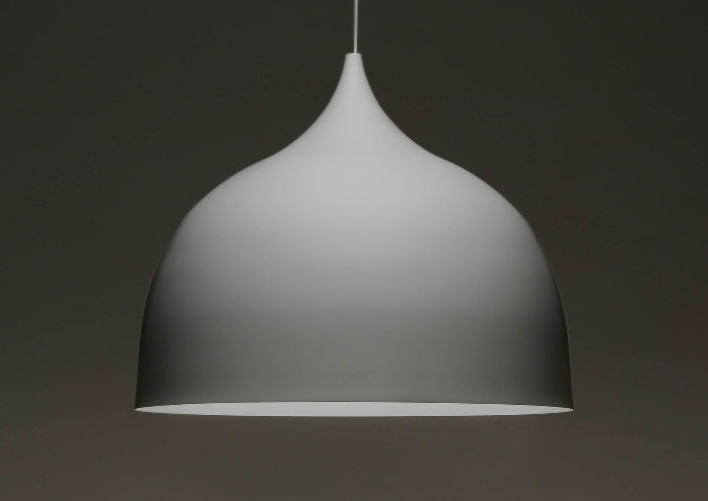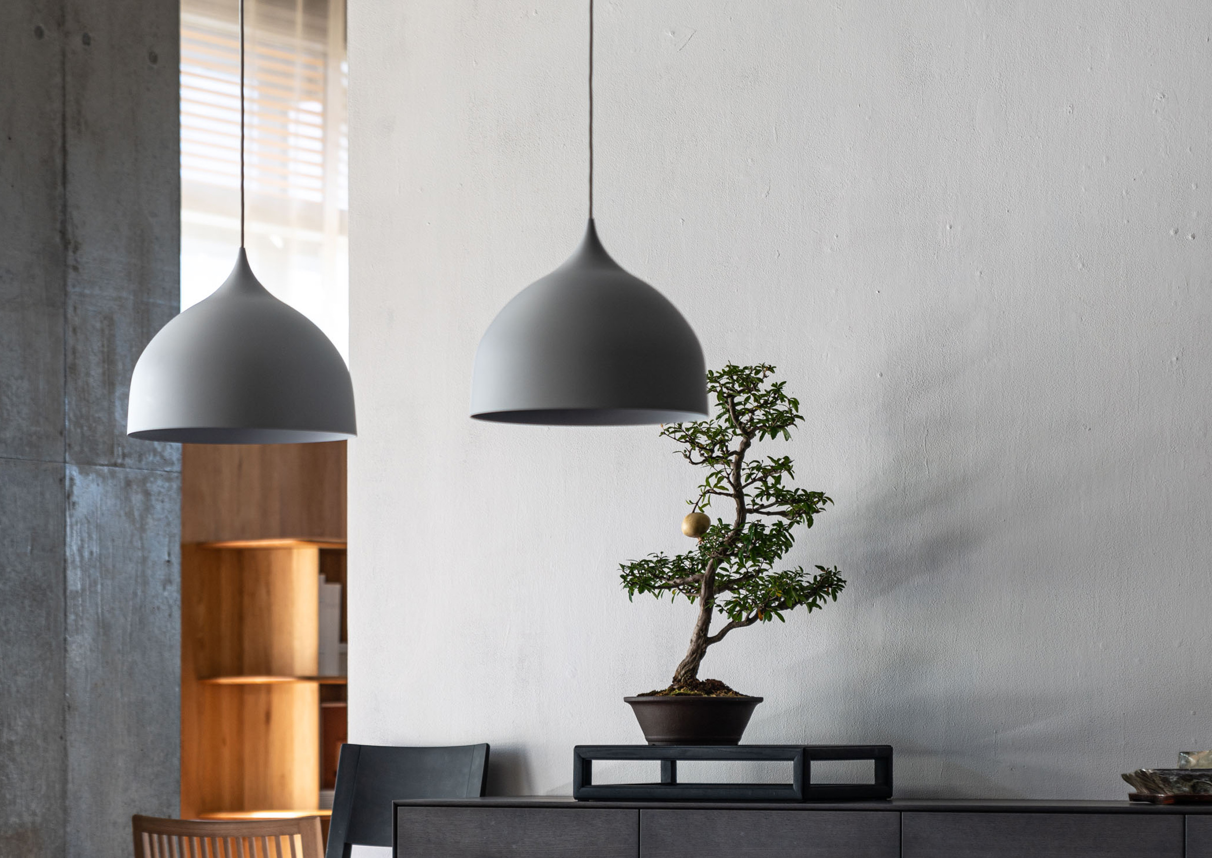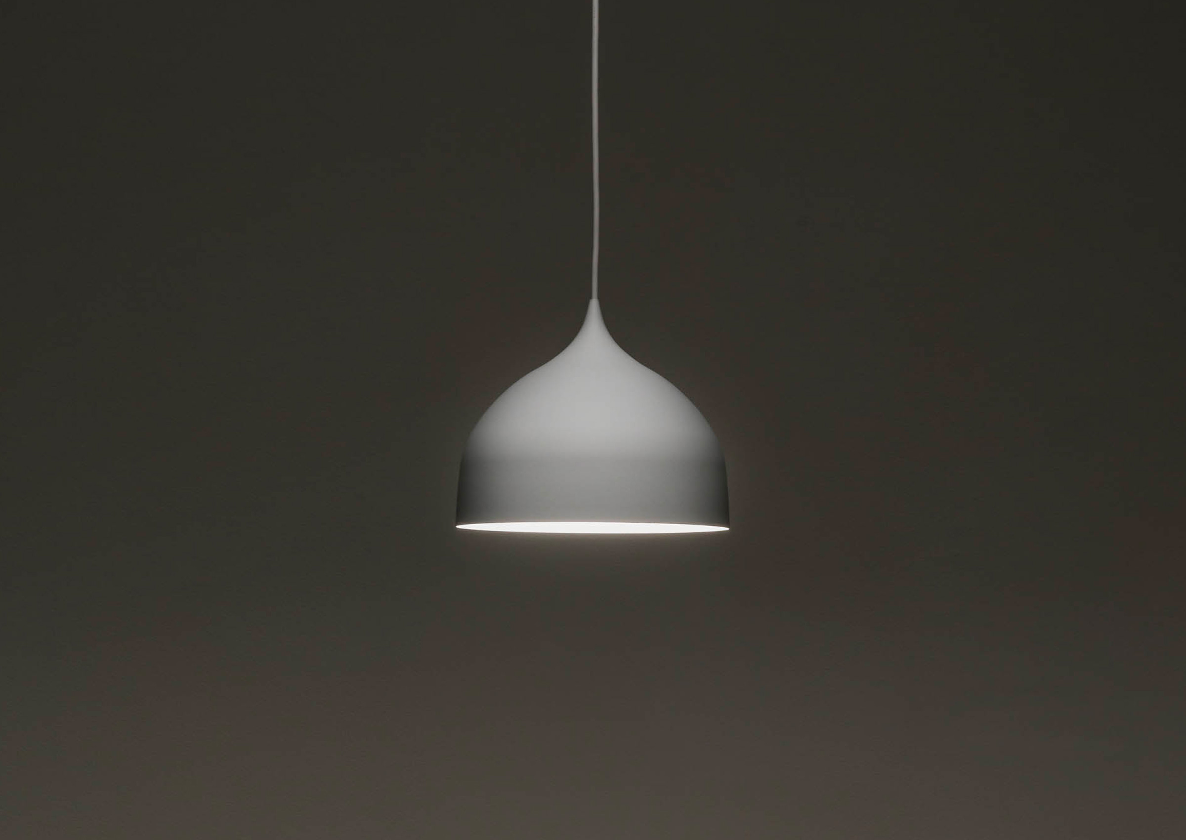 This pendant lighting is reminiscent of a neat, beautiful white porcelain vessel. We drew a carefree and shapely figure, evoking ceramics ground on a lathe. The surface of the shade is coated to have slight textural irregularities that lend an unglazed feel. The shade is formed through metal spinning technology in Edogawa, Tokyo. This is a manual metal processing technology in which a flat metal plate is rotated and pressed against a mould to cast a three-dimensional object of concentric circles. This technique is used in a wide variety of areas such as in the aerospace industry for the nose cone of rockets as well as parabolic antennas. Bisque in English can mean unglazed china. To give a texture resembling white unglazed china on the metal-spun aluminum surface, the thin and lightweight aluminum is finished by spray.