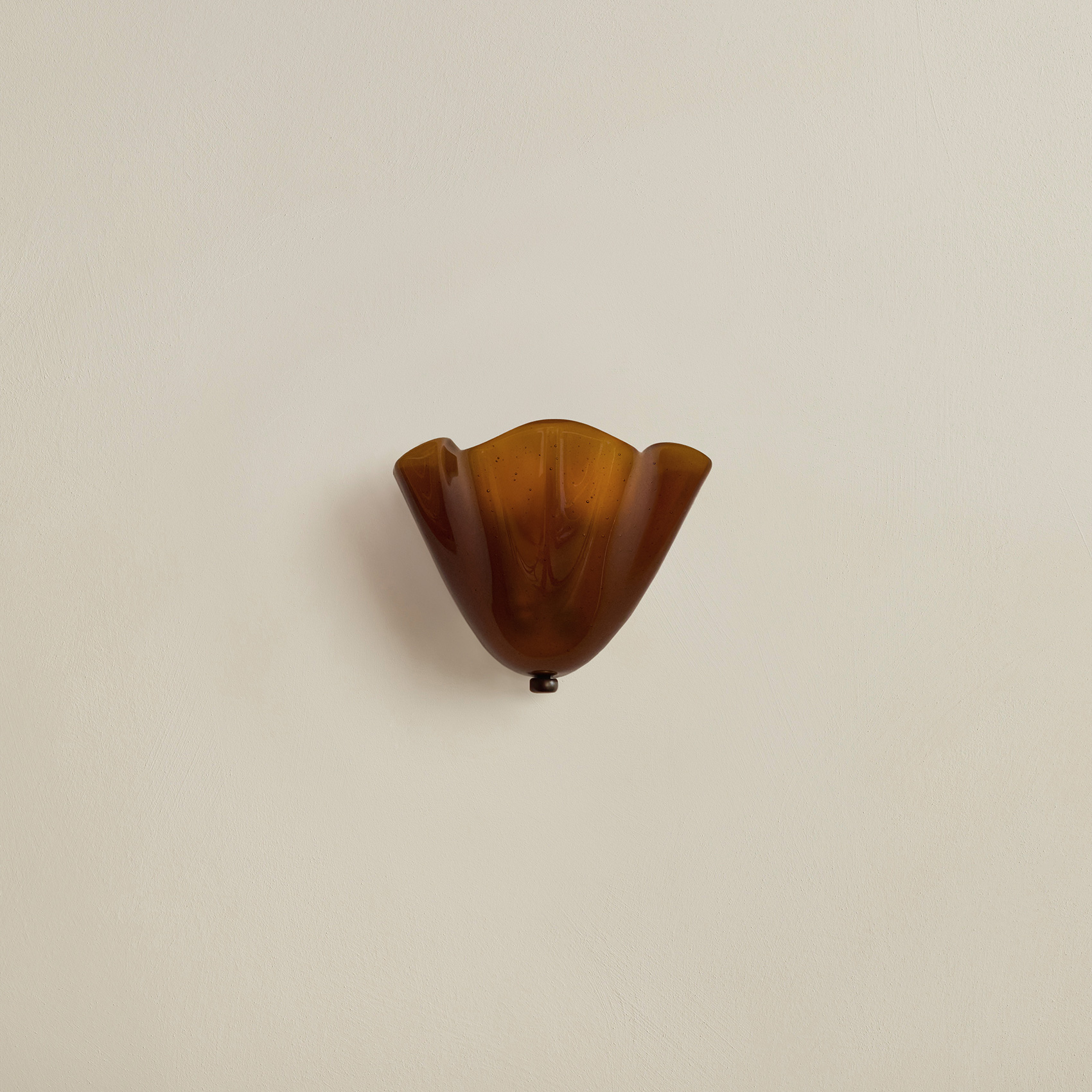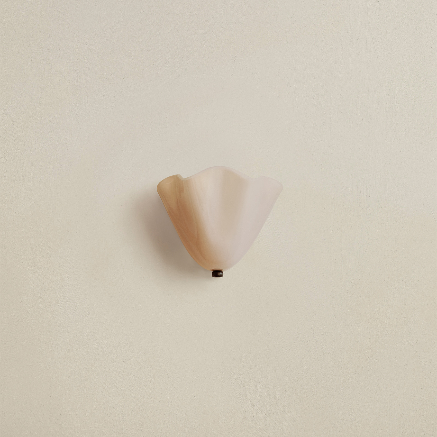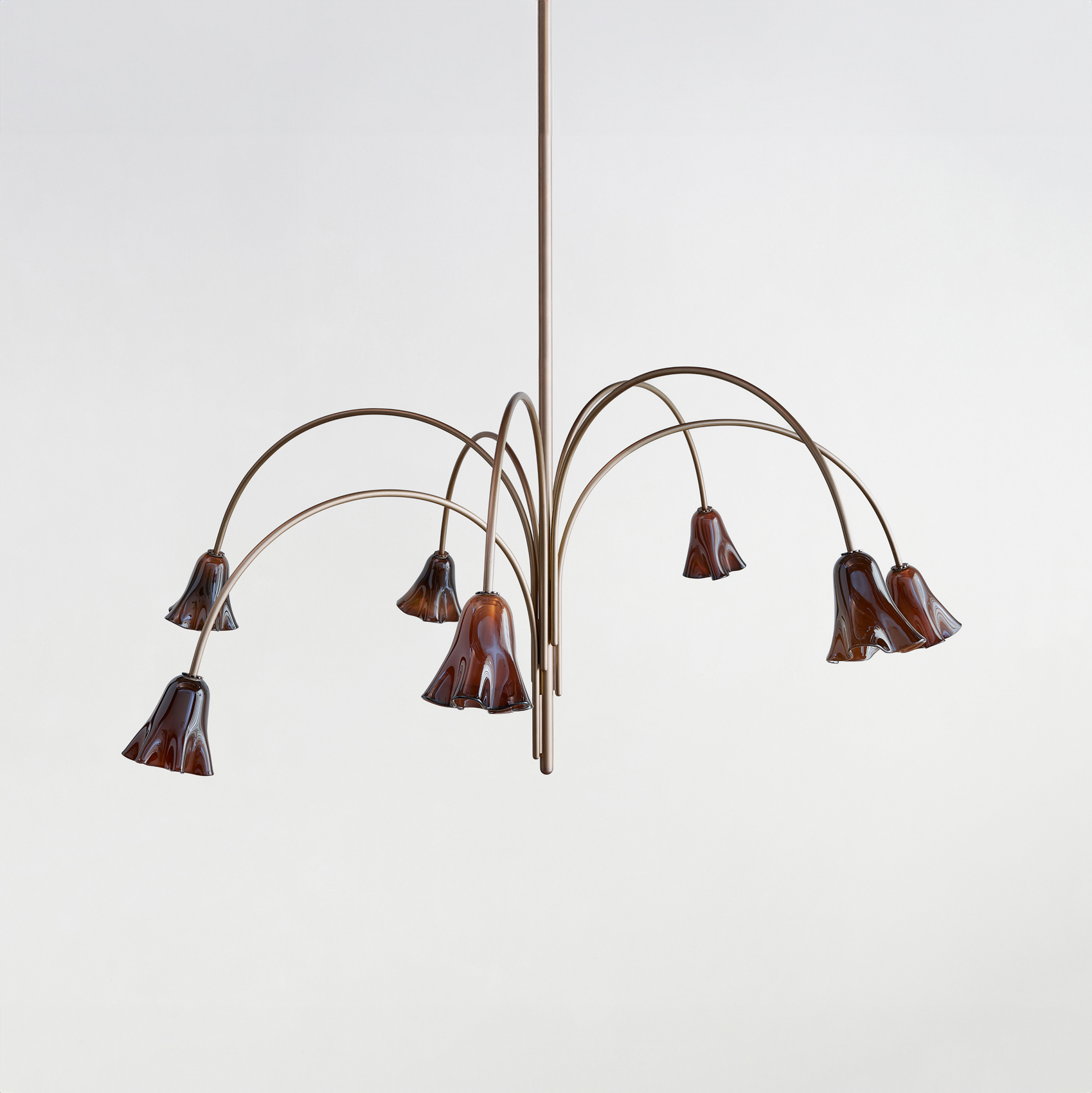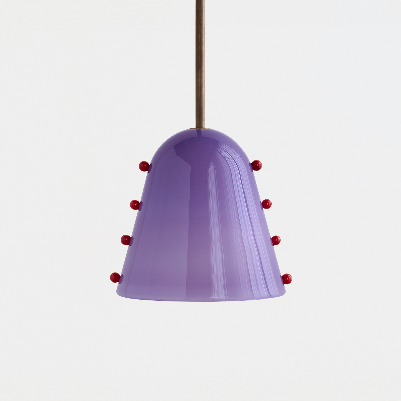 An adaptation of the larger Calla Pendant, in a size specially designed for small spaces. Calla’s shades are made using a modern variation on a centuries-old practice, which involves applying handmade glass details—in this case, rounded fins whose colors deepen when illuminated—to blown glass surfaces. Fitted with hand-finished brass details, and suspended on a brass rod with internal, self-leveling hardware.