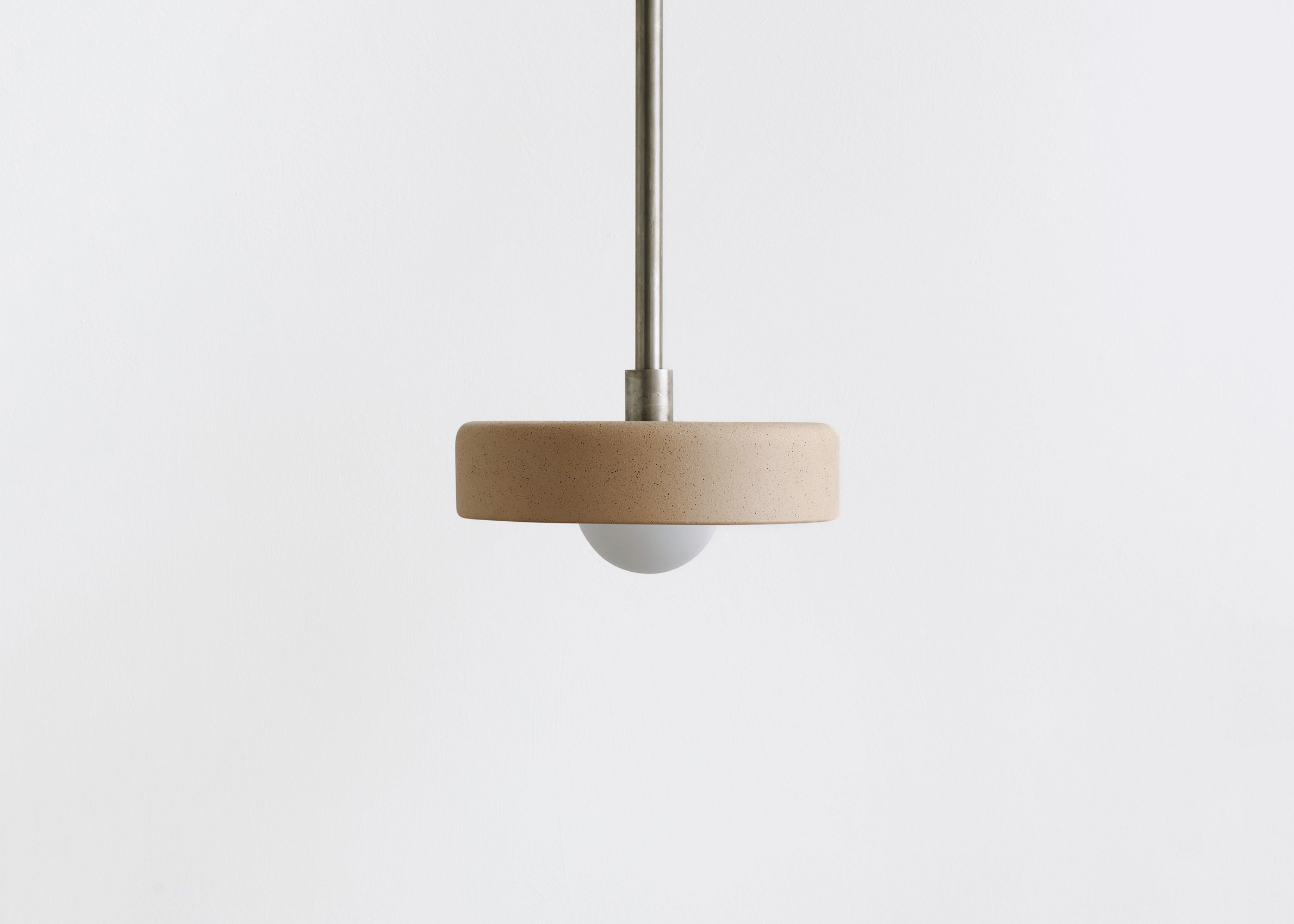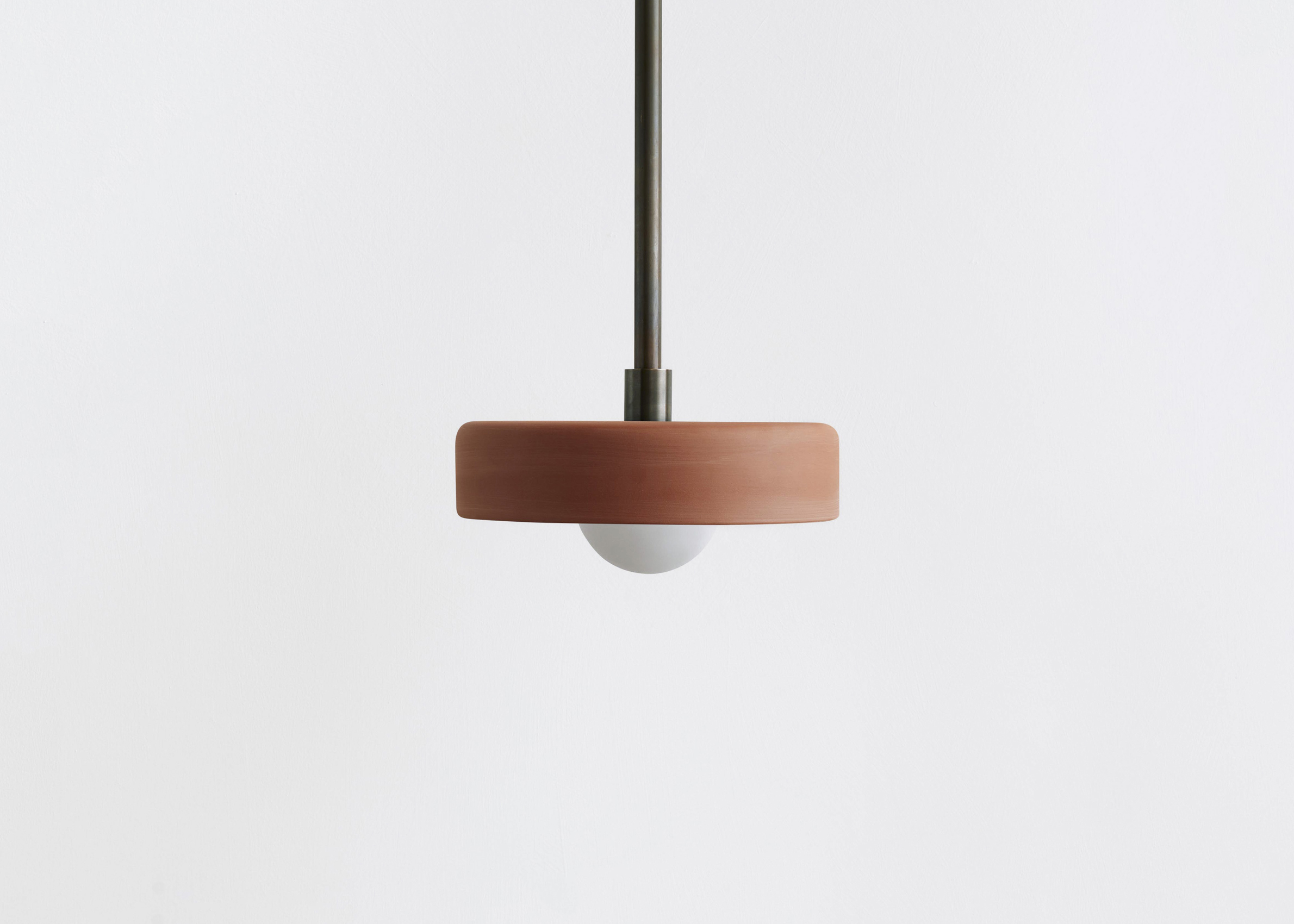 A pendant whose purposeful design renders solid clay seemingly weightless. Suspended from a metal rod with a self-leveling canopy, it’s made to order in a range of sizes and finishes. Each shade is slip-cast by hand and one-of-a-kind.
