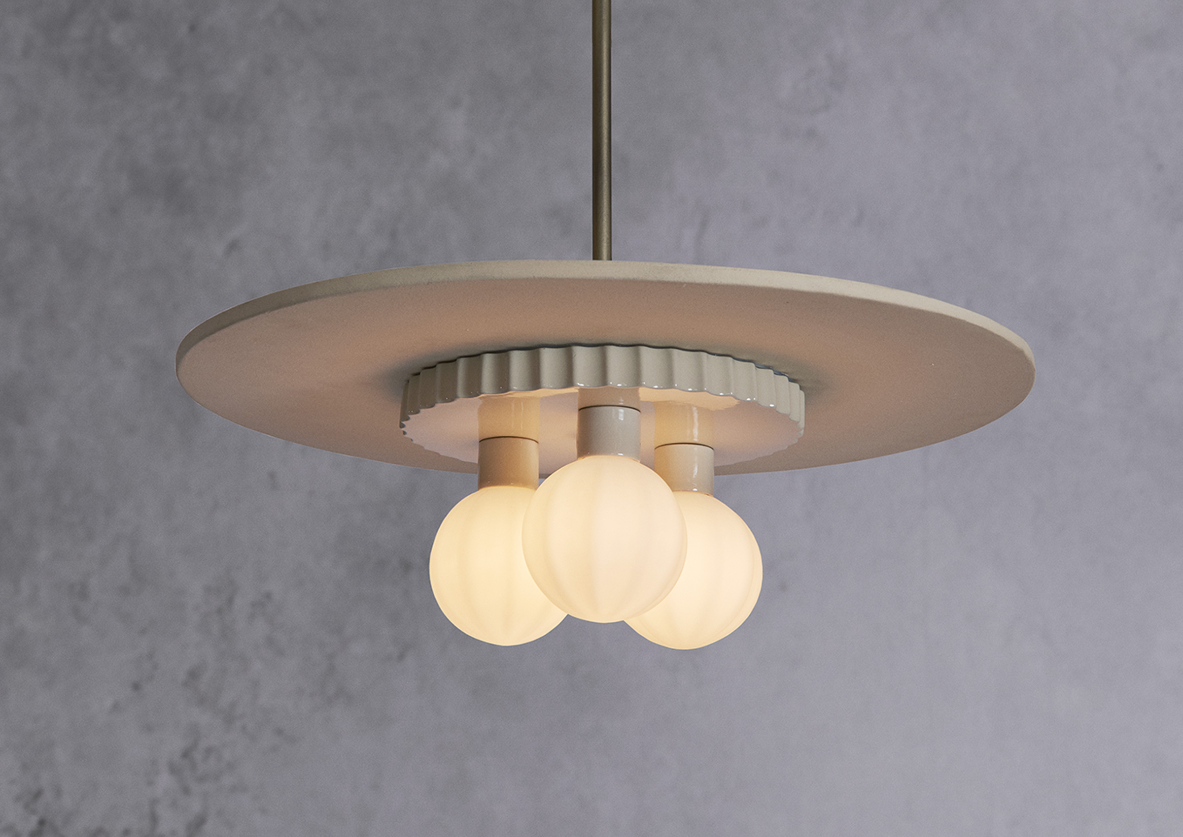 Composed of hand-blown ridged glass, a glazed scalloped puck, and topped off with a large unglazed ceramic disc. The textural differences are picked up beautifully by the light.