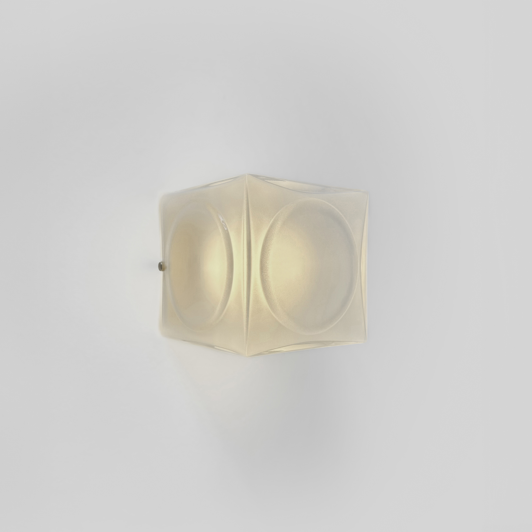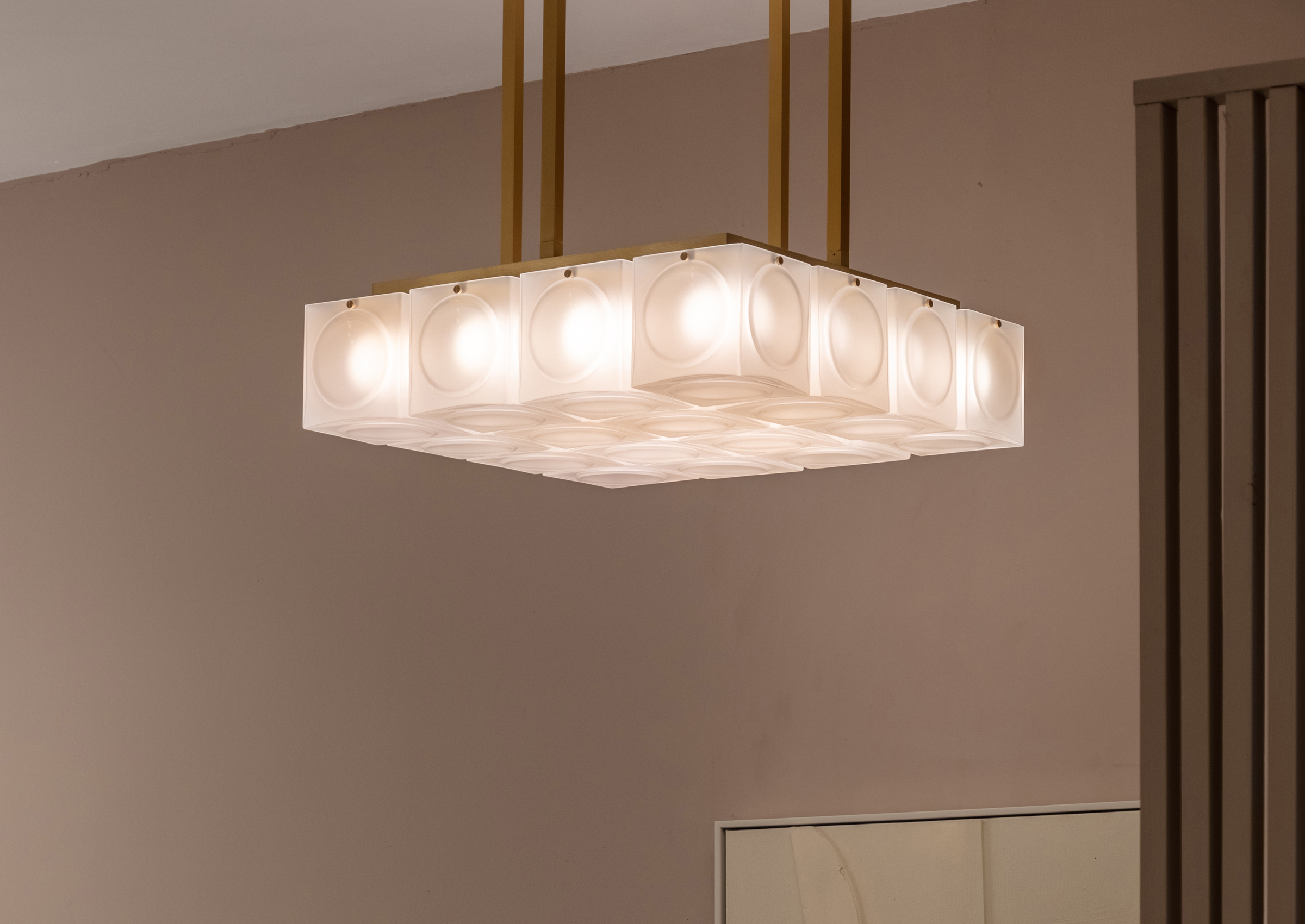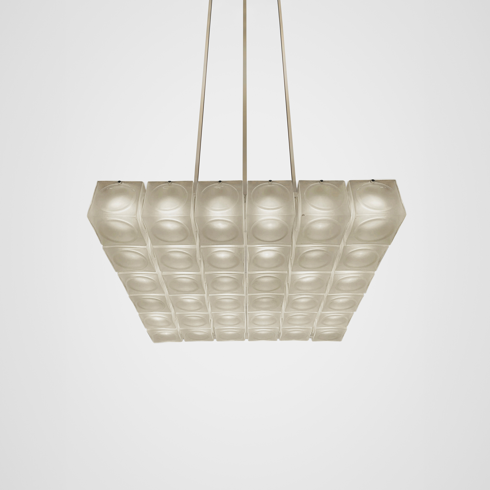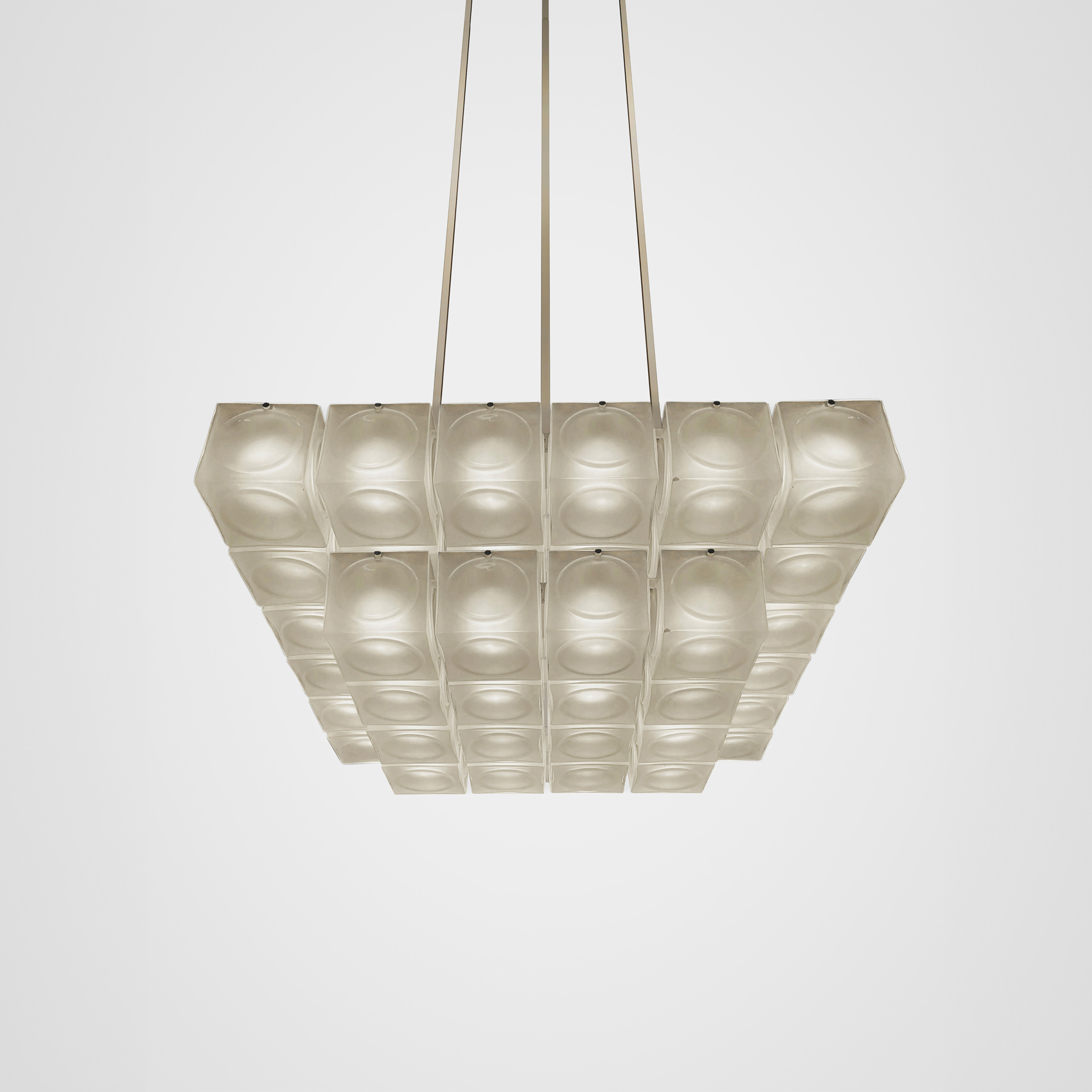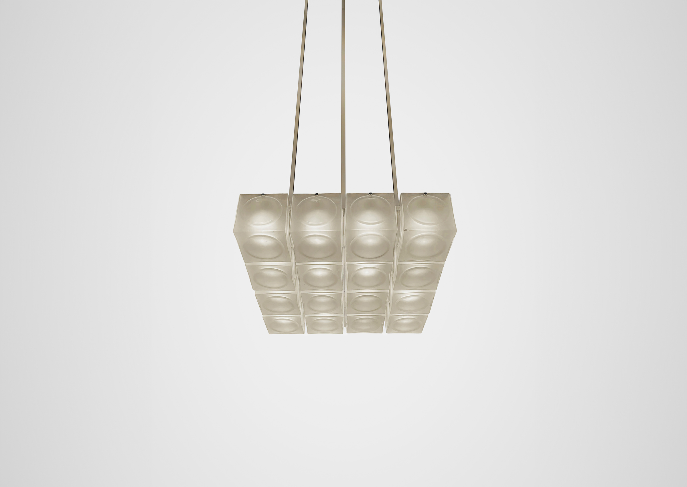 Inspired by the pressed glass bricks often used as an alternative to stained glass in places of worship during the 1970s, Chant is formed of blown glass cubes with a pronounced circular detail in either clear or frosted glass. Constructed in square configurations, the glass cubes connect to form glowing brick-like chandeliers in single or two tiers.