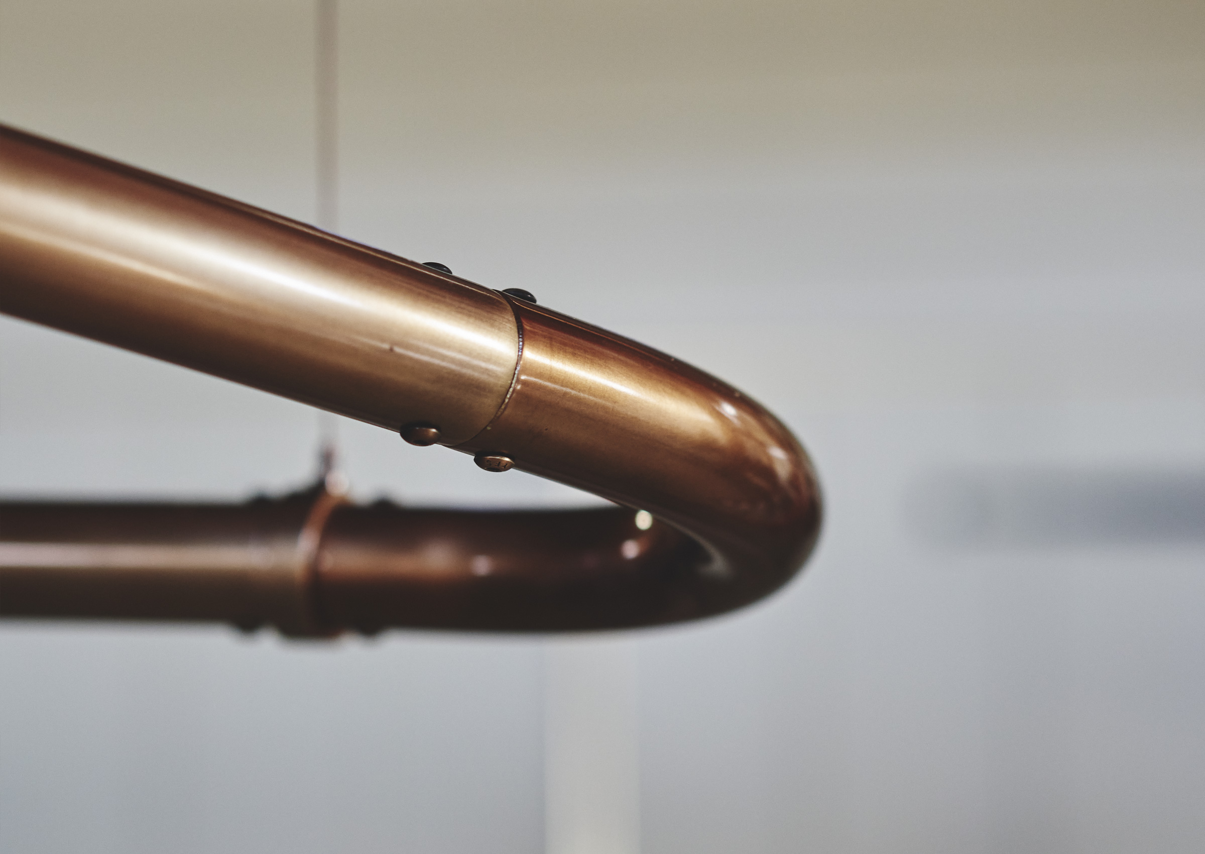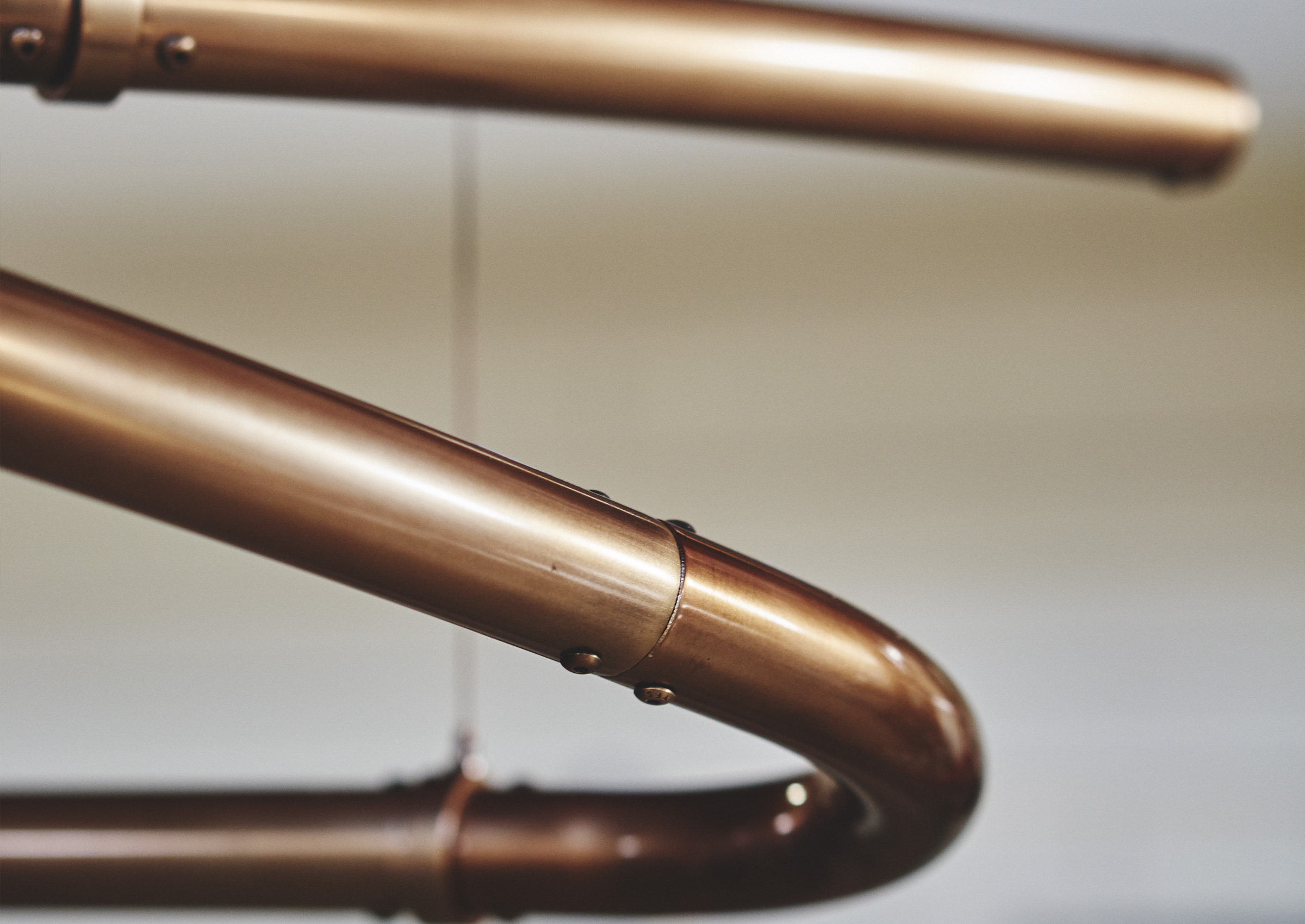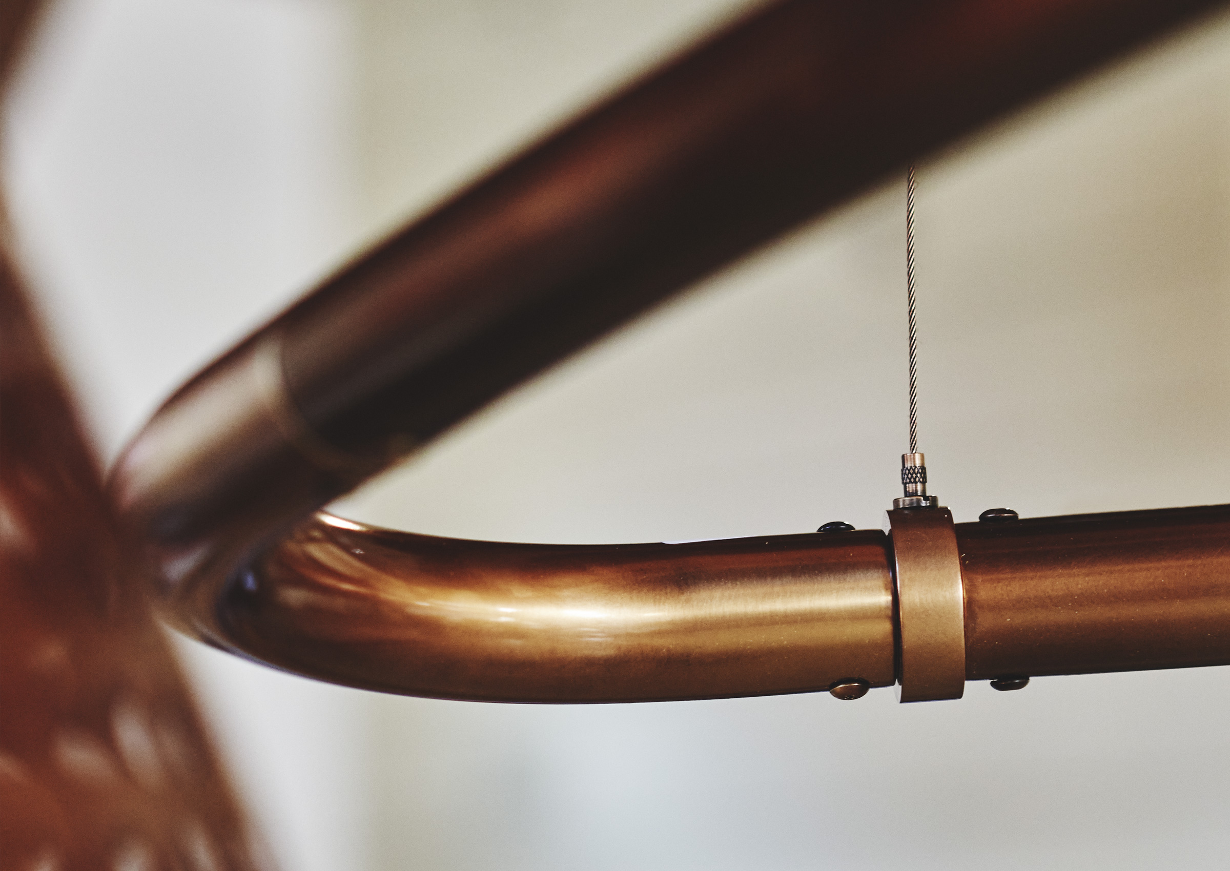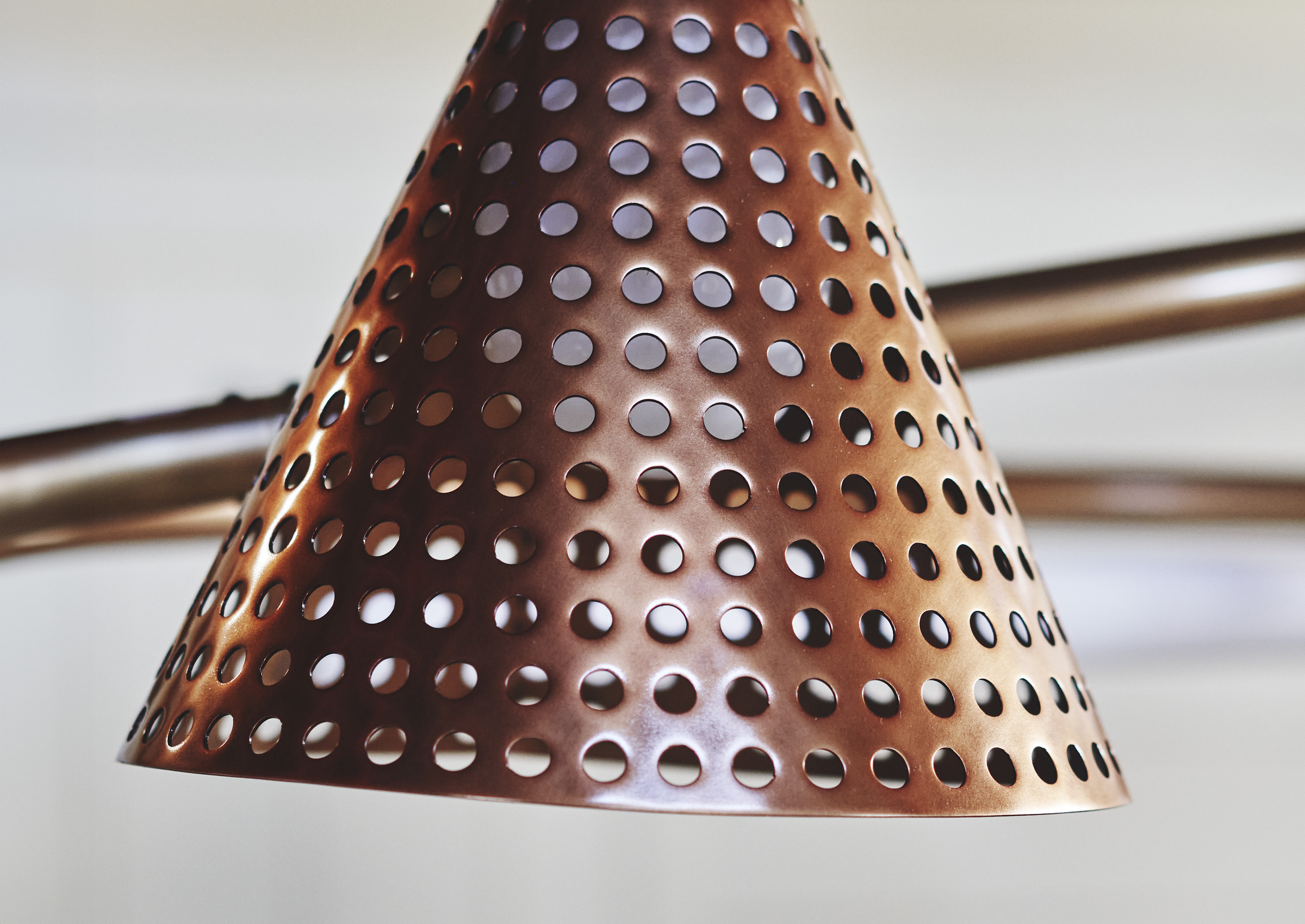 A collection of lit forms hang from a bronze-patinated metal armature. A perfect cylinder sits alongside a handblown glass orb and a glass teardrop within a perforated metal shade.