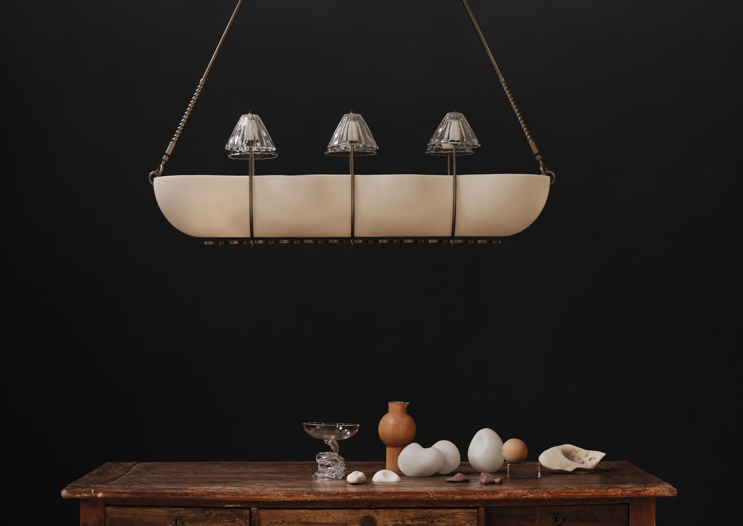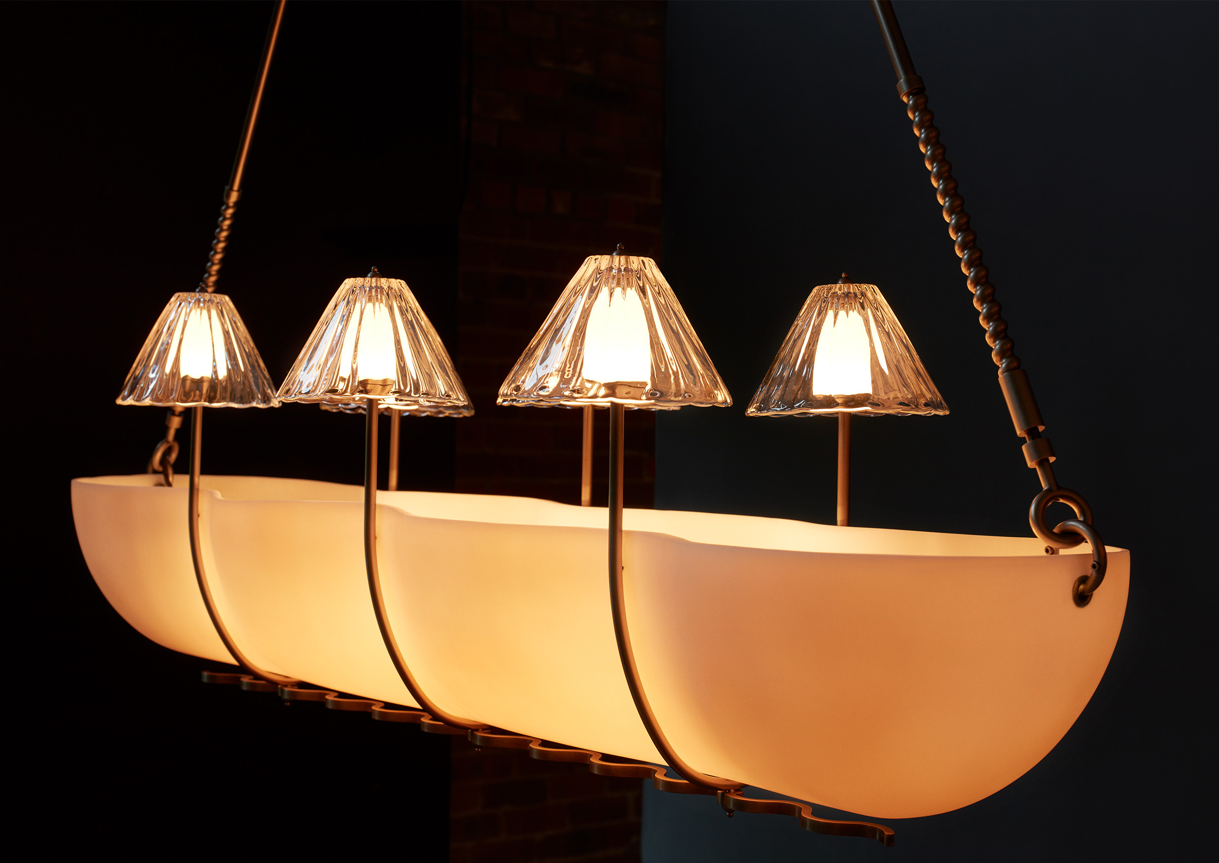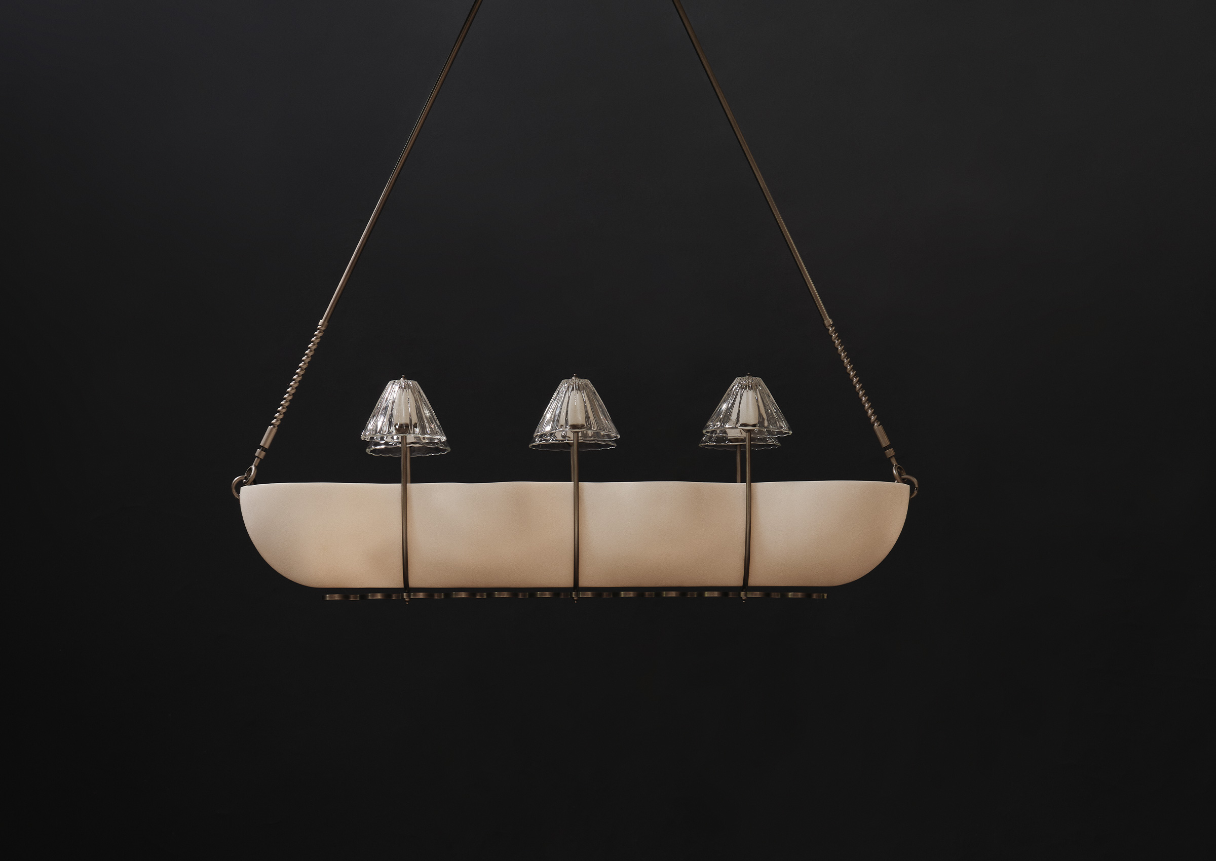 A monumental basin of tinted cast acrylic topped with hand-made scalloped glass cones is hung from and encased within an armature of nickel plated and patinated steel, replete with small details of decoration and joinery.