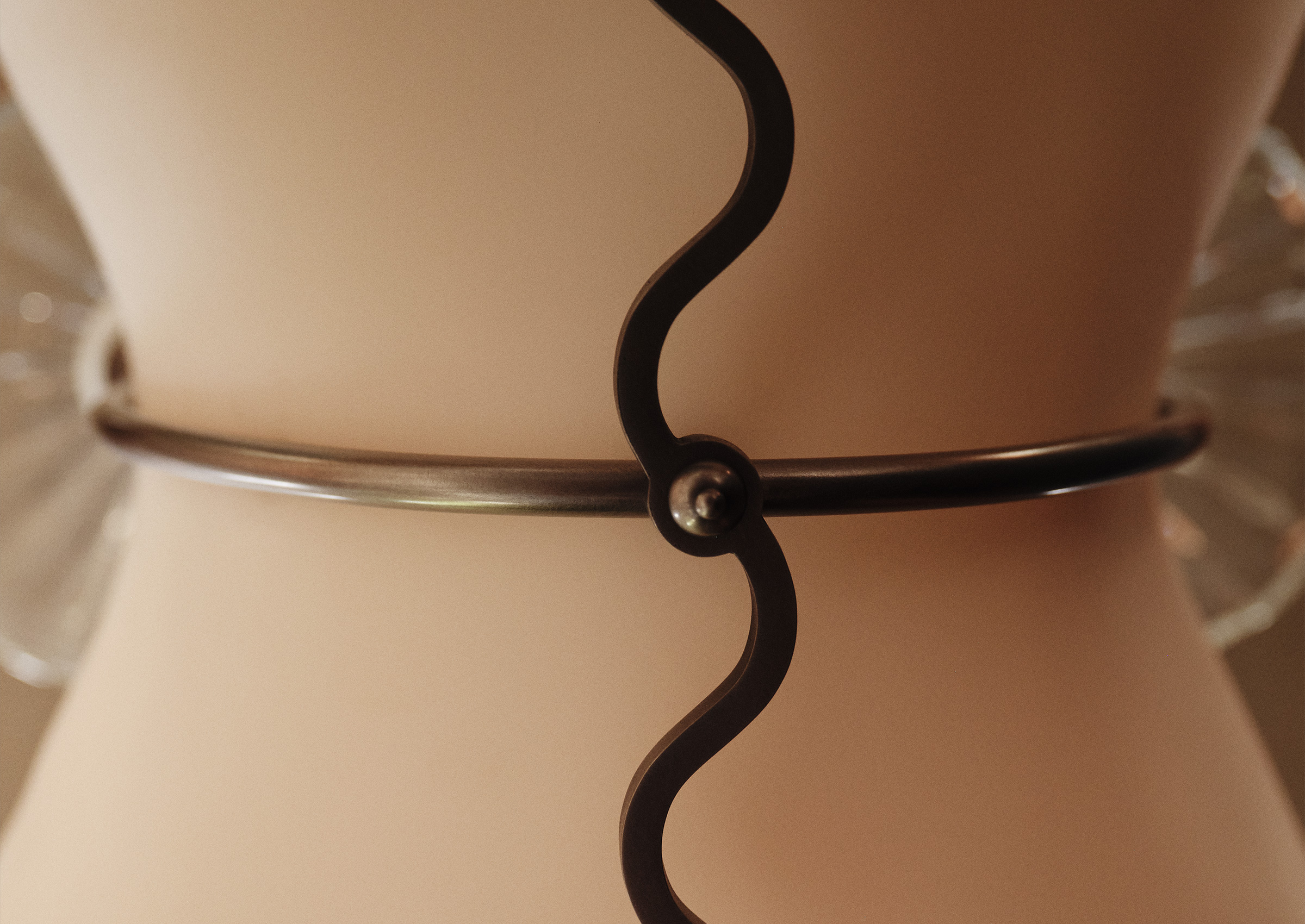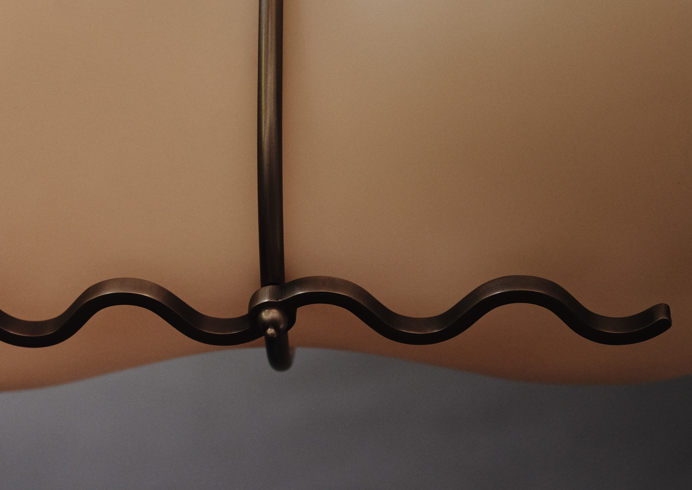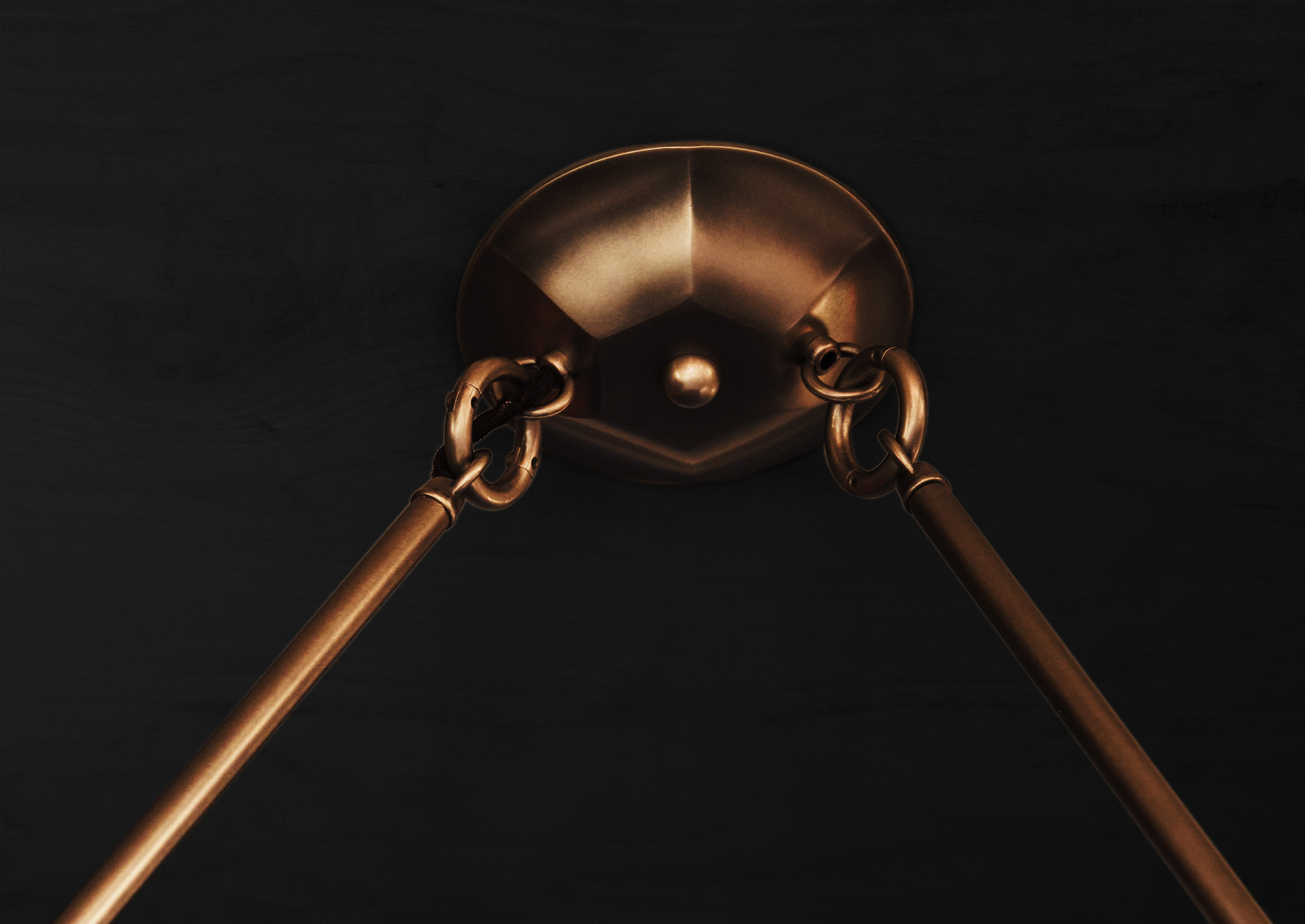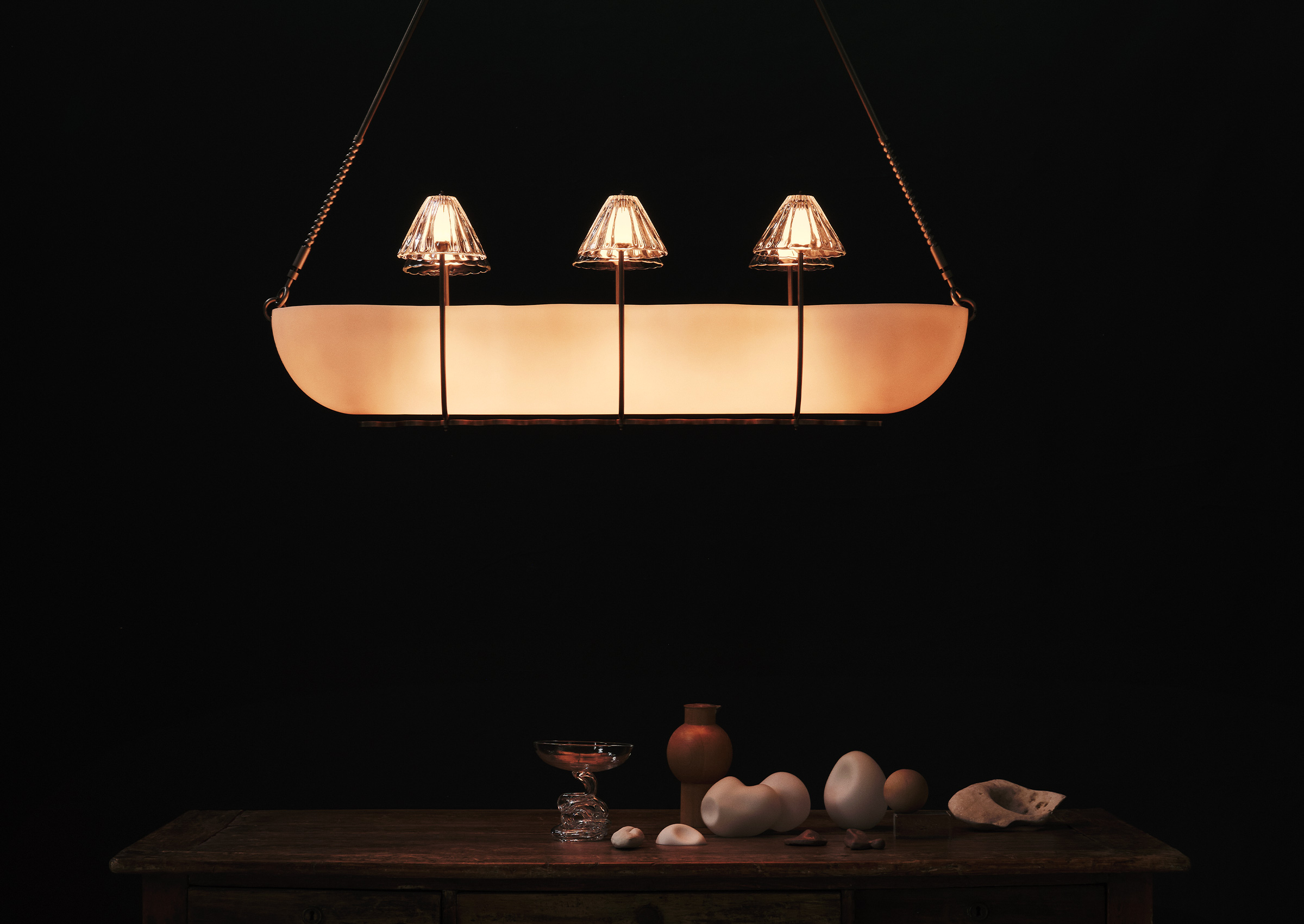 A monumental basin of tinted cast acrylic topped with hand-made scalloped glass cones is hung from and encased within an armature of nickel plated and patinated steel, replete with small details of decoration and joinery.