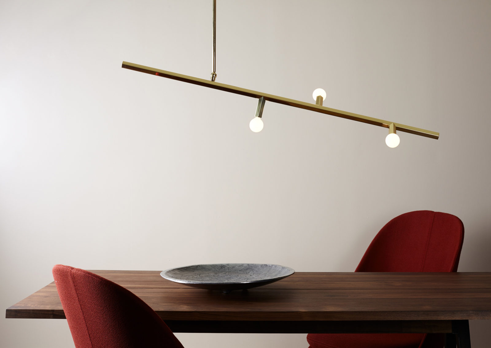 Inspired by cherry blossom branches and computer graphics, Charles de Lisle's Linden series blends natural forms and geometric shapes. The design features hexagonal brass conduit, resembling a video game tree, and draws from bicycle construction for its joint angles. The series includes hanging fixtures, table lamps, floor lamps, sconces, and flush mounts, while the Linden Vertical captures the playful essence of a branching form.