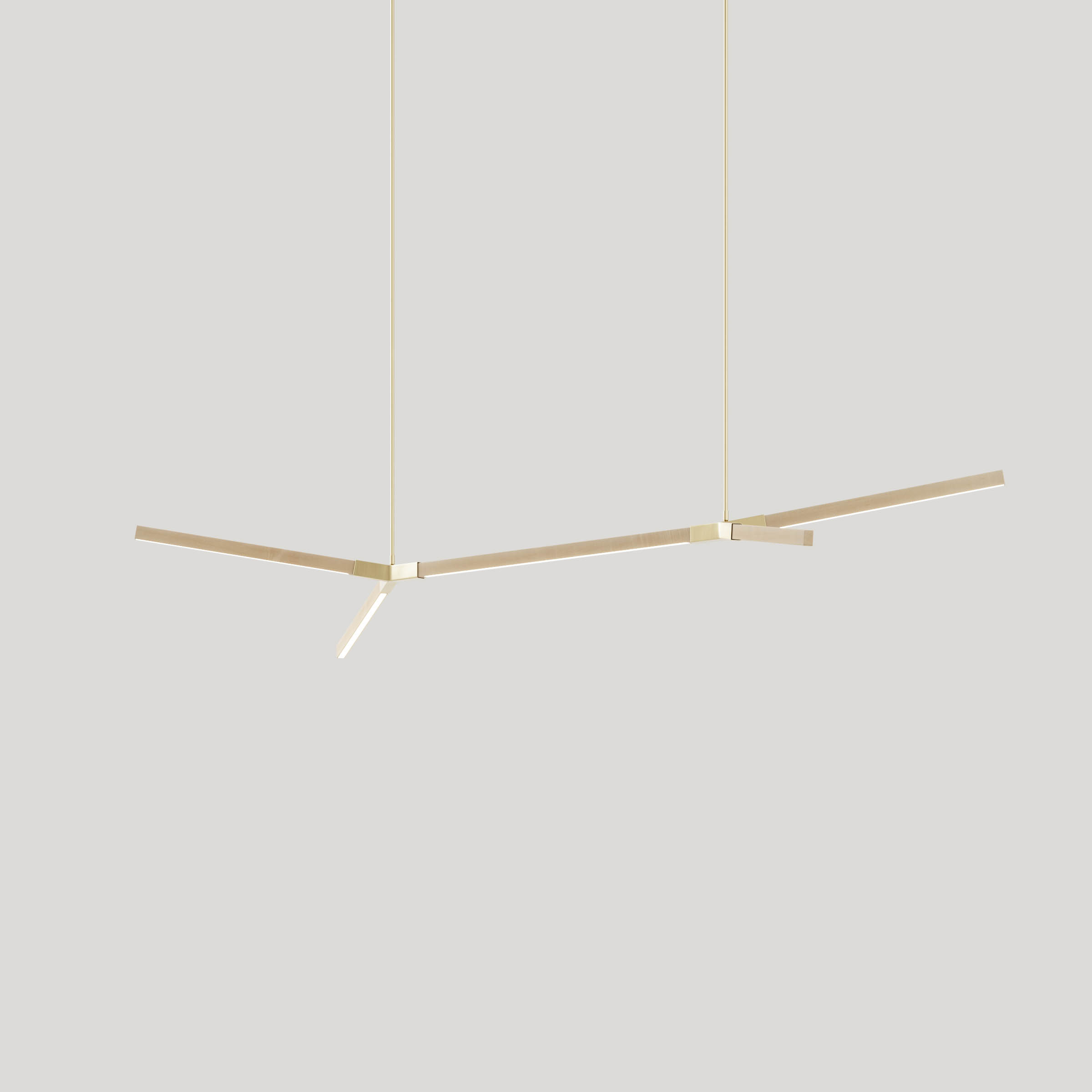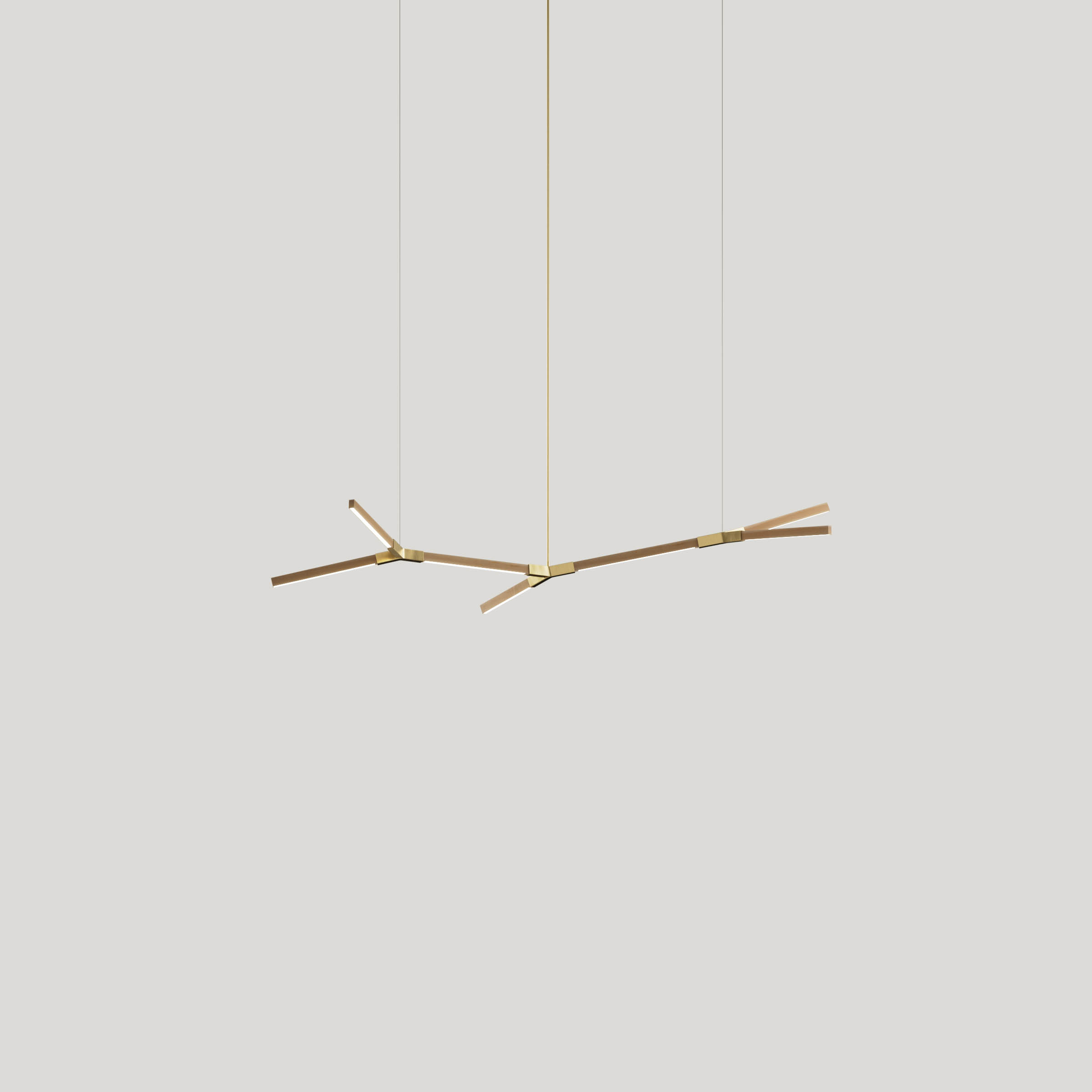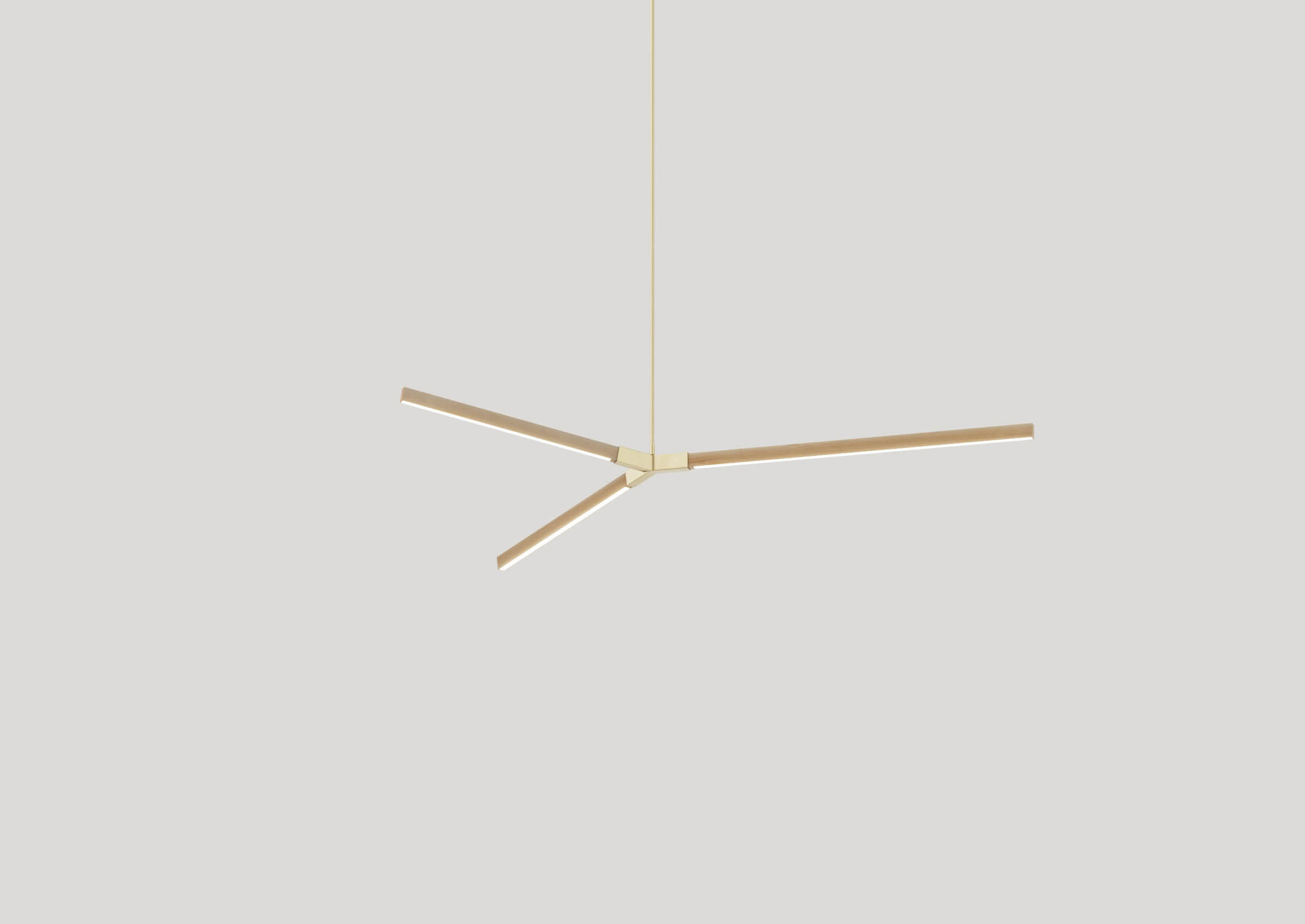 Bough is comprised of 3 solid wood sticks of varying lengths held in place by a central steel socket and stem. It casts warm light up or down, and is commonly used above a circular table in clusters for both residential and commercial spaces. BOUGH explores the space between our minimal aesthetic and expressive pieces. Span ranges from 3-5ft. Ships flat-packed.