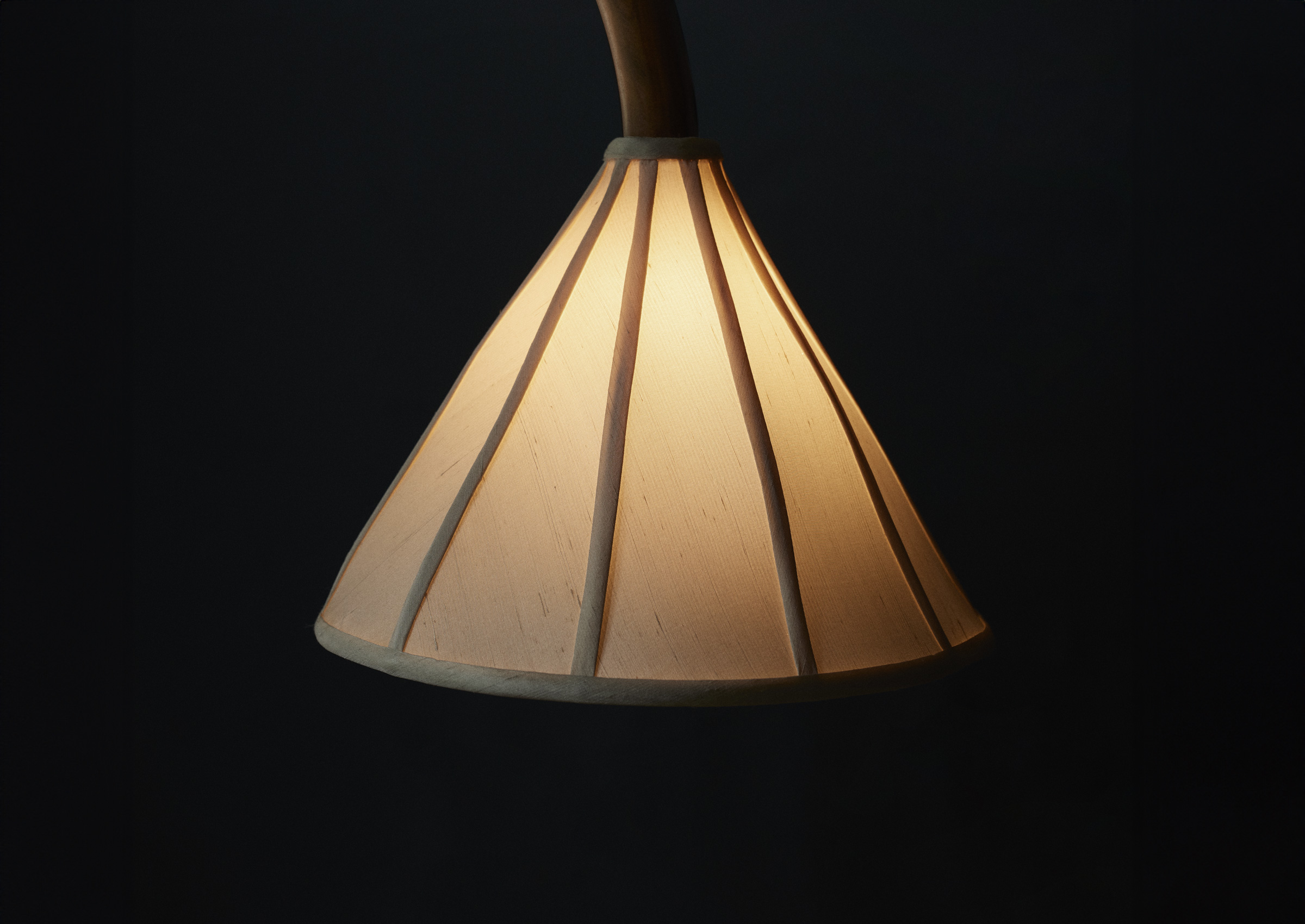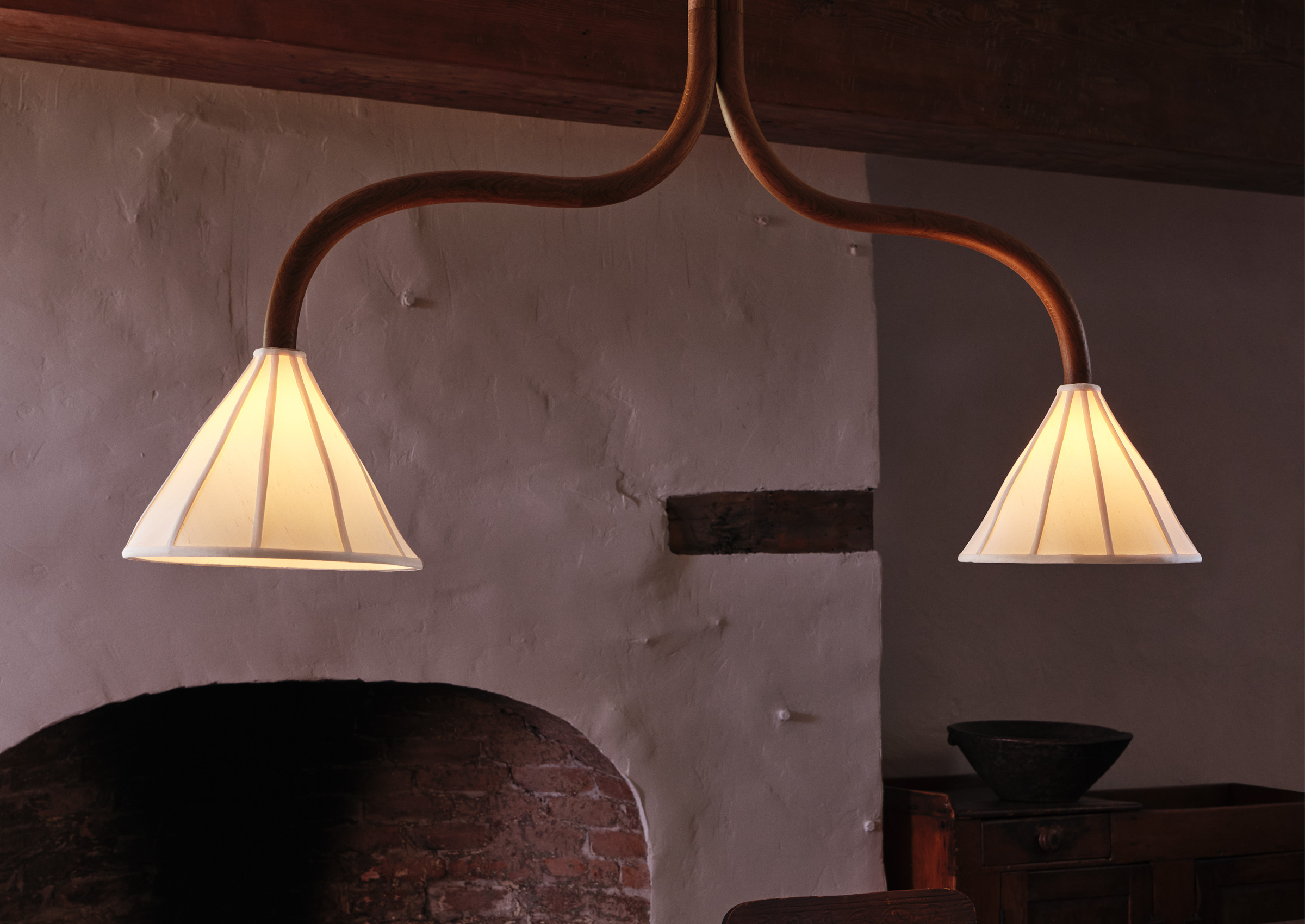 Sinuous curves of carved hardwood terminate in hand-upholstered conical silk shades, with a classically inspired wood ceiling rose. Inside each shade, a hand-blown white glass teardrop houses the light source.