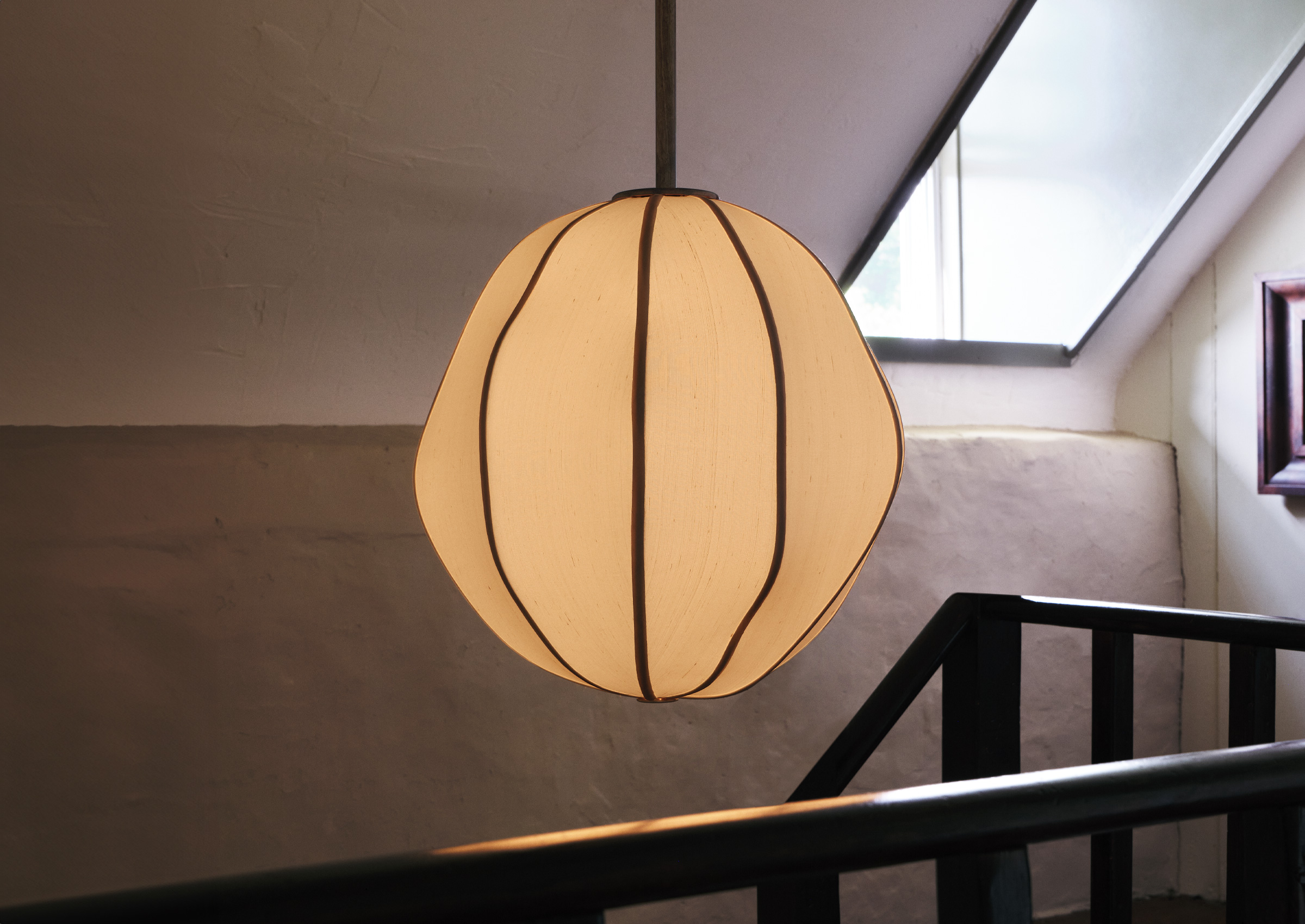 A hand-upholstered silk globe hangs from the end of a carved hardwood tube, with a classically inspired wood ceiling rose.