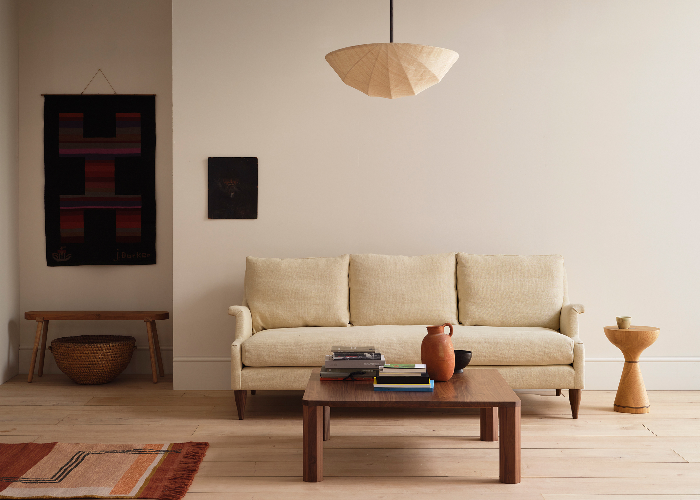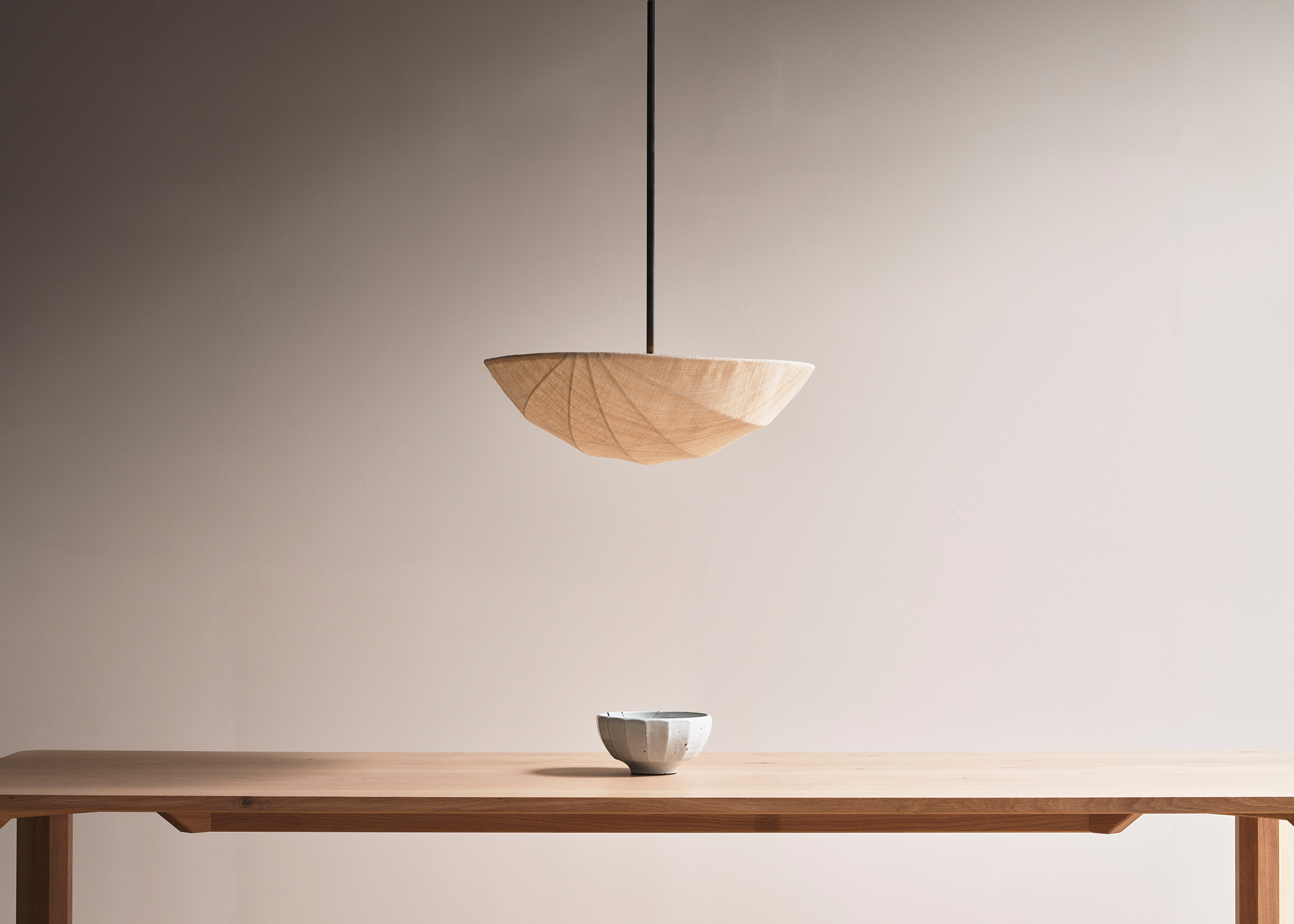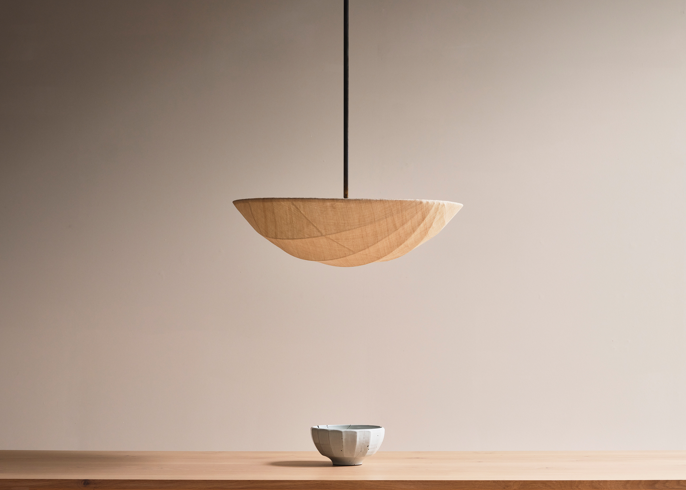 The Pium pendant combines hand-sewn layers of linen and fibre from the banana plant family, held in tension over a dark bronzed coated frame. It is suspended from the ceiling with a dark bronze patined steel rod.