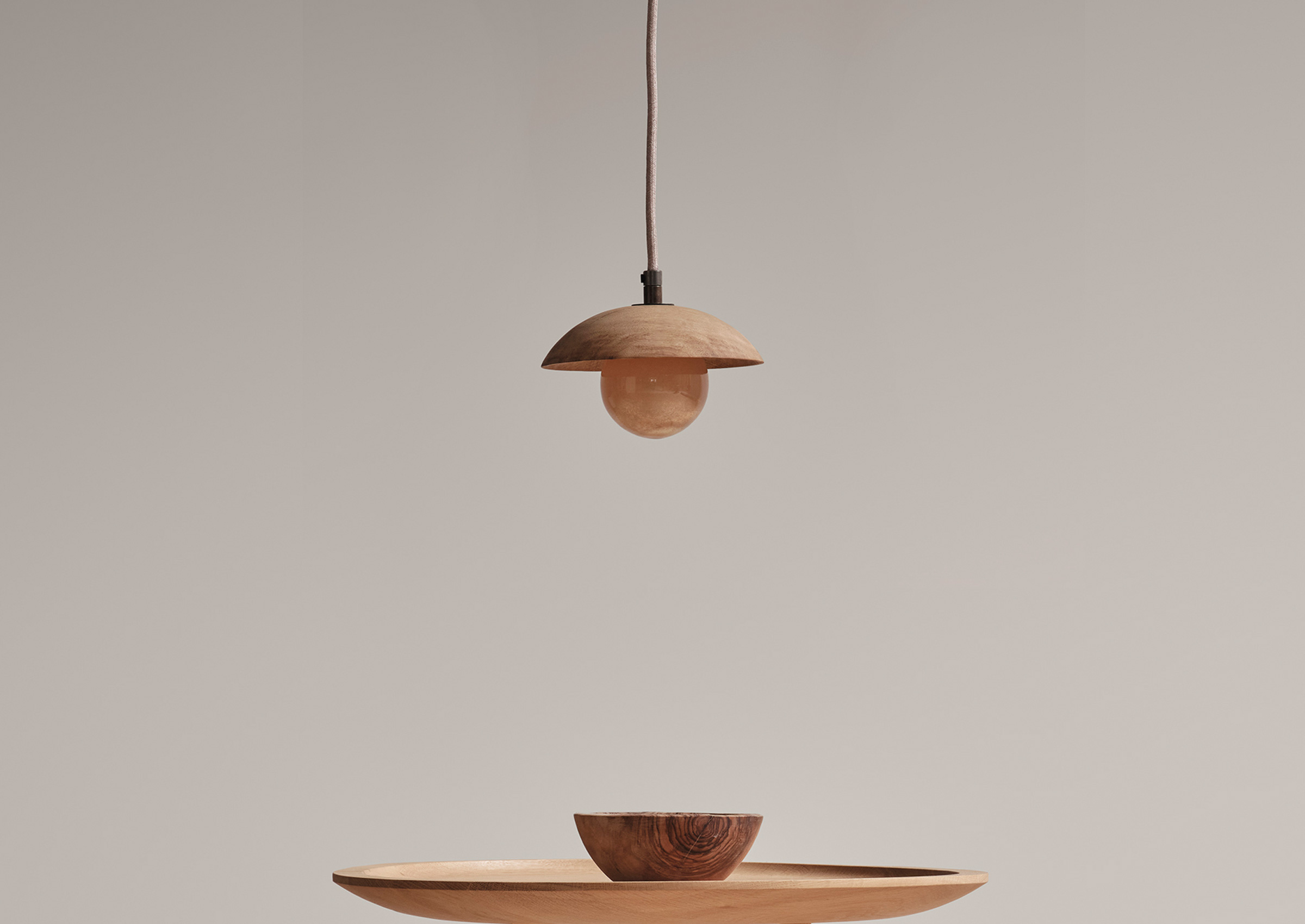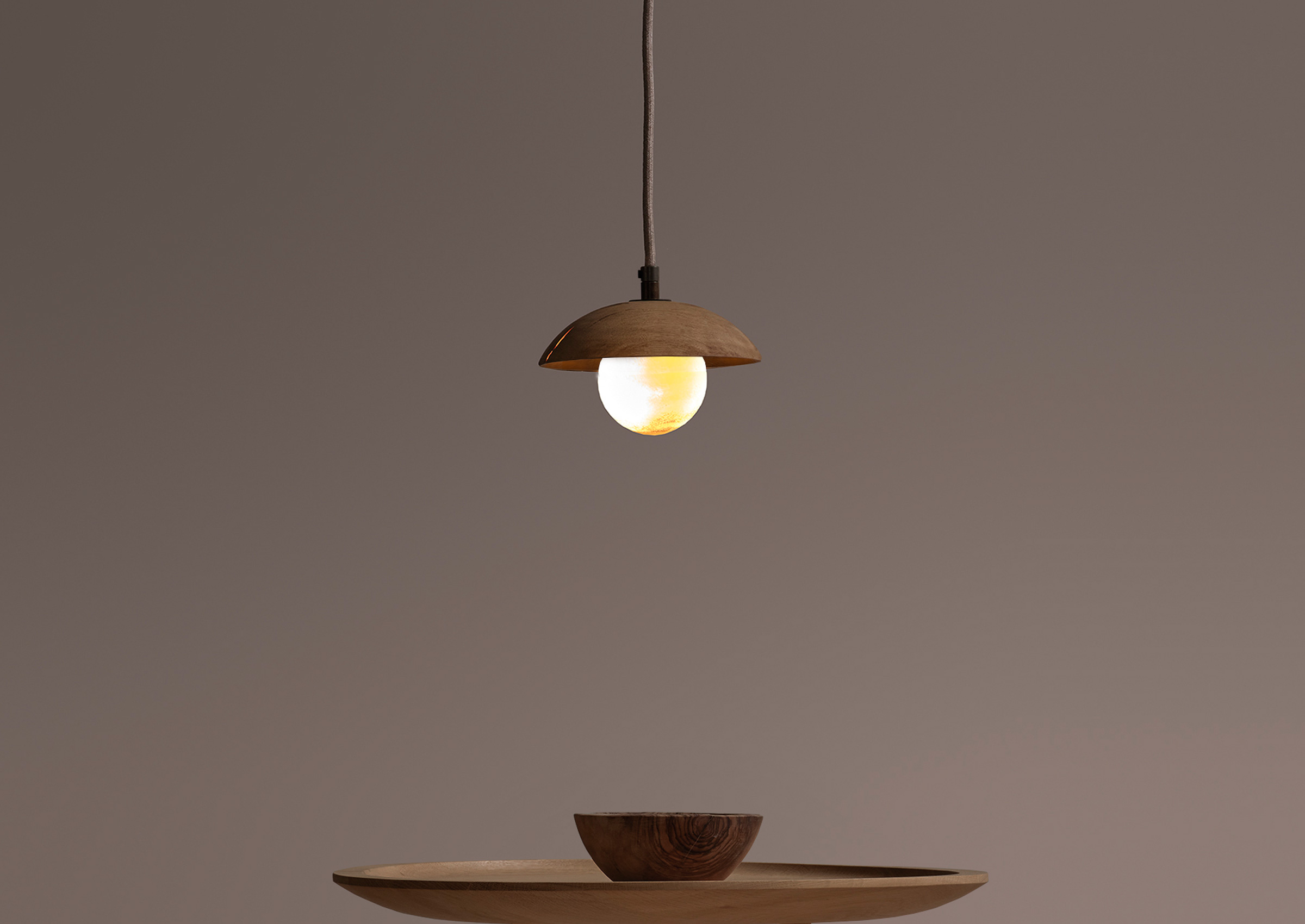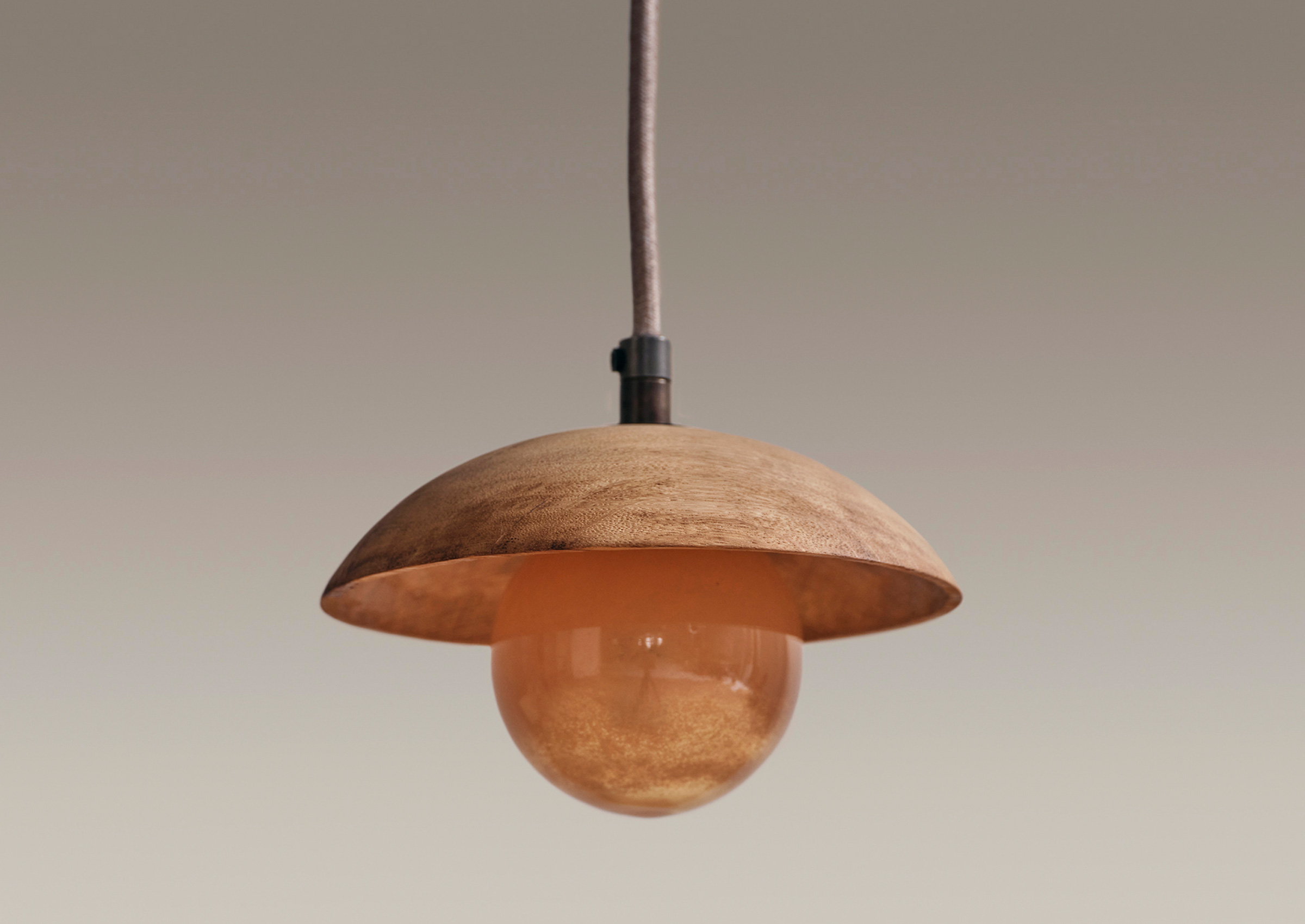 Inspired by the candle sconces historically seen lining a monastery cloister, the Posent is a sculptural pendant light that combines the beauty of brown oak with hand-blown glass. Its turned timber dish holds a warm-toned glass sphere, created by layering two different colors to give a mottled effect.