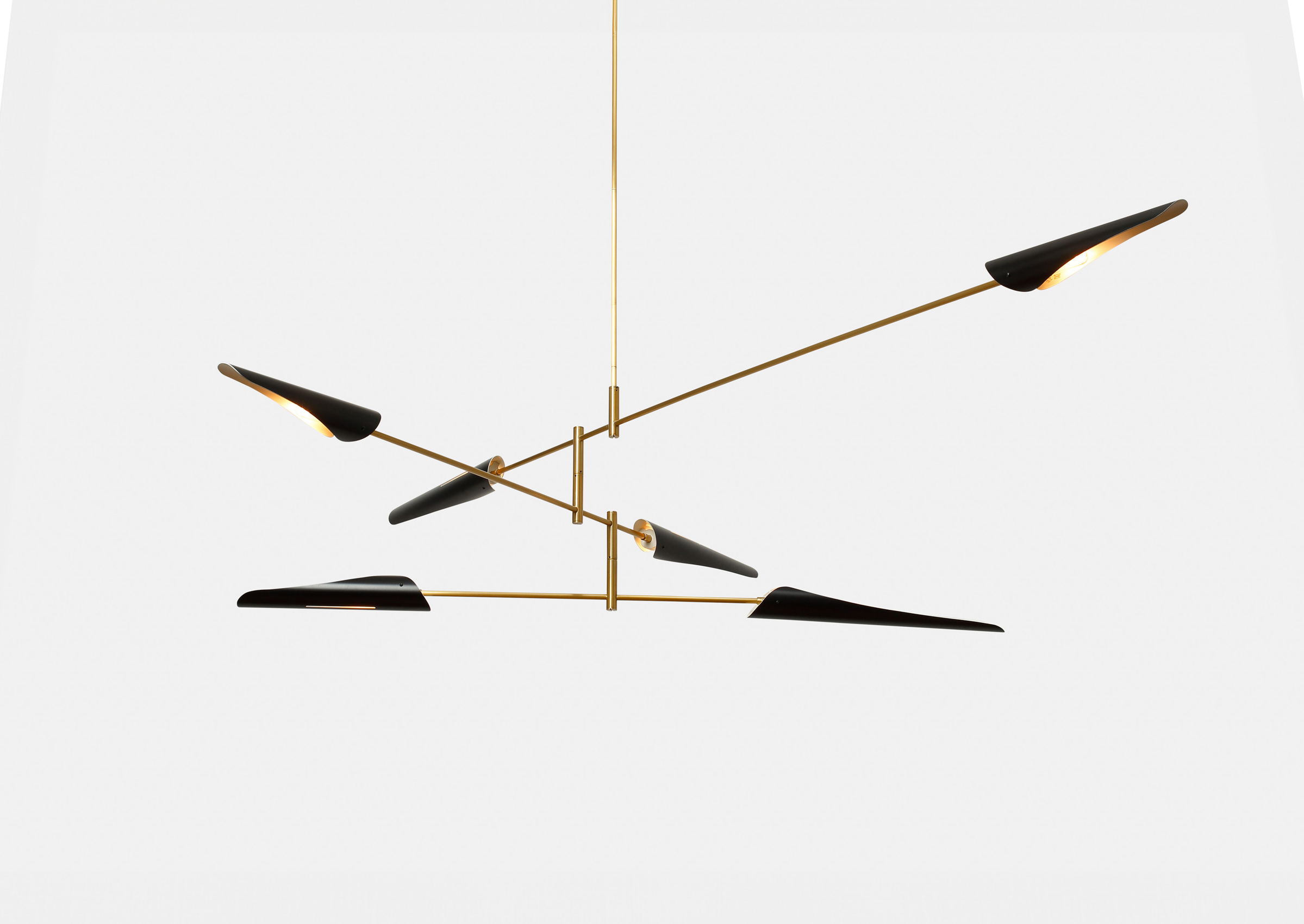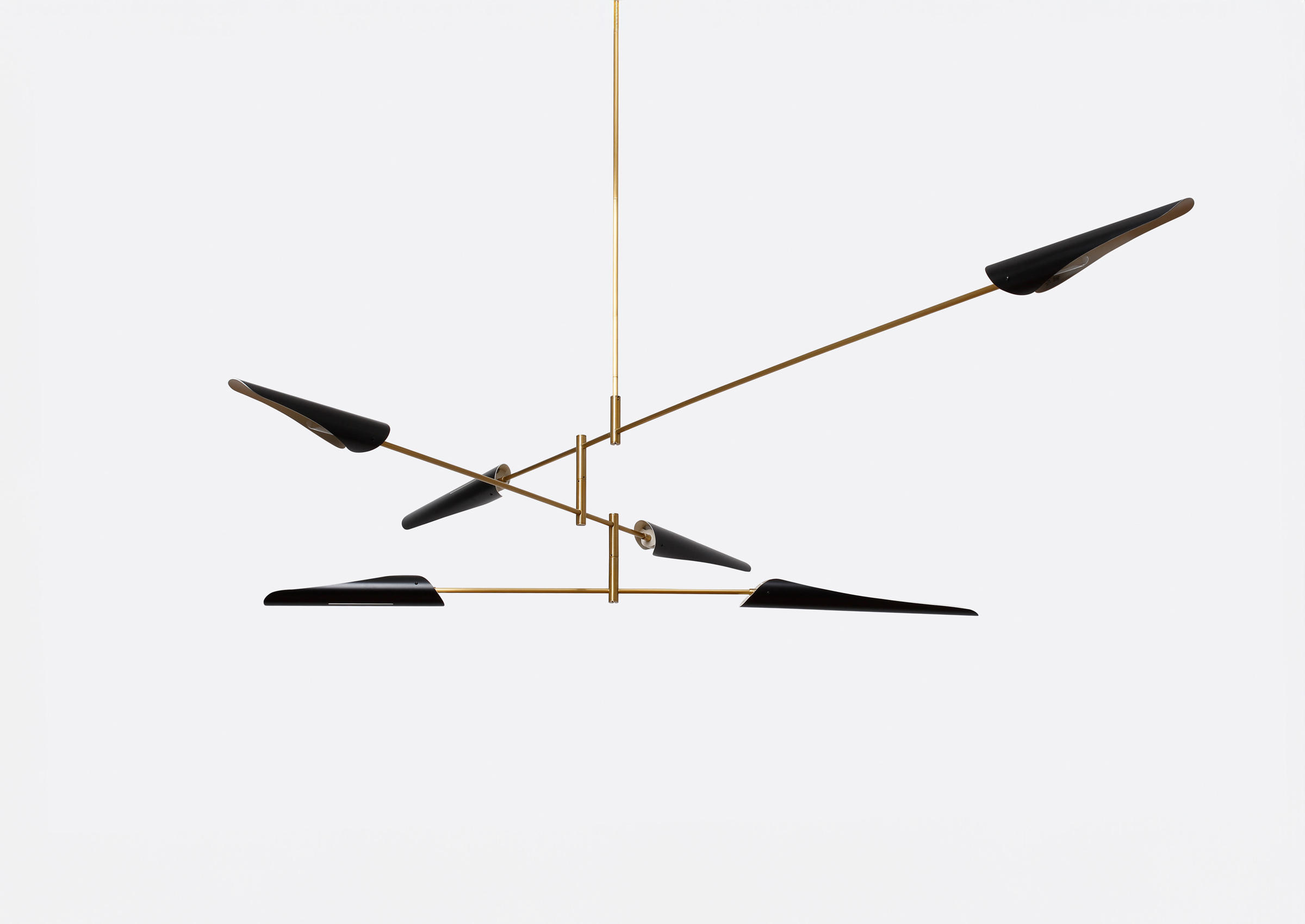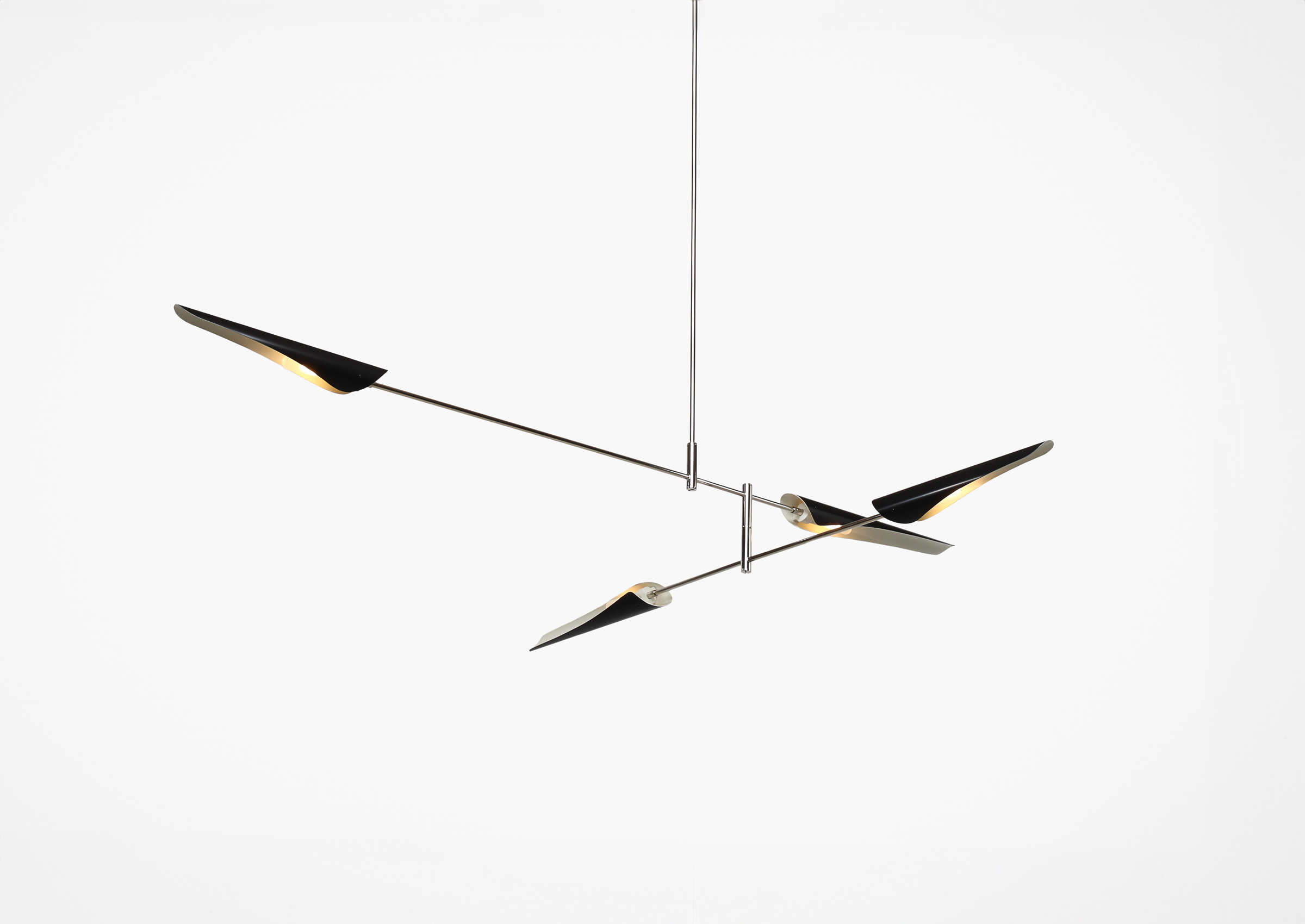 The Sarus Mobile is a tiered flight of balanced asymmetry with a proudly expansive wingspan. Each tier features two Sarus shades which rotate 320 degrees to cast light up or down. Tiers vary in length and scissor open on installation. Arrangement can be adjusted to suit site-specific needs.