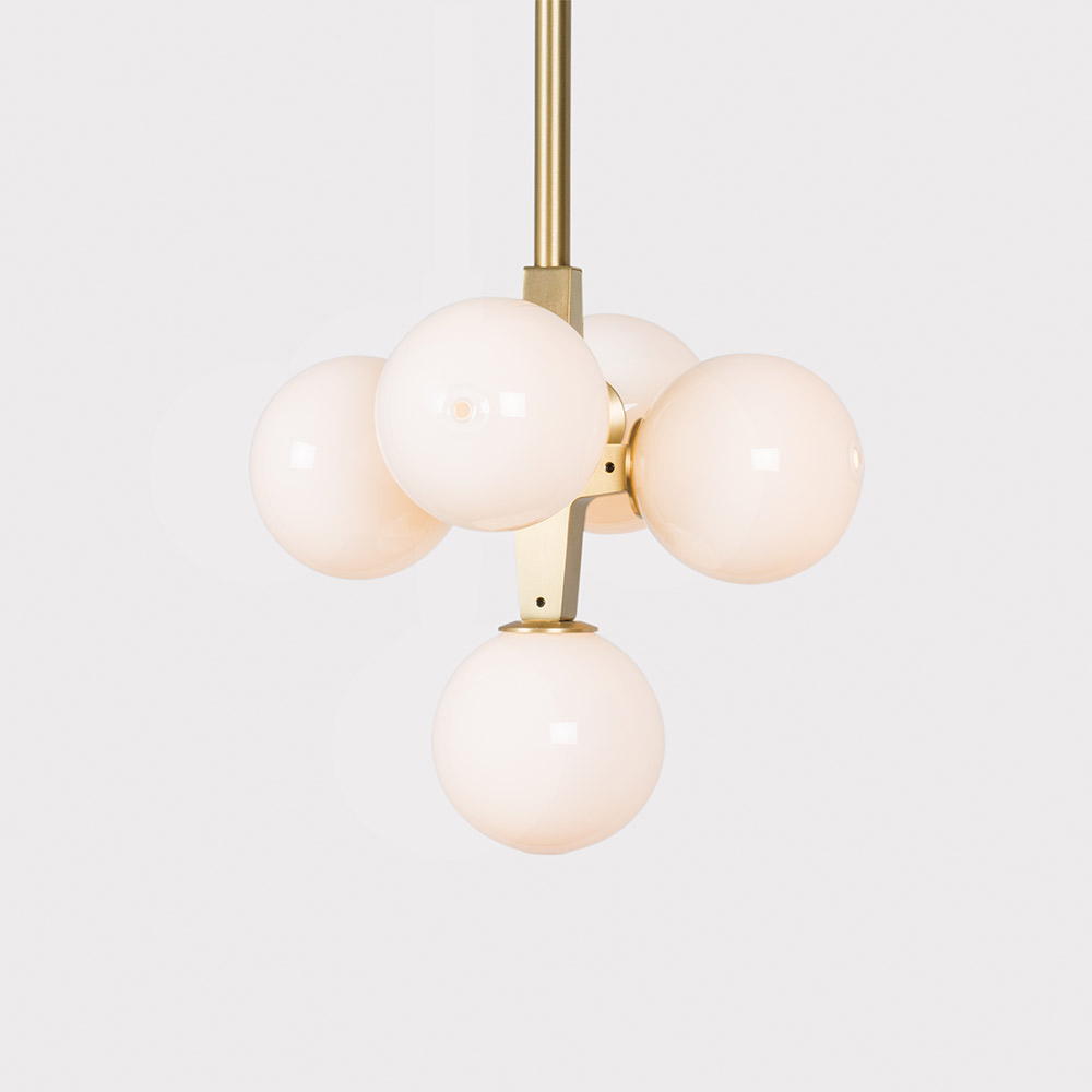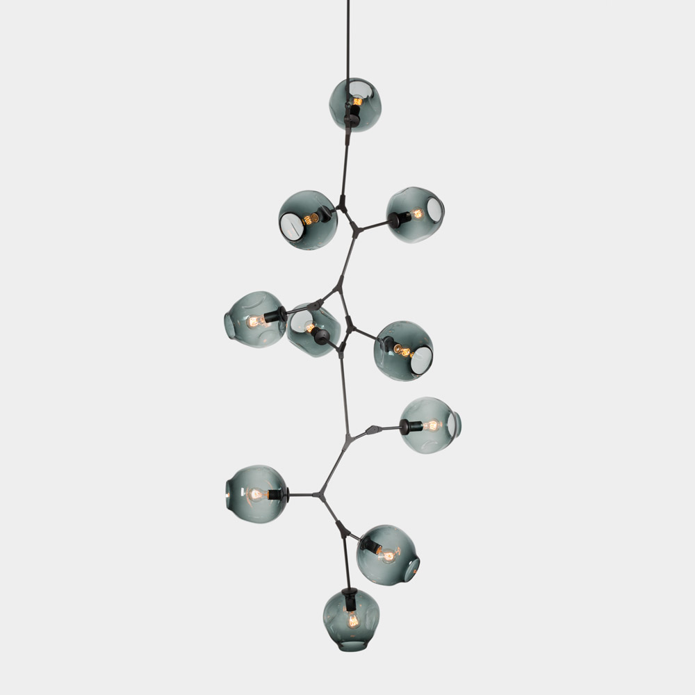 Produced by Lindsey Adelman in her New York studio, the Branching Bubble Series is inspired by the complex yet interconnected forms found in nature. It is composed of brass structural elements with hand-blown glass fixtures and is available in a variety of metal finish and glass options for creating unique configurations.