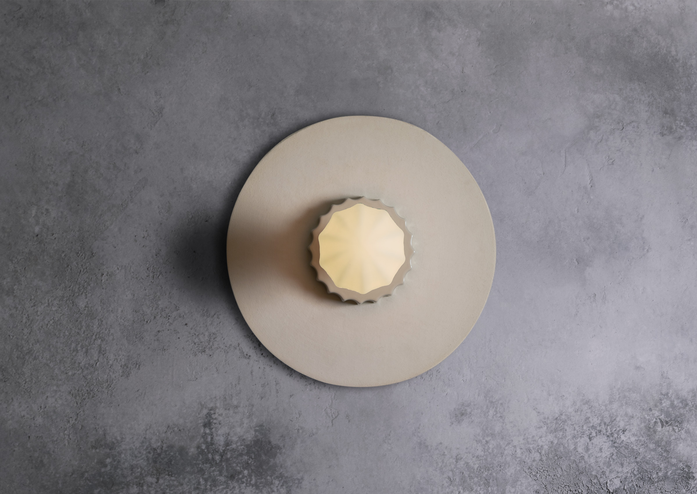 Composed of hand-blown ridged glass, a glazed scalloped puck, and topped off with a large unglazed ceramic disc. The textural differences are picked up beautifully by the light.