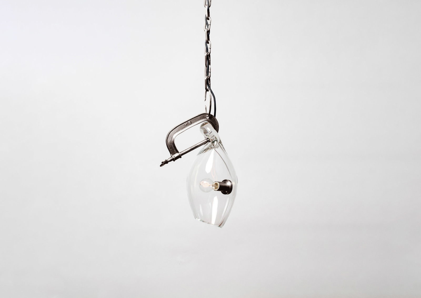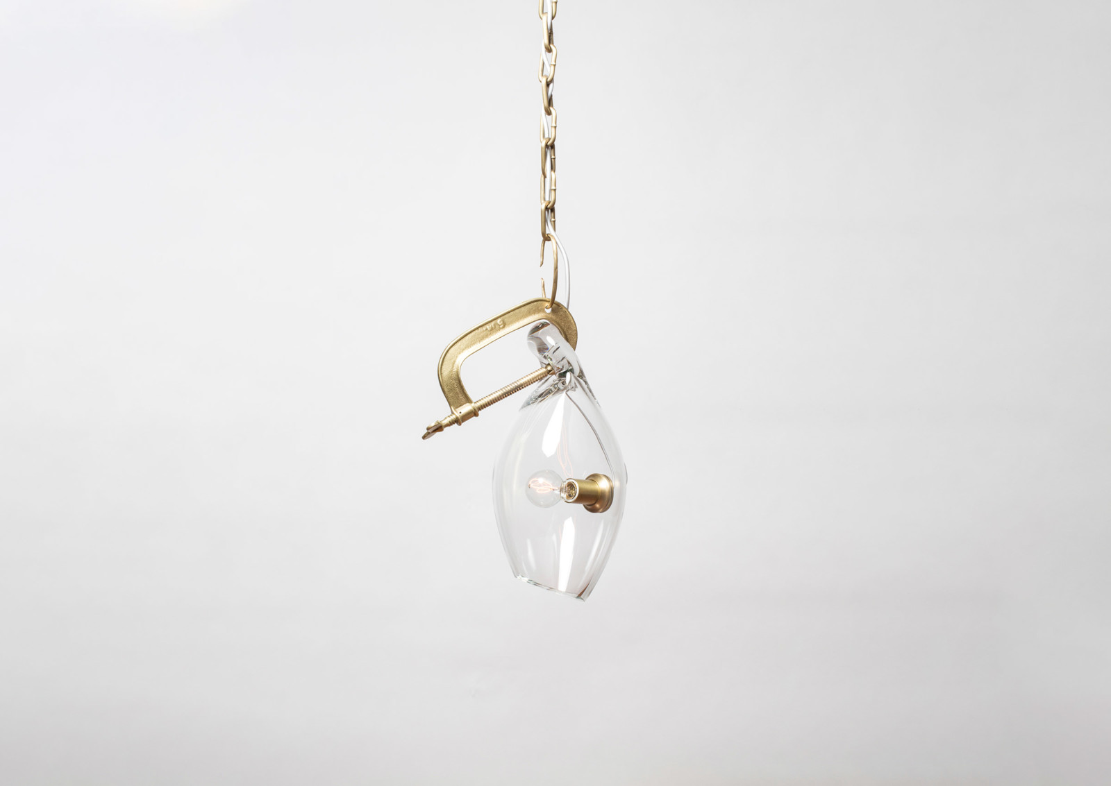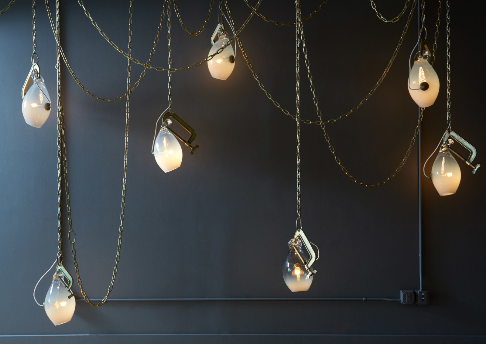 Lindsey Adelman collects old industrial clamps from manufacturers all over the United States and plates them in brass. Lead glassblower, Michiko Sakano, blows molten glass into each one and lets the form naturally slump, making each fixture truly unique.
