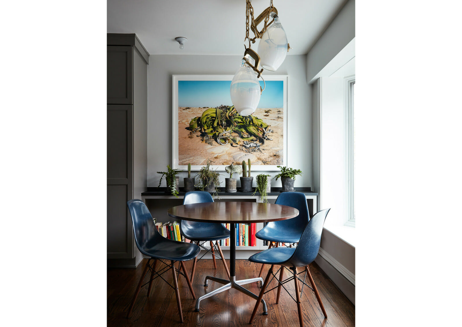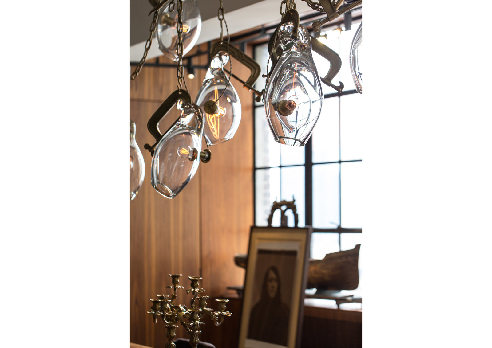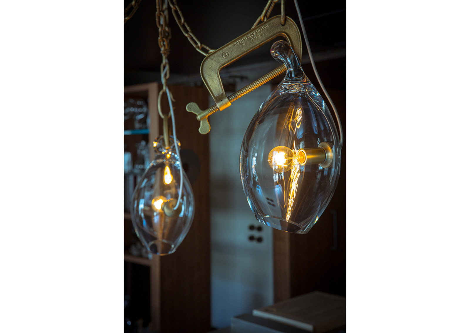 Lindsey Adelman collects old industrial clamps from manufacturers all over the United States and plates them in brass. Lead glassblower, Michiko Sakano, blows molten glass into each one and lets the form naturally slump, making each fixture truly unique.