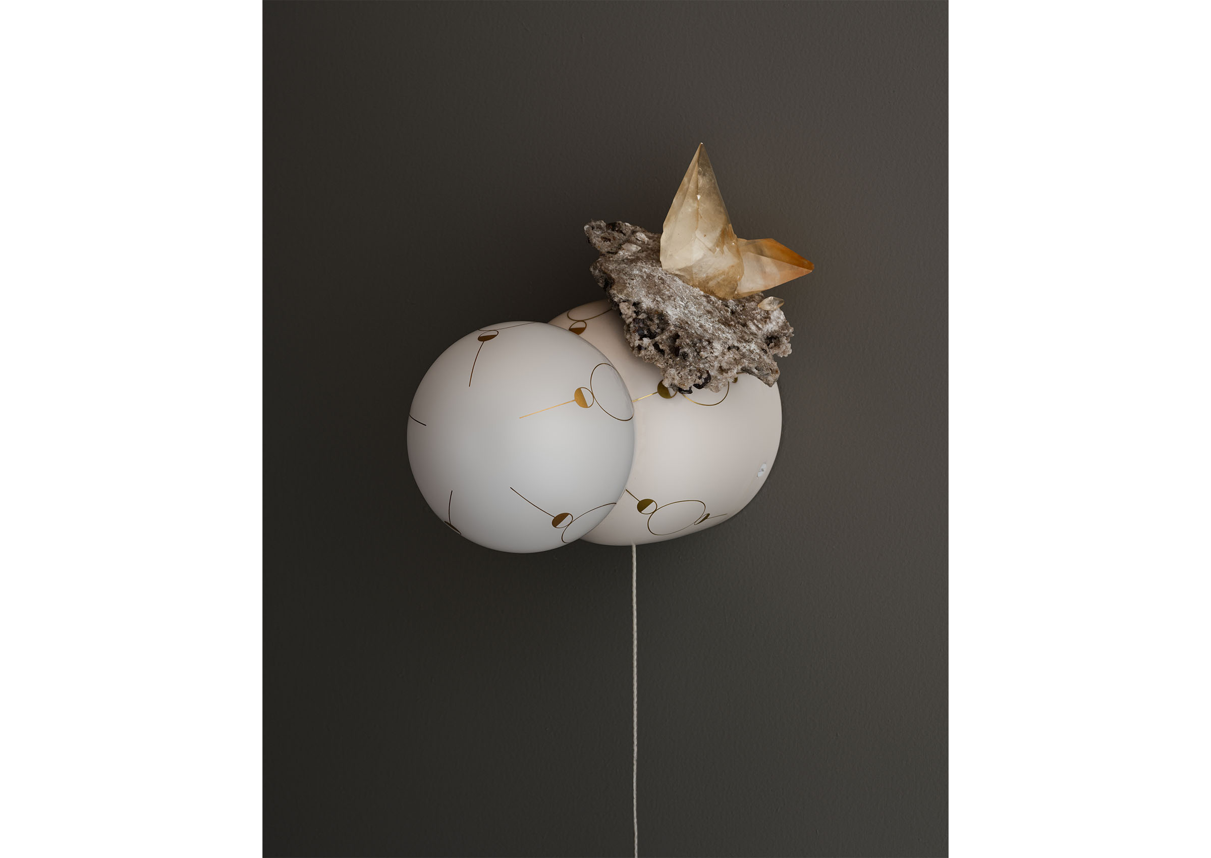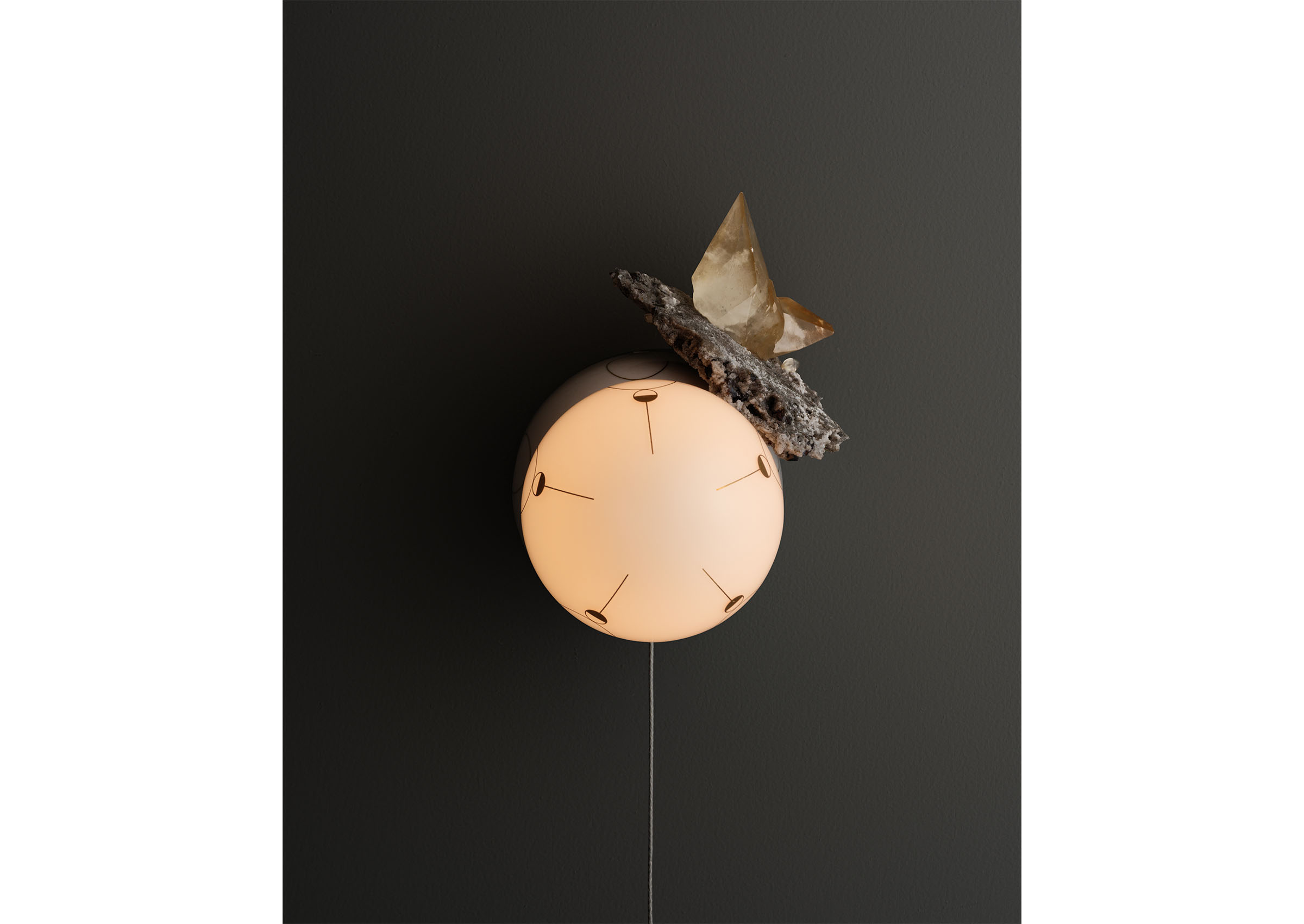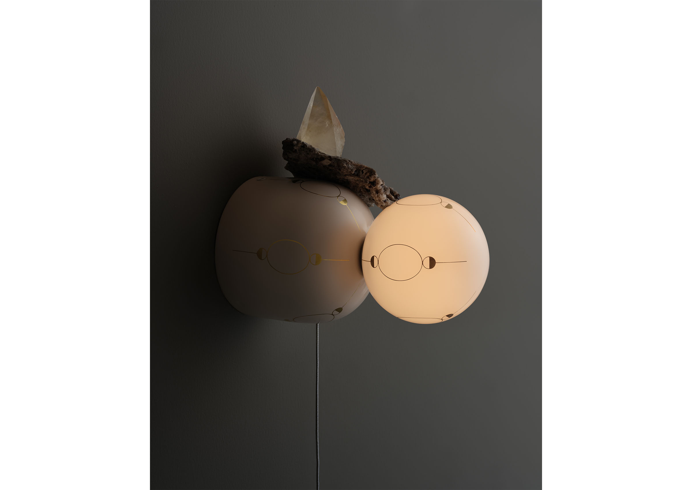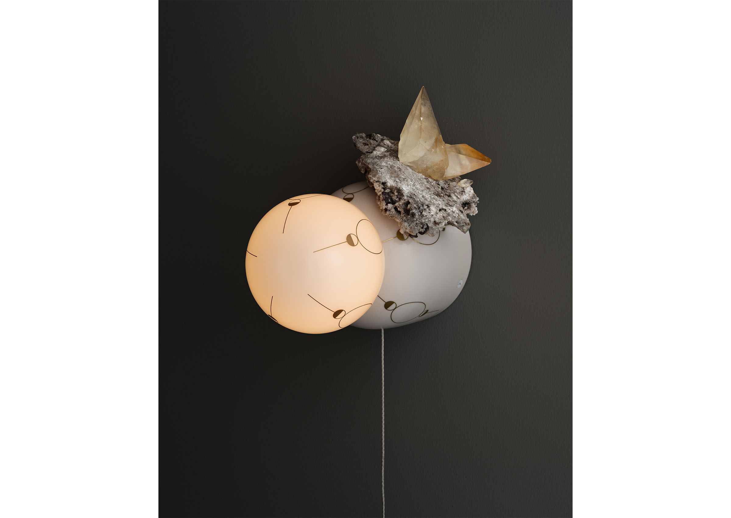 Hieros Gamos by Lindsey Adelman introduces a new body of illuminated mobiles created during the twentieth year of Lindsey Adelman Studio. Entering a more alchemical and mythic realm, the collection takes its title from the concept of sacred union: the joining of divine masculine and feminine energies, inner and outer worlds, and ancient and contemporary sensibilities. Comprising ten suspended mobiles and two sconces, each unique by nature. The mobiles are formed from a pared-back armature of metal tubing and coaxial cable supporting constellations of glass orbs and ceramic canopies inscribed with hand-drawn symbols in gold enamel. Every mobile incorporates minerals as both visual and symbolic anchors. Air currents set the compositions into gentle, continuous motion, transforming the atmosphere of a room. Neither literal nor prescriptive, Adelman’s symbols invite connection rather than interpretation. Hieros Gamos feels at once ancient and immediate, an elegant synthesis of technical mastery and spiritual inquiry designed to protect, uplift, and expand our sense of the unseen.