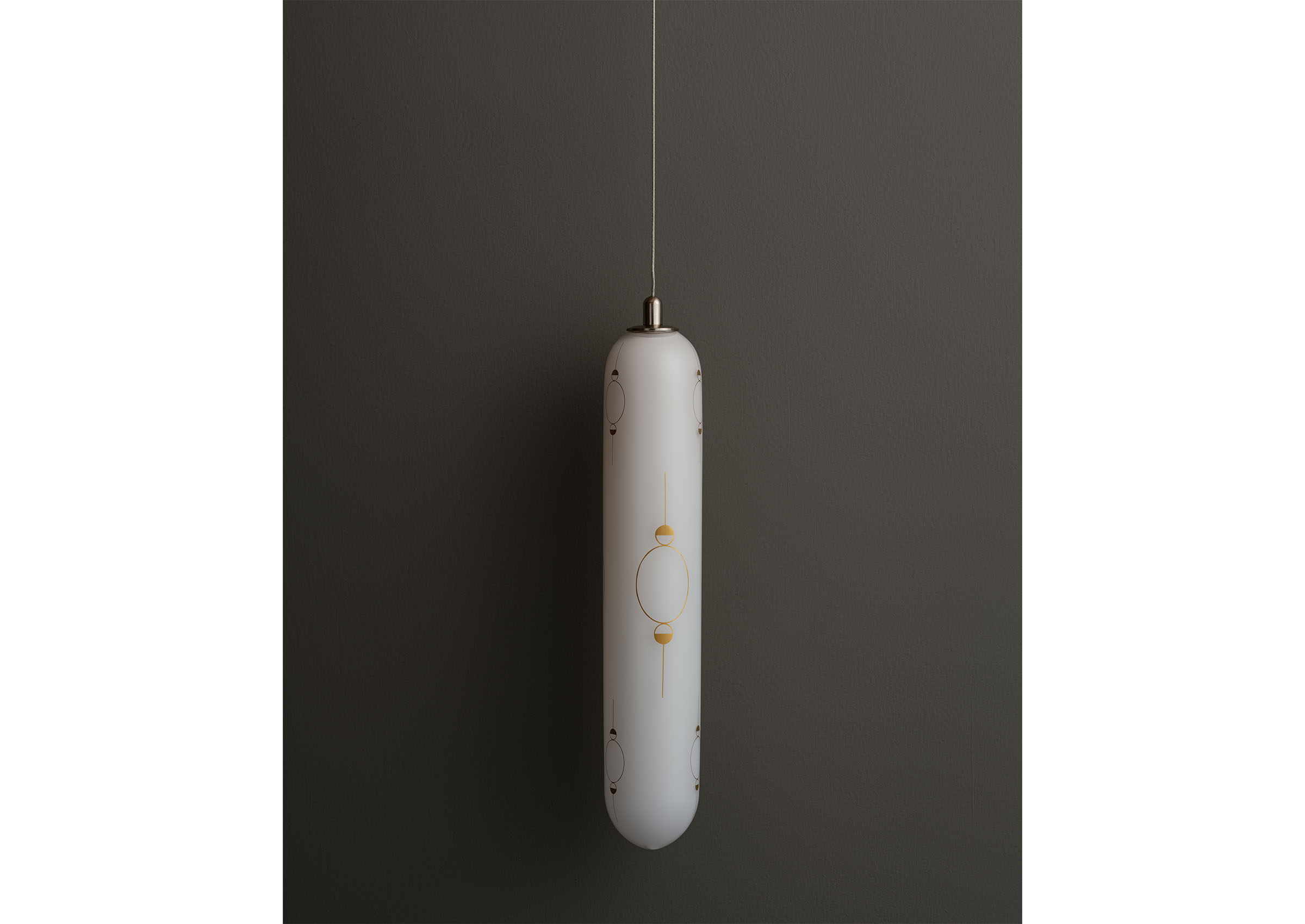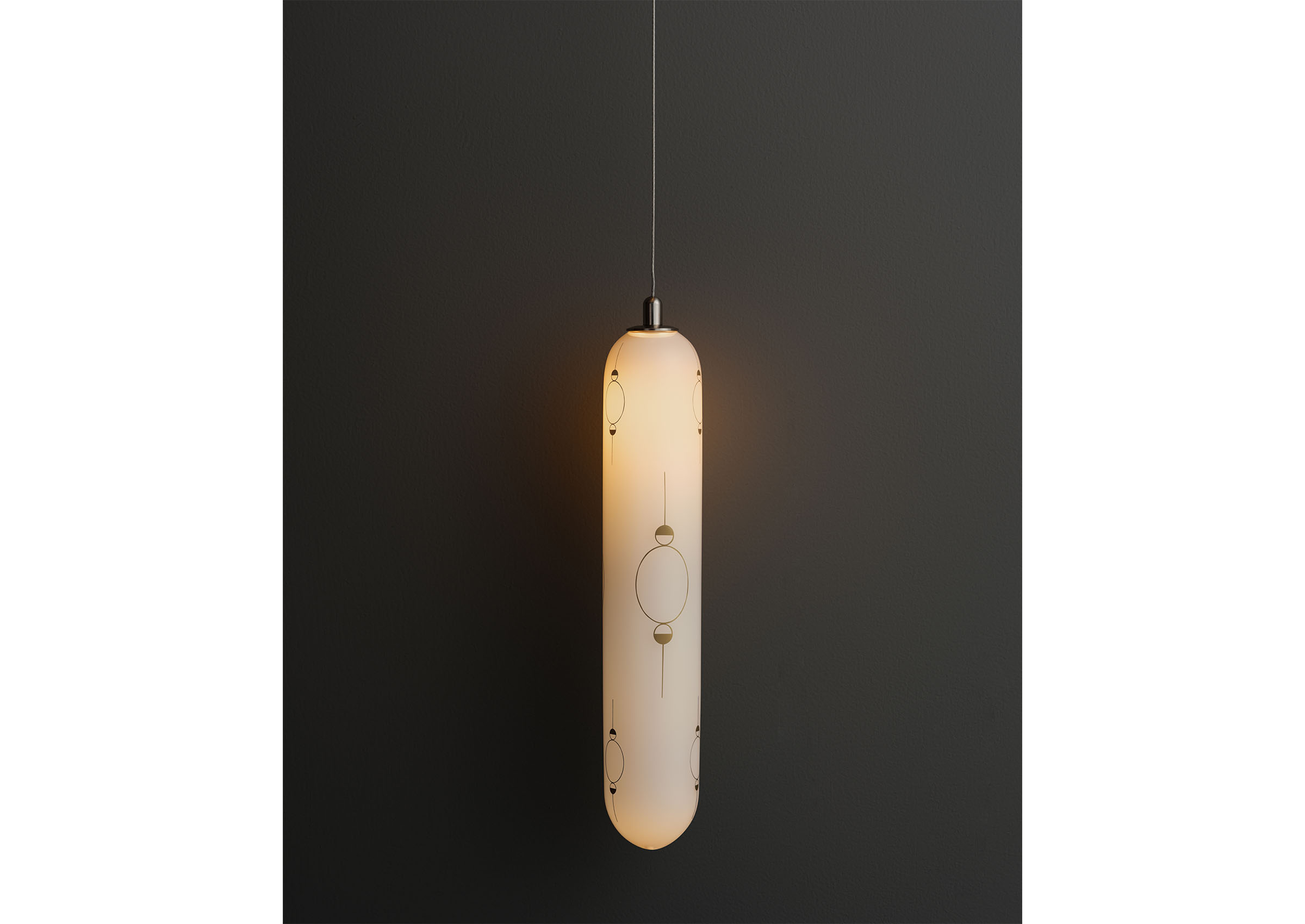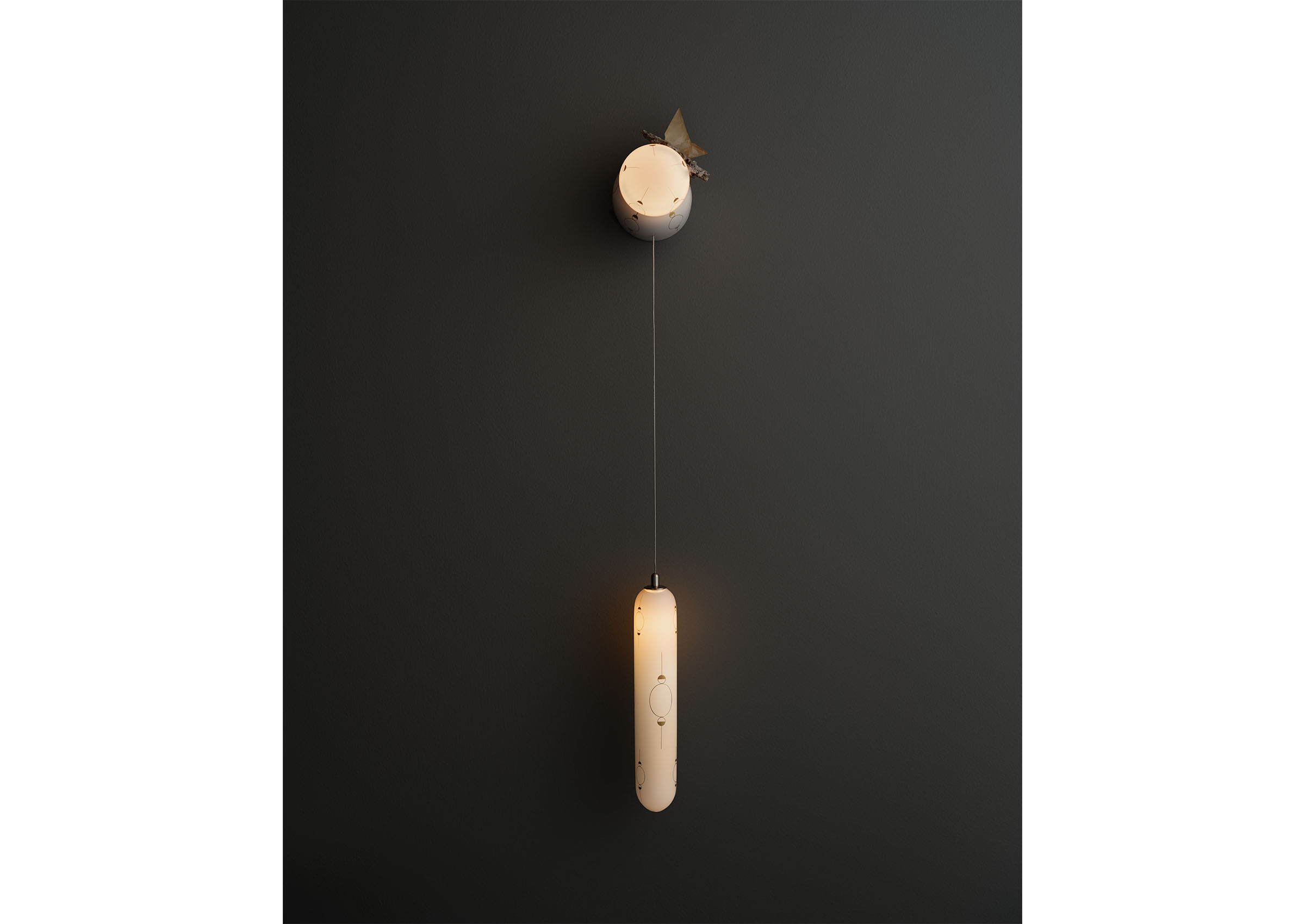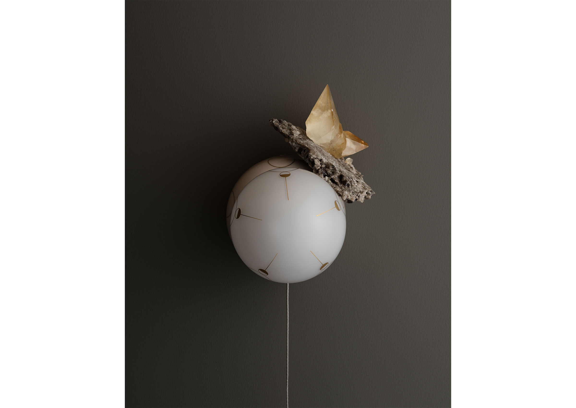 Hieros Gamos by Lindsey Adelman introduces a new body of illuminated mobiles created during the twentieth year of Lindsey Adelman Studio. Entering a more alchemical and mythic realm, the collection takes its title from the concept of sacred union: the joining of divine masculine and feminine energies, inner and outer worlds, and ancient and contemporary sensibilities. Comprising ten suspended mobiles and two sconces, each unique by nature. The mobiles are formed from a pared-back armature of metal tubing and coaxial cable supporting constellations of glass orbs and ceramic canopies inscribed with hand-drawn symbols in gold enamel. Every mobile incorporates minerals as both visual and symbolic anchors. Air currents set the compositions into gentle, continuous motion, transforming the atmosphere of a room. Neither literal nor prescriptive, Adelman’s symbols invite connection rather than interpretation. Hieros Gamos feels at once ancient and immediate, an elegant synthesis of technical mastery and spiritual inquiry designed to protect, uplift, and expand our sense of the unseen.
