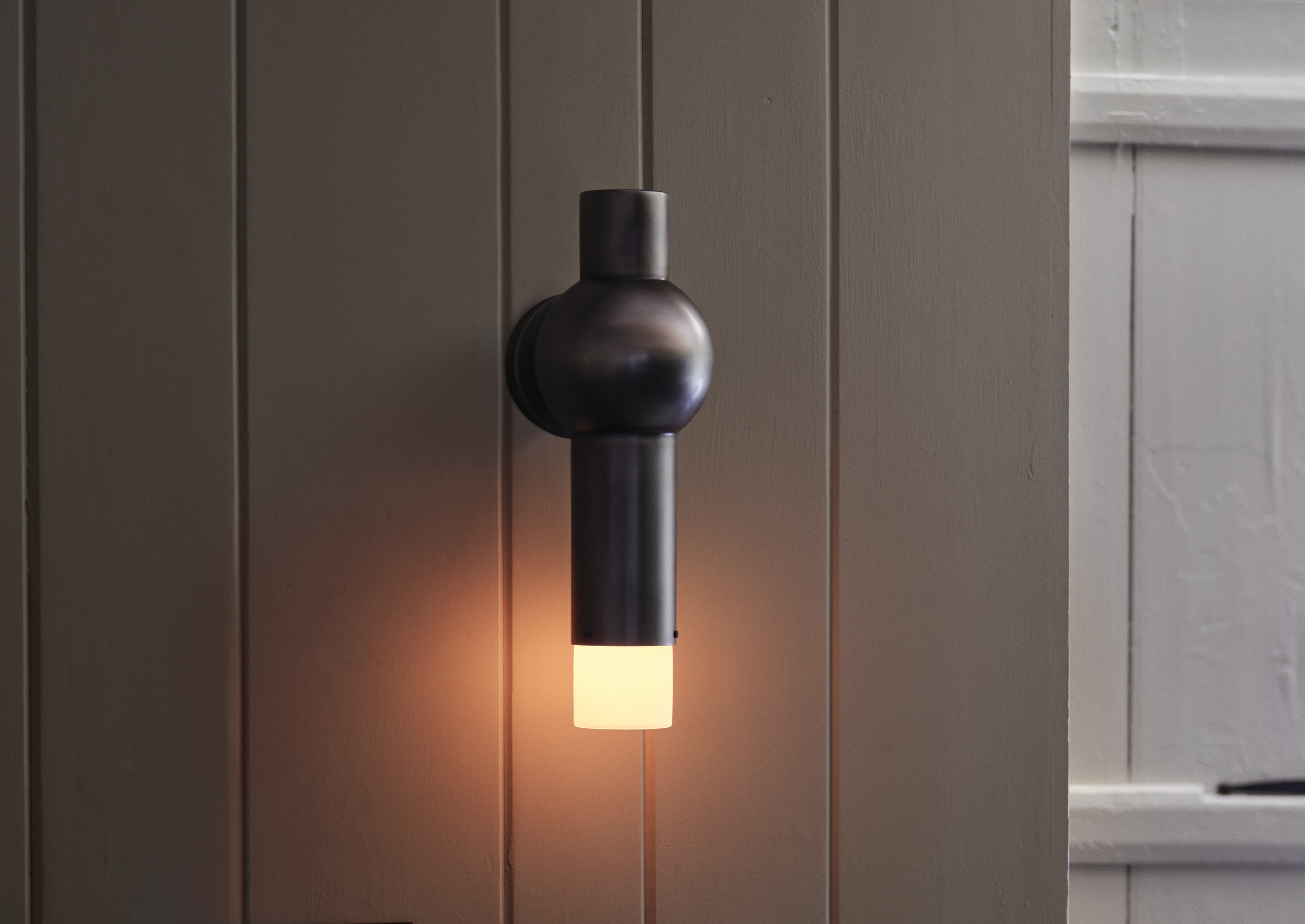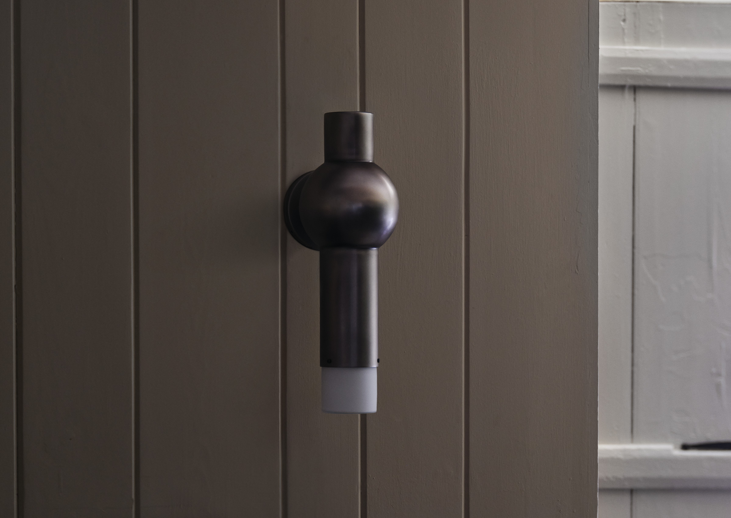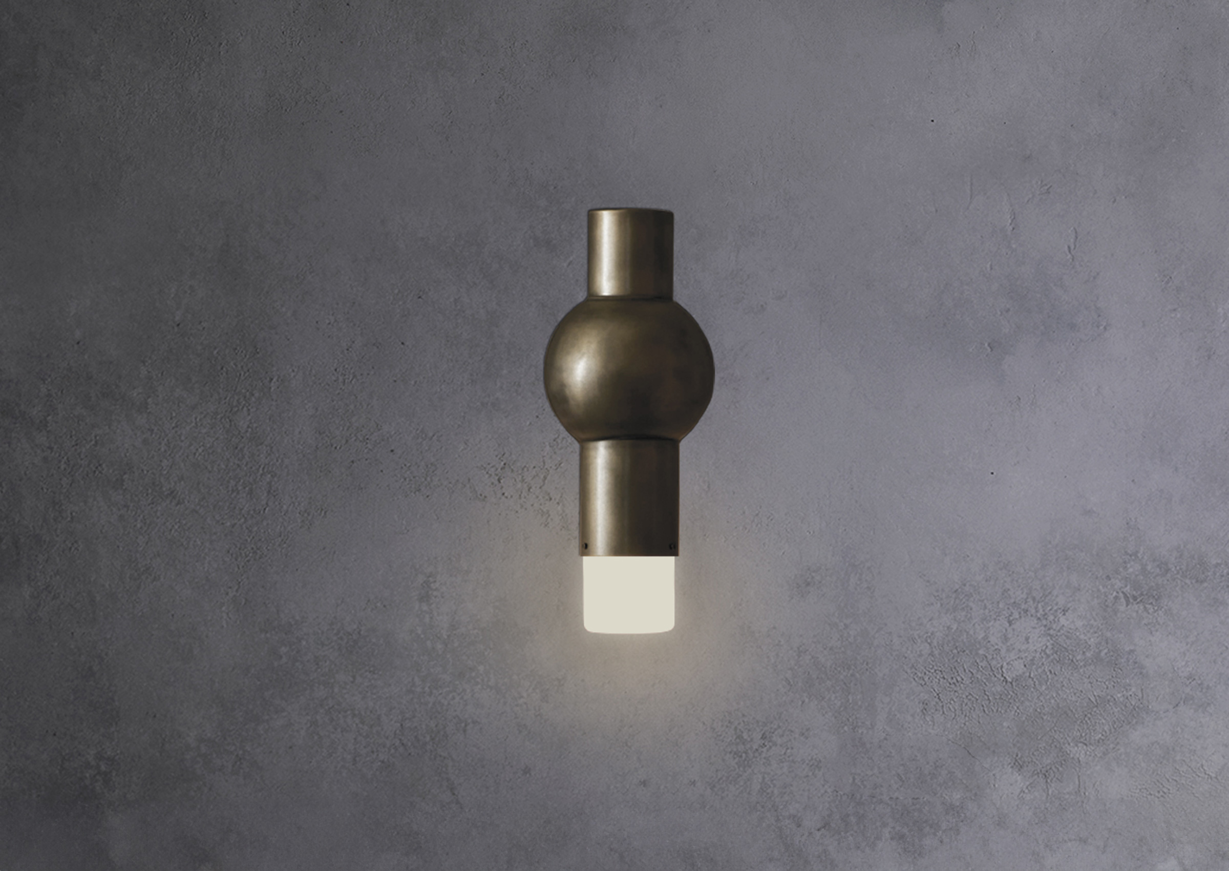The Lantern Sconce presents a finely balanced form with a hand-finished antique brass patina, accompanied by a frosted glass diffuser. The Lantern Sconce provides a warm glow and a unique moment of interest wherever it is placed.